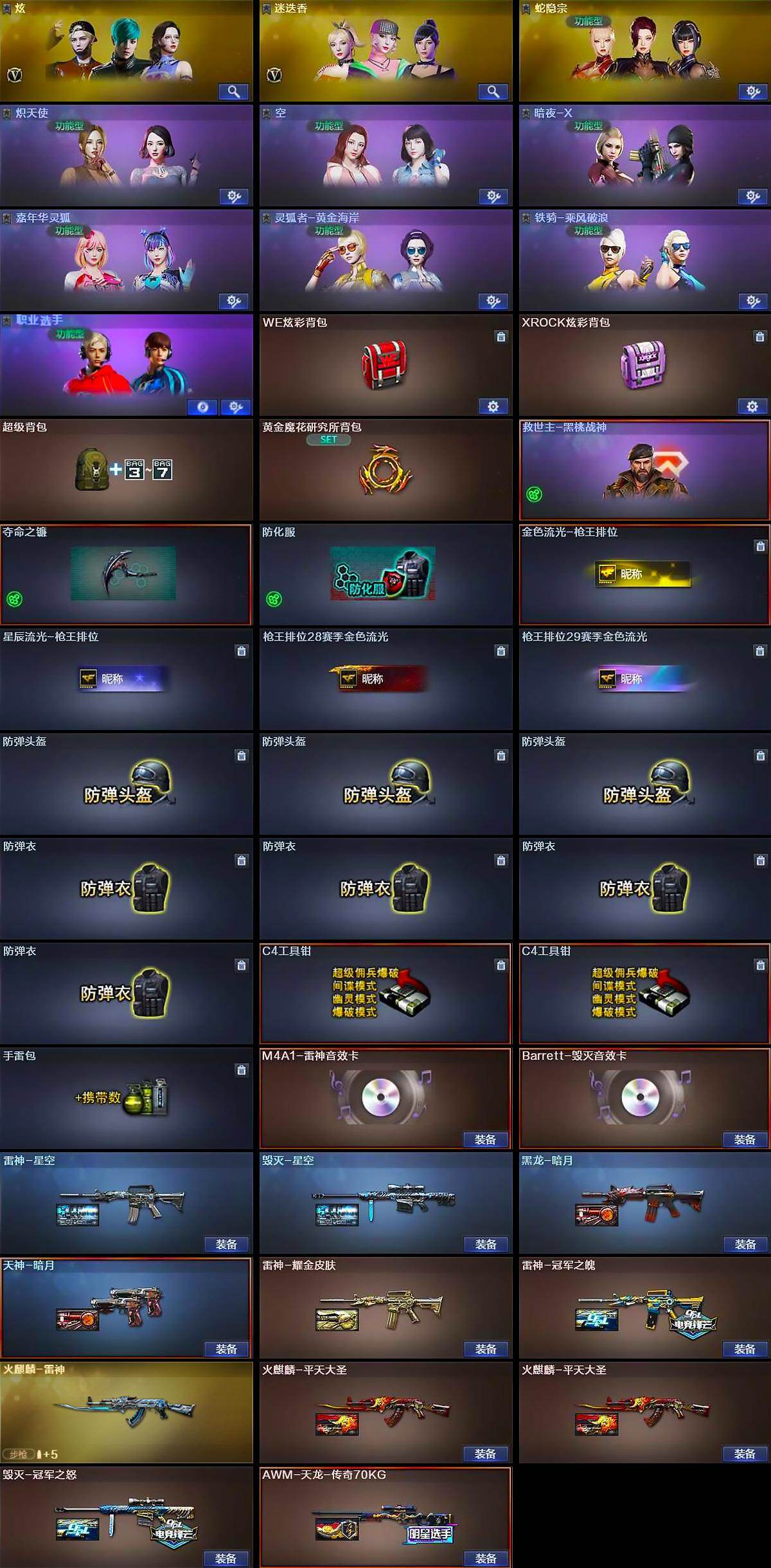 【皮肤】:雷神-星空,雷神-耀金皮肤,雷神-冠军之魄,火麒麟-雷神,火麒麟-平天大圣*2,毁灭-星空,毁灭-冠军之怒,黑龙-暗月,AWM-天龙-传奇70KG,天神-暗月