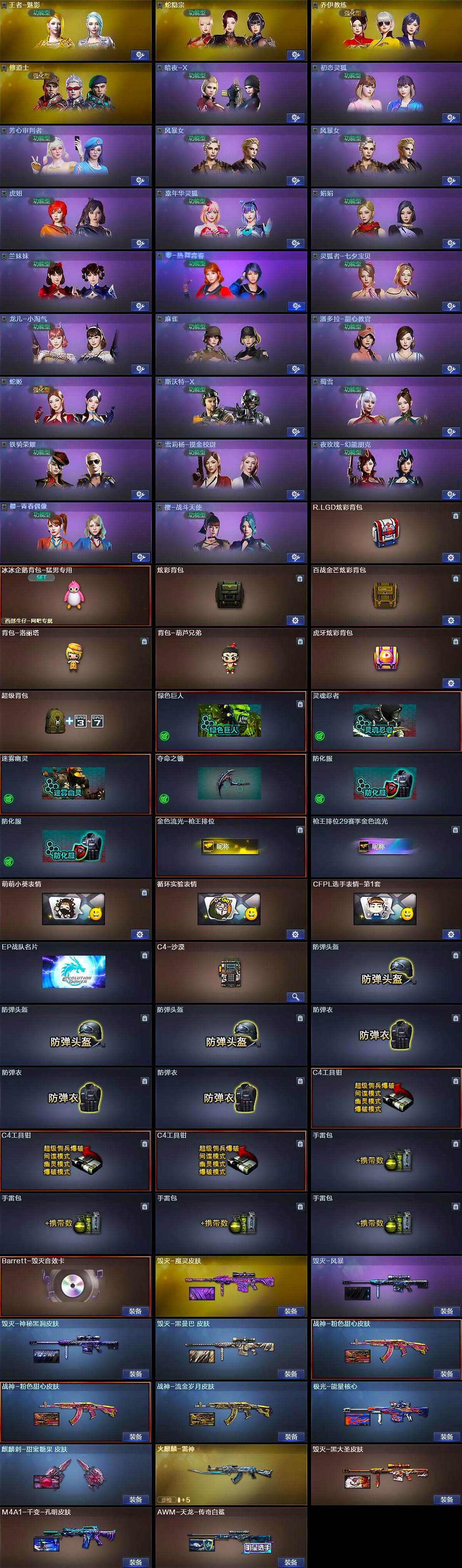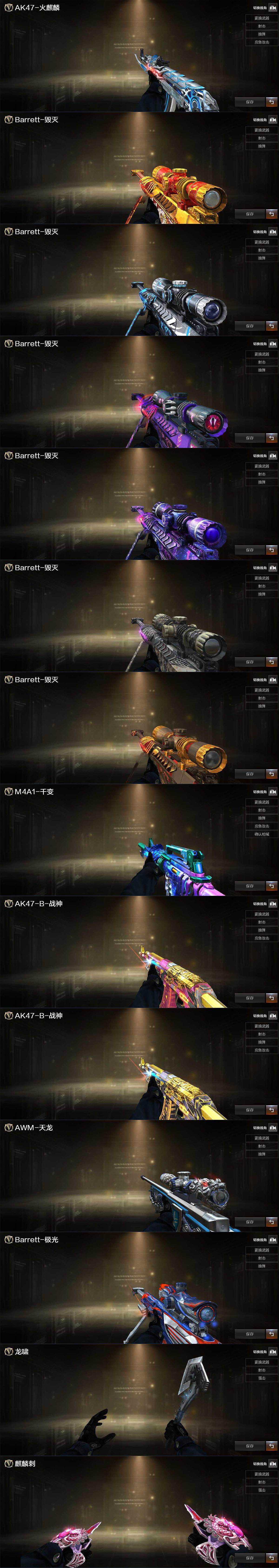 【皮肤】:火麒麟-雷神,毁灭-黑大圣皮肤,毁灭-风暴,毁灭-魔灵皮肤,毁灭-神秘黑洞皮肤,毁灭-黑曼巴 皮肤,毁灭-英雄计划 皮肤,M4A1-千变-孔明皮肤,战神-粉色甜心皮肤*2,战神-流金岁月皮肤,A