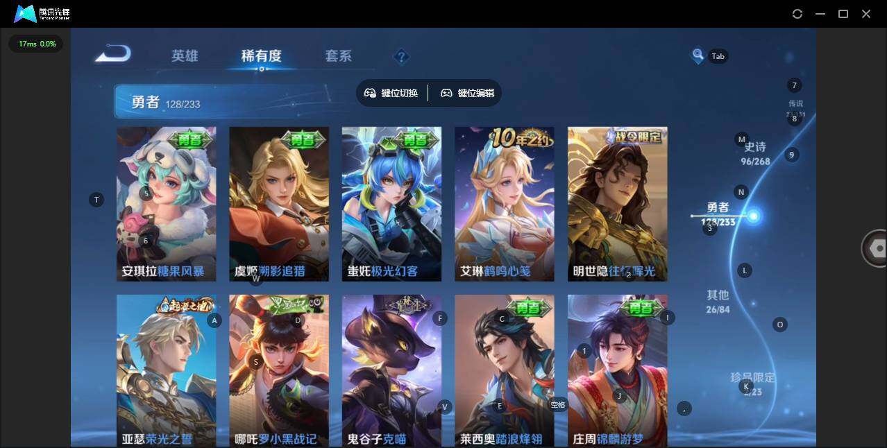 实名: 可修改 贵族等级: V8 英雄数: 128 皮肤数: 276 荣耀水晶