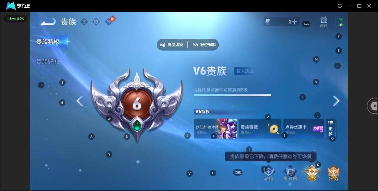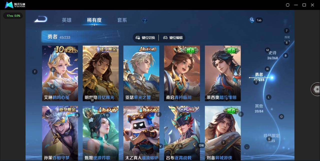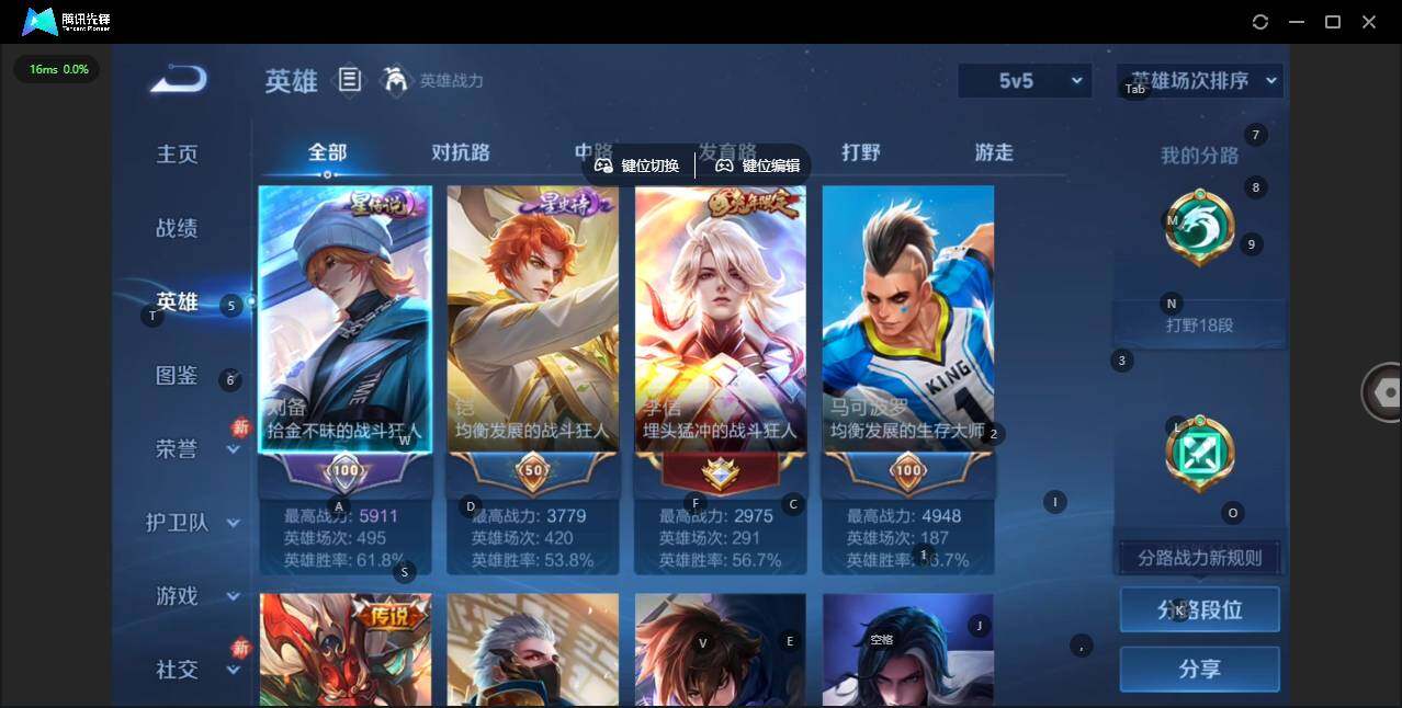 贵族等级: V6 英雄数: 115 皮肤数: 99 传说皮: 黄金狮子座,一念神魔,仲夏夜之梦,时之恋人-刘备,山海·炽霜斩,典韦战鼓燎原,神树通天 限定皮: 美猴王,逐霄战戟