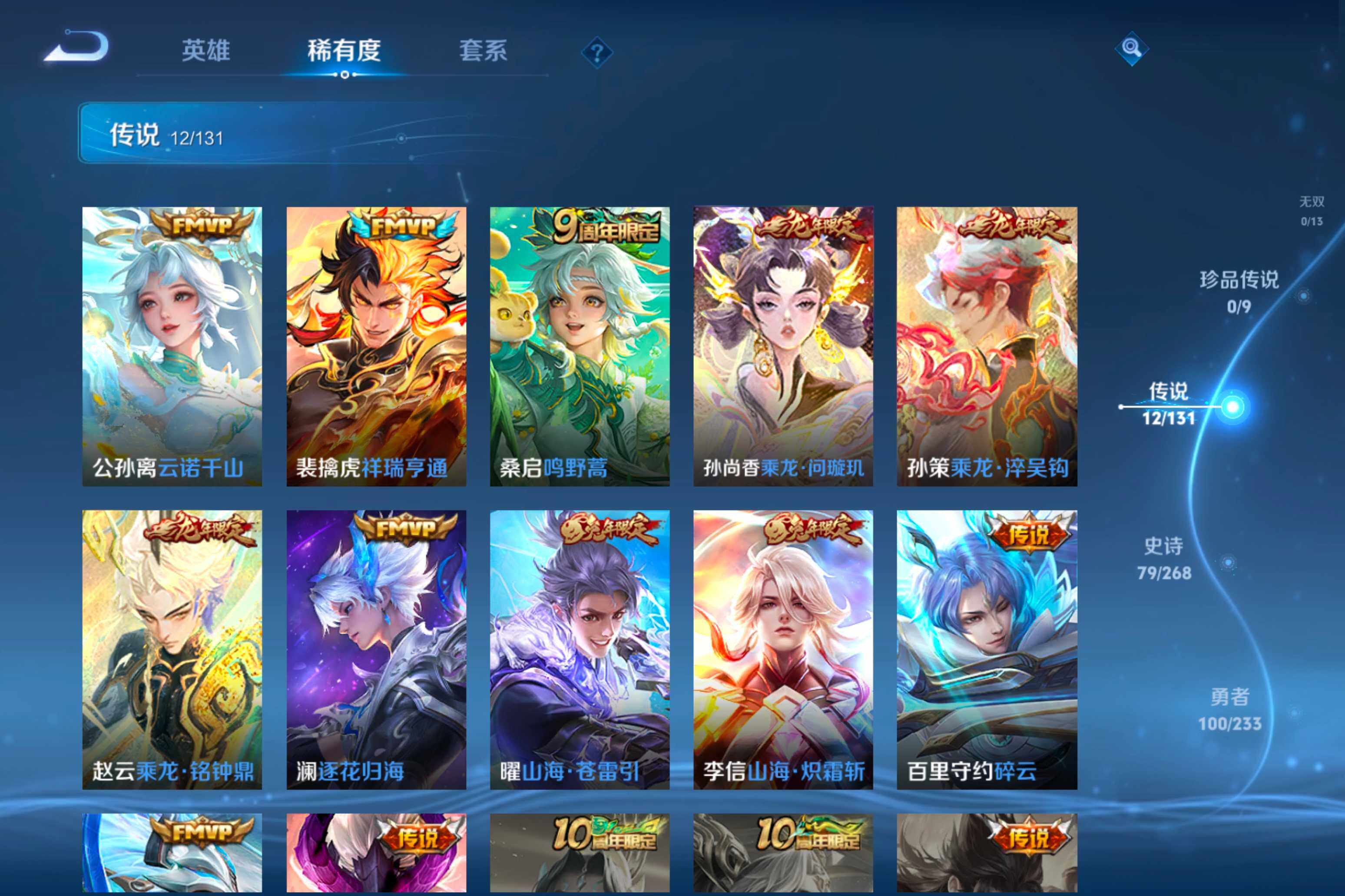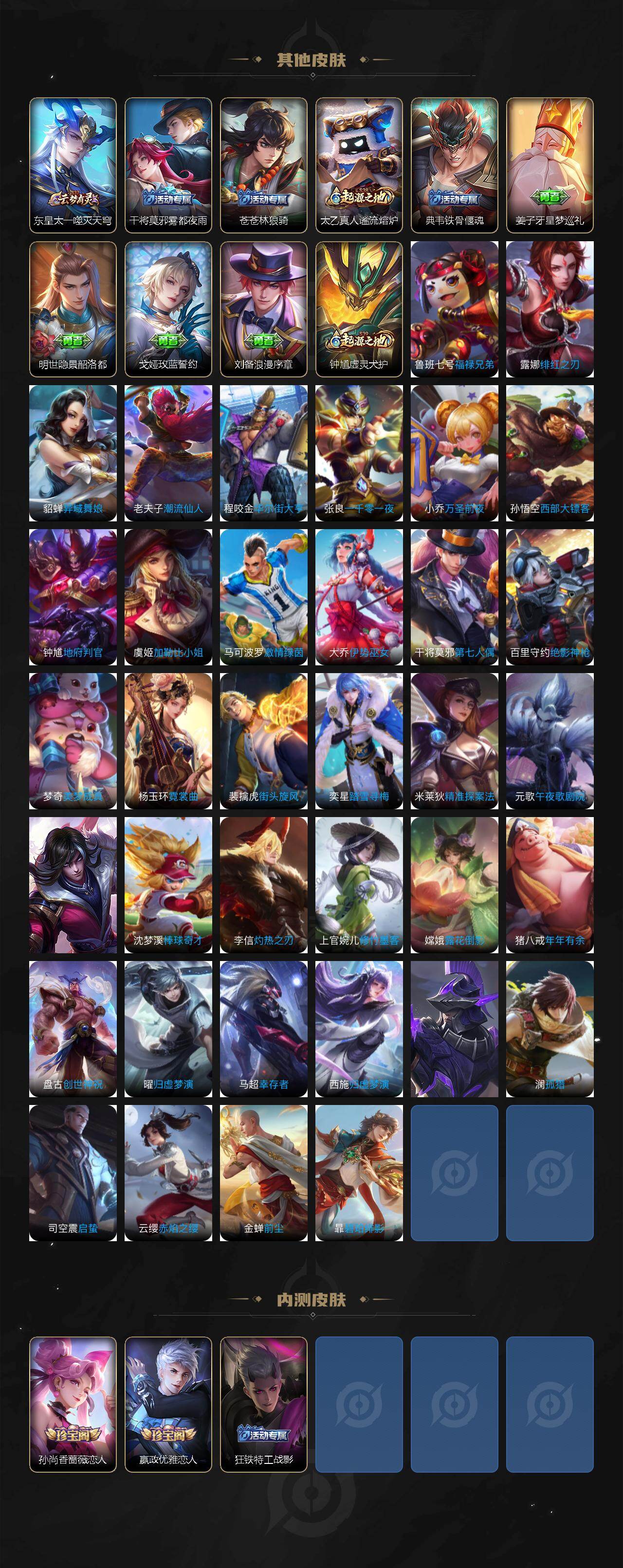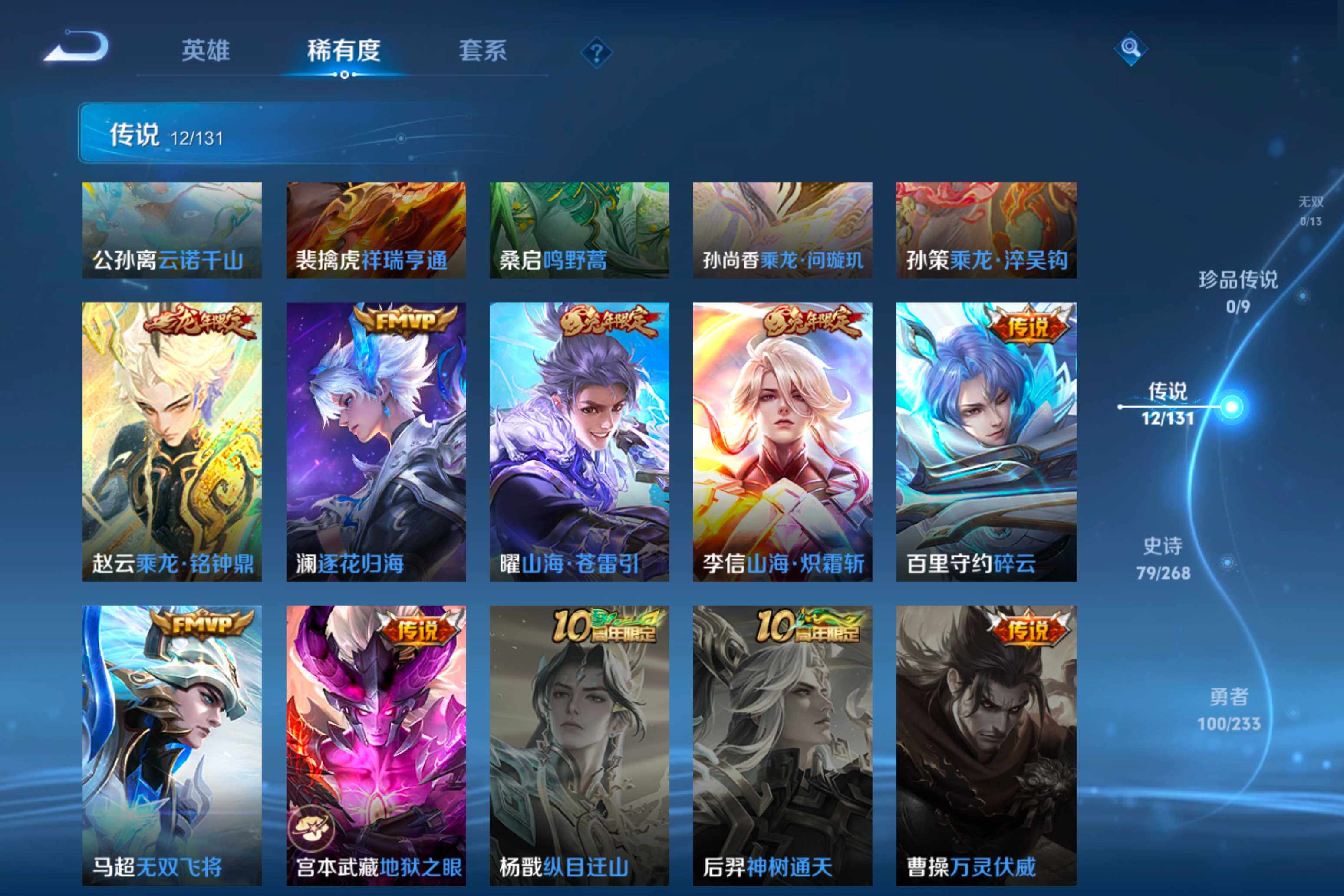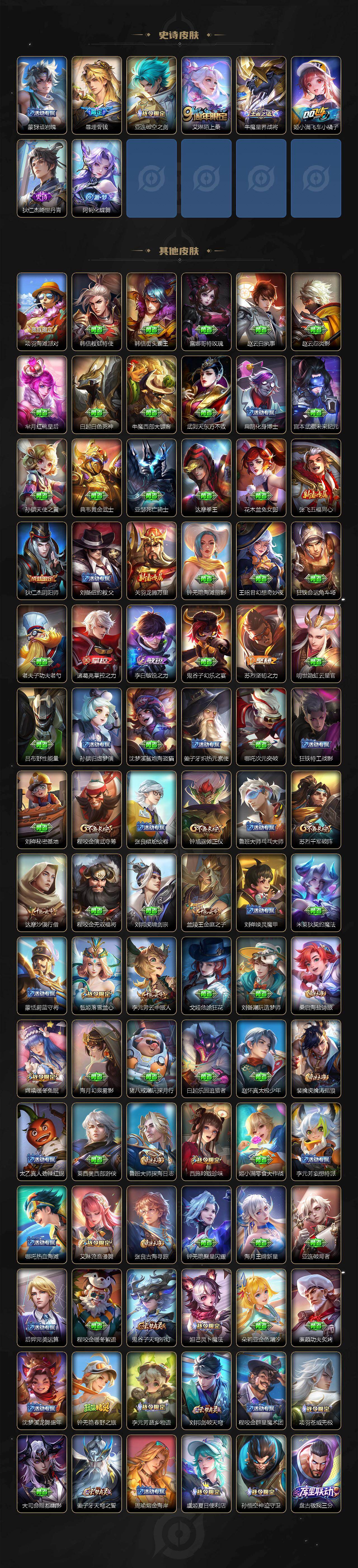 【传说皮肤】:公孙离云诺千山,裴擒虎祥瑞亨通,桑启鸣野蒿,孙尚香乘龙问璇玑,孙策乘龙淬吴钩,赵云乘龙铭钟鼎,澜逐花归海,曜山海苍雷引,李信山海炽霜斩,百里守约碎云,马超无双飞将,宫本武藏地狱之眼