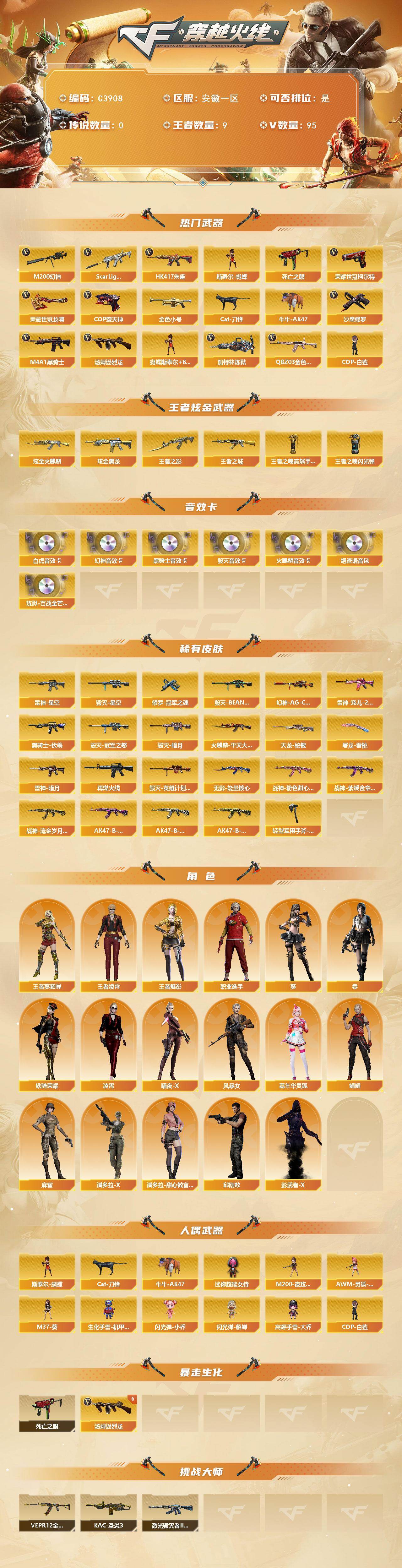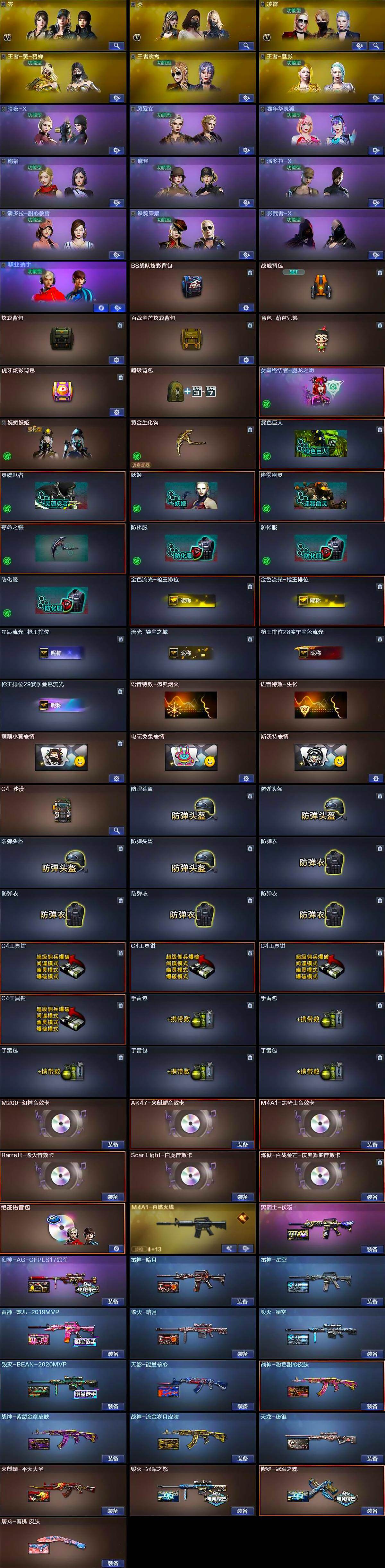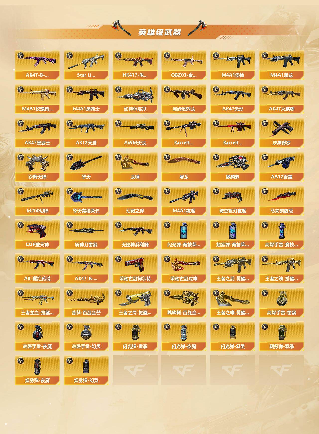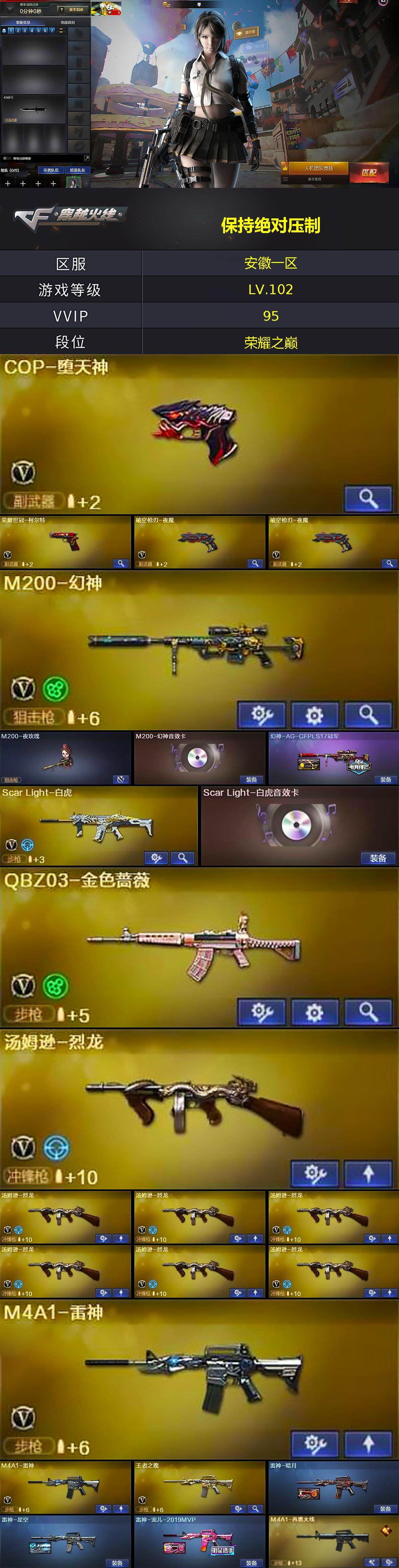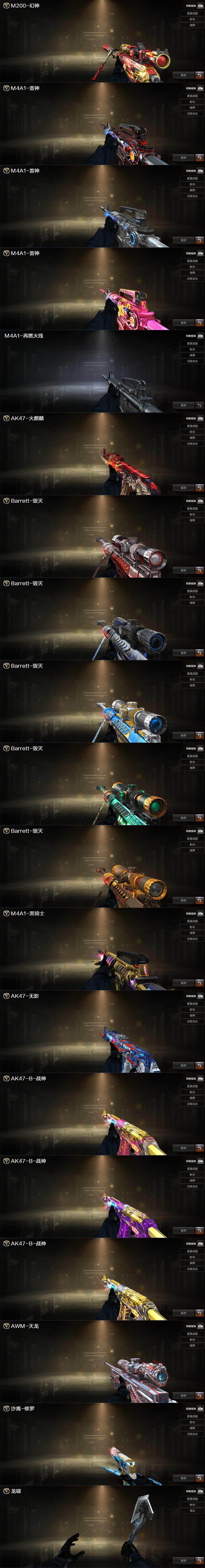 【热门武器】:QBZ03-金色蔷薇,Scar Light-白虎,HK417-朱雀,M200-幻神,死亡之眼,荣耀世冠-柯尔特,金色小号,Cat-刀锋,牛牛-AK47,M4A1-黑骑士,汤姆逊-烈龙*7,加特林-炼狱,斯泰尔-蝴蝶,COP-白鲨,COP-堕天神,沙鹰-修罗*2,荣耀世冠-龙啸