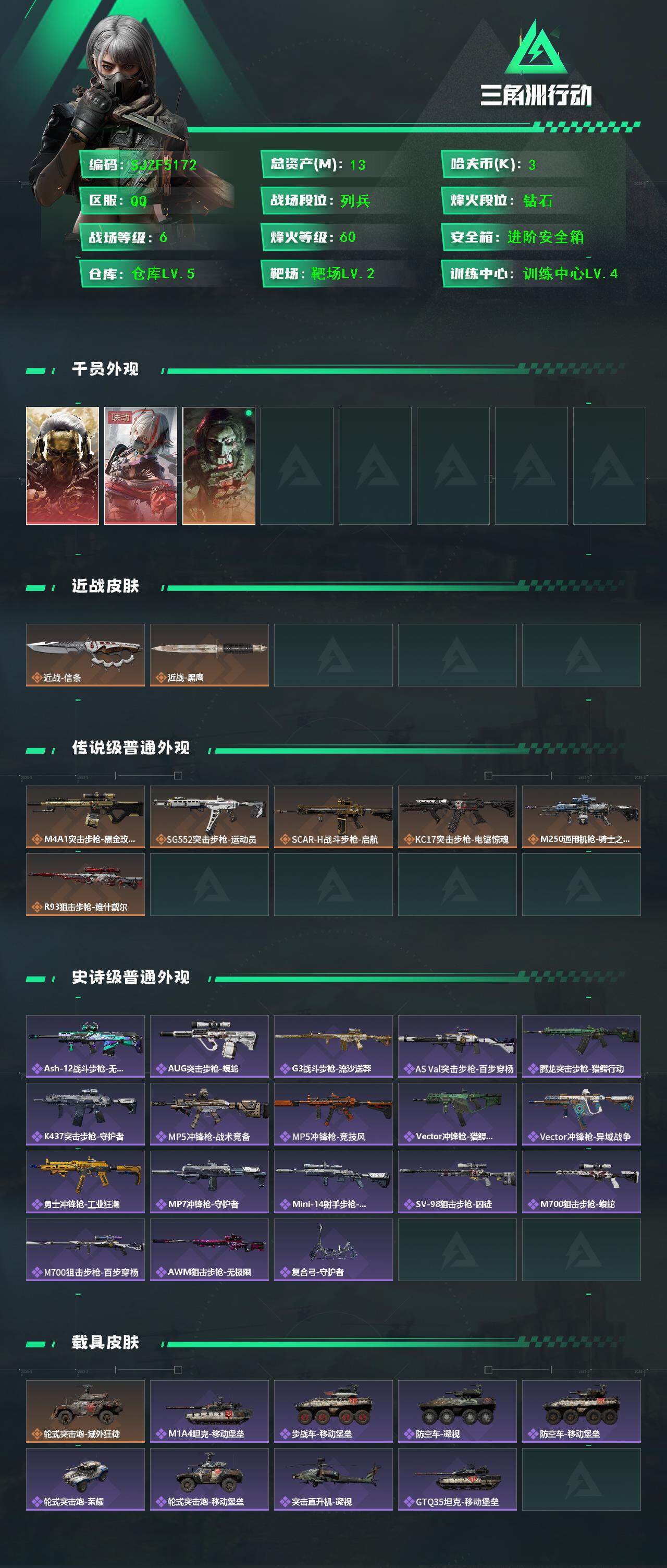 【SJZF5172】总资产(M):13M/哈夫币(K):3K/哈夫币(K):3K/传说枪皮数:6/全面战场等级:6_段位:列兵/烽火地带等级:60_段位:钻石/红狼-蚀金玫瑰/骇爪-维什戴尔/红狼-电锯惊魂/近战-信条/近战-黑鹰/M4A1突击步枪-蚀金玫瑰/SG552突击步枪-运动员/SCAR-H战斗步枪-启航/KC17突击步枪-电锯惊魂/M250通用机枪-骑士之心/R93狙击步枪-维什戴尔/ASh-12战斗步枪-无极限/AUG突击步枪-蝮蛇/G3战斗步枪-流沙送葬/AS Val突击步枪-百步