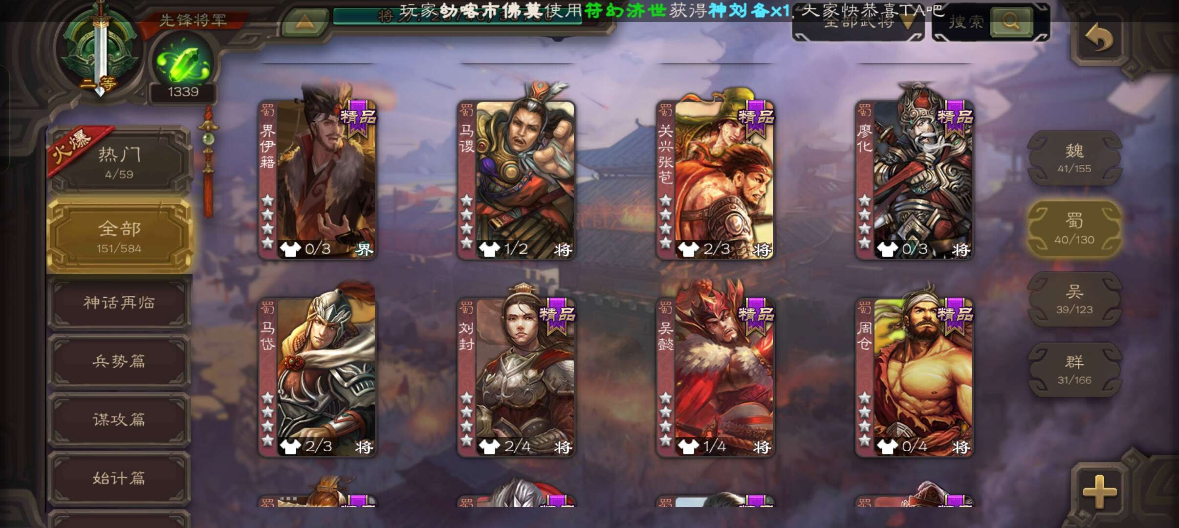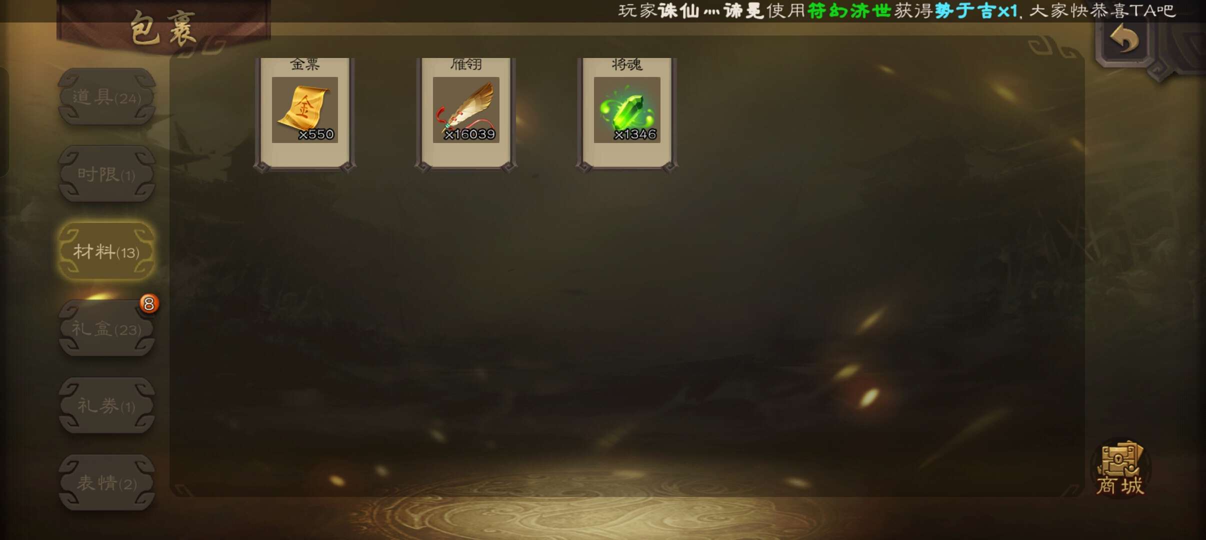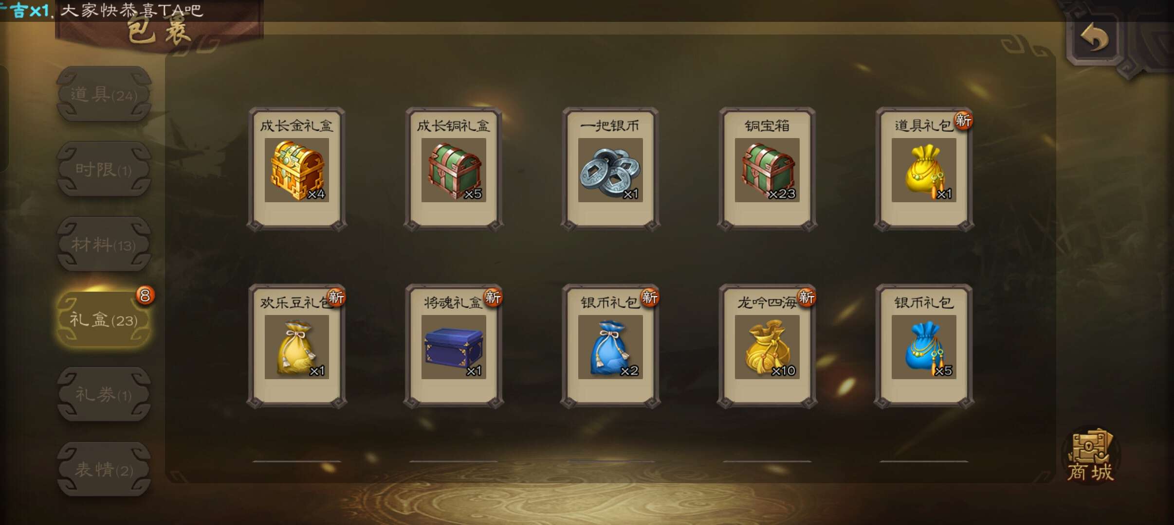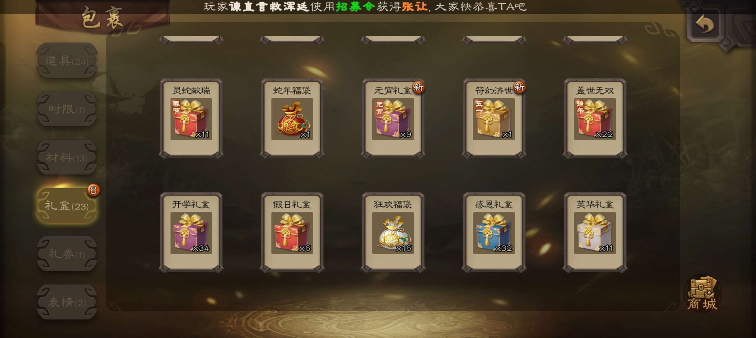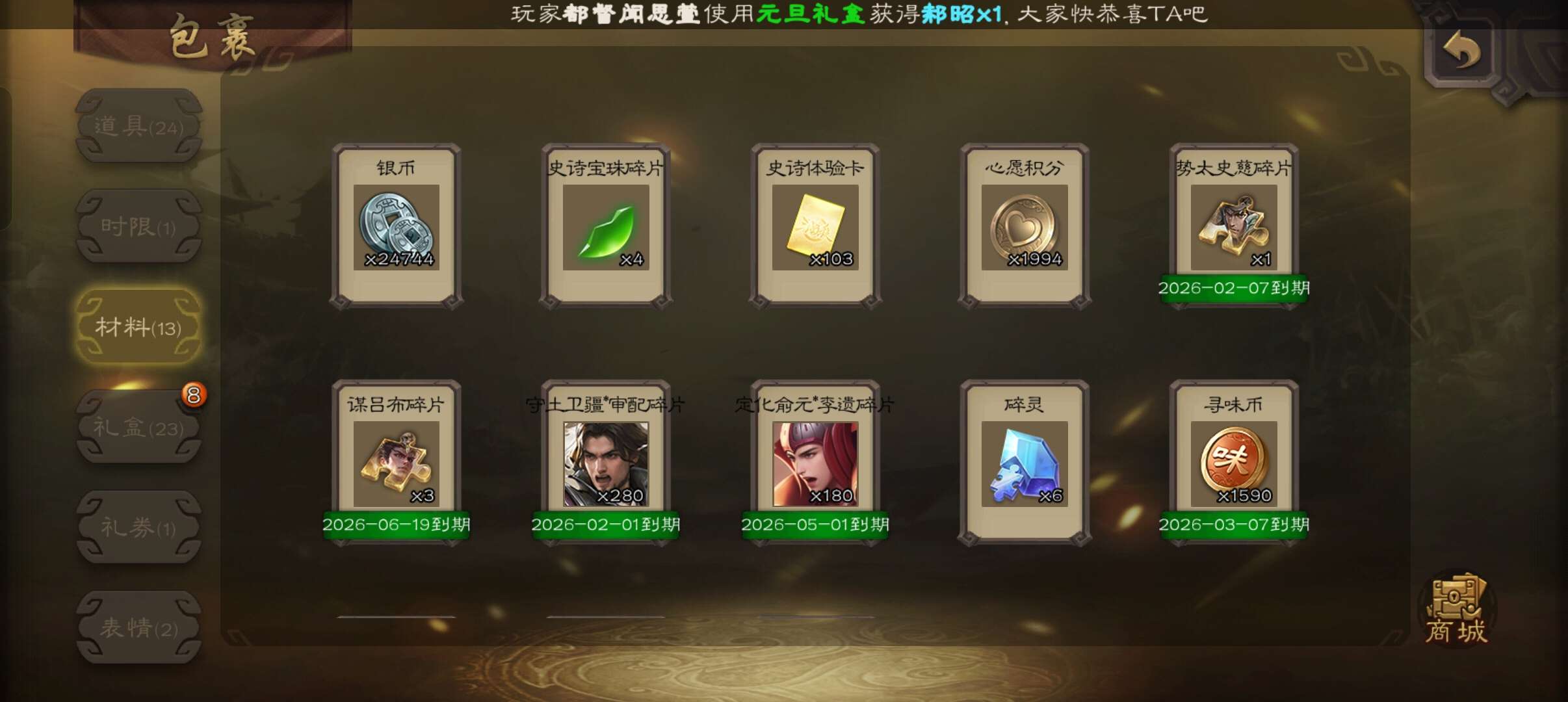 3动皮。4史诗武将,4星谋黄月英。马元义快出来了。多材料多盒子