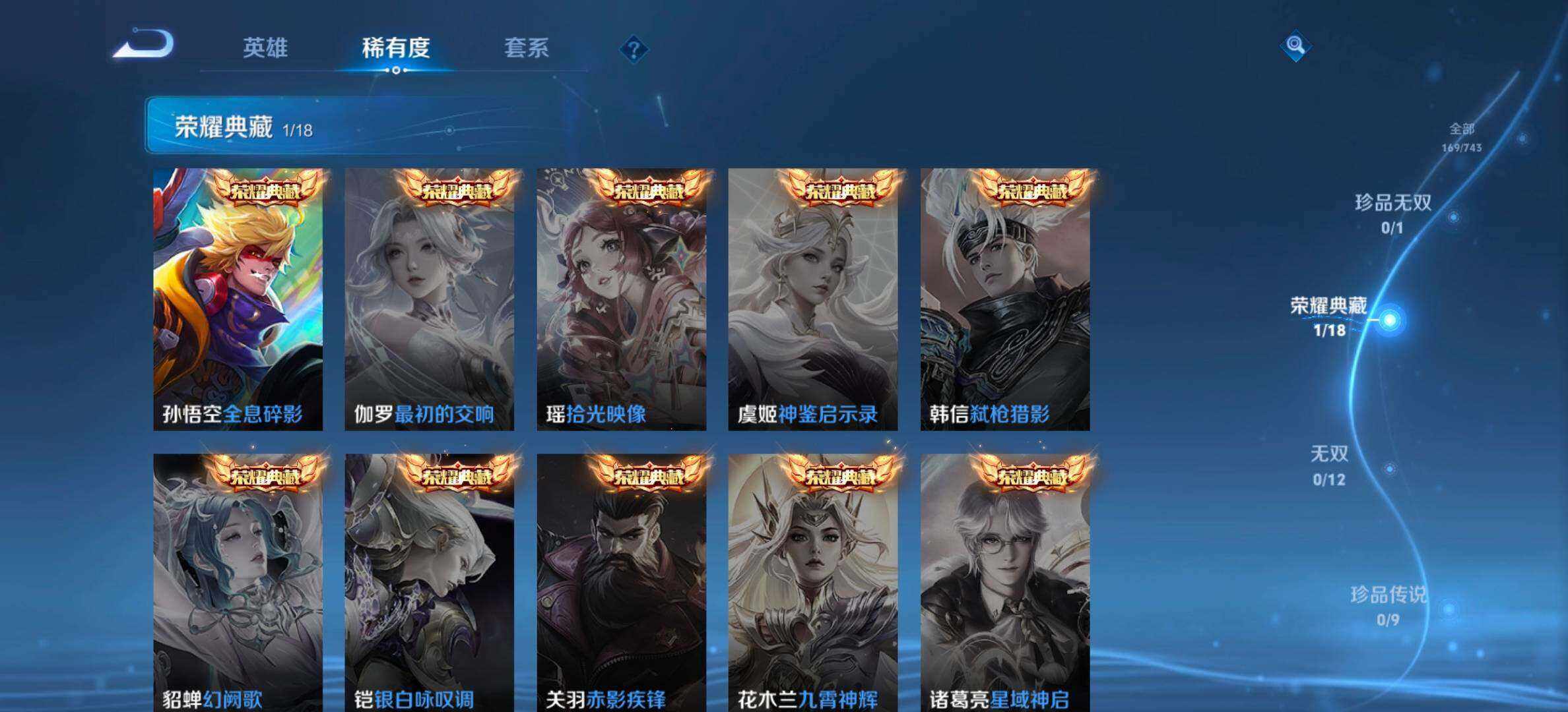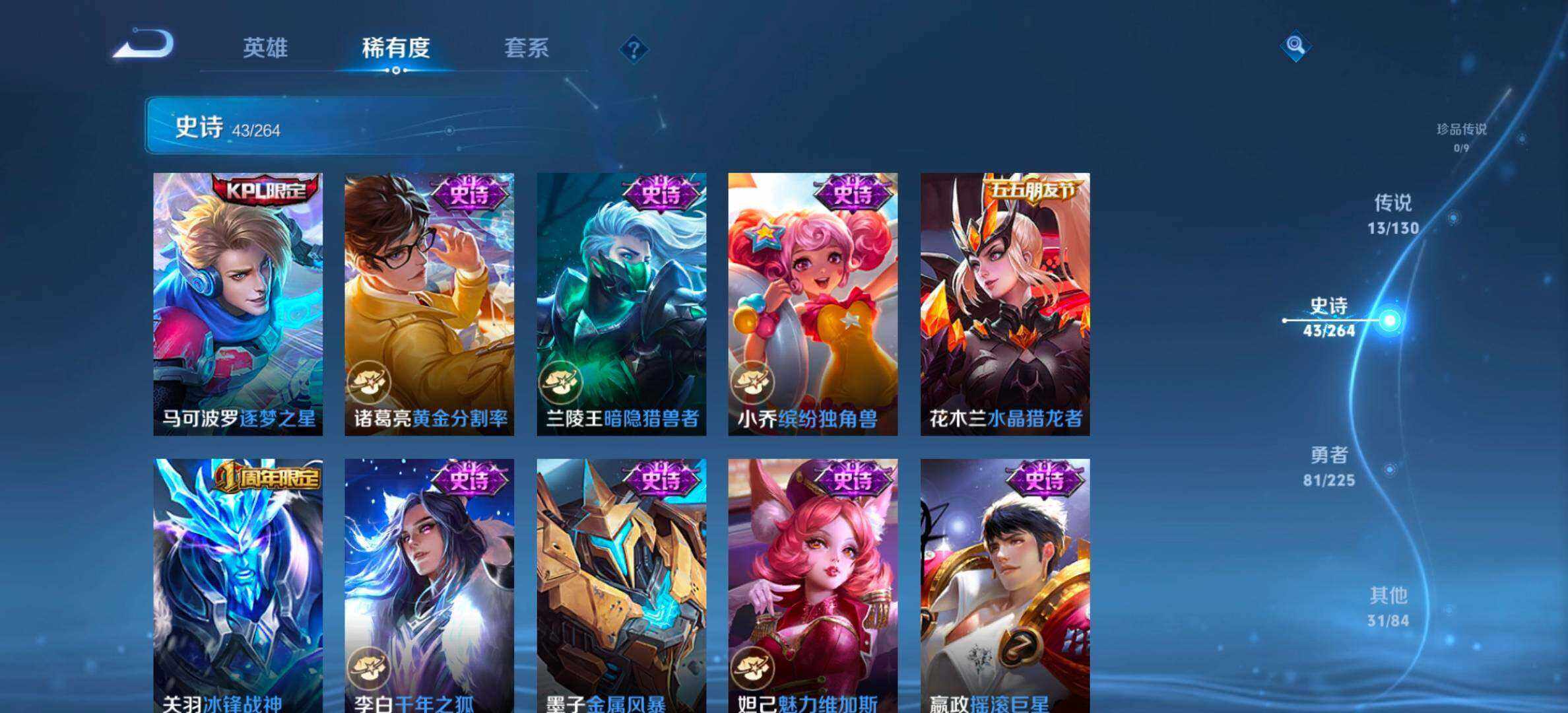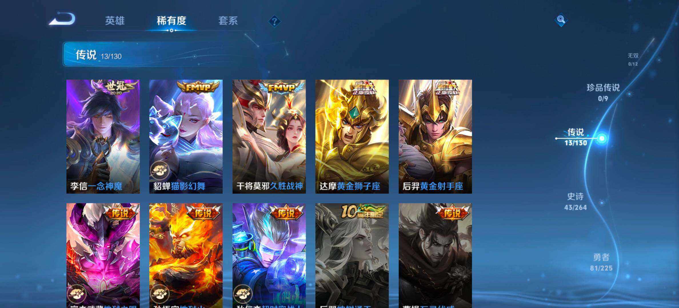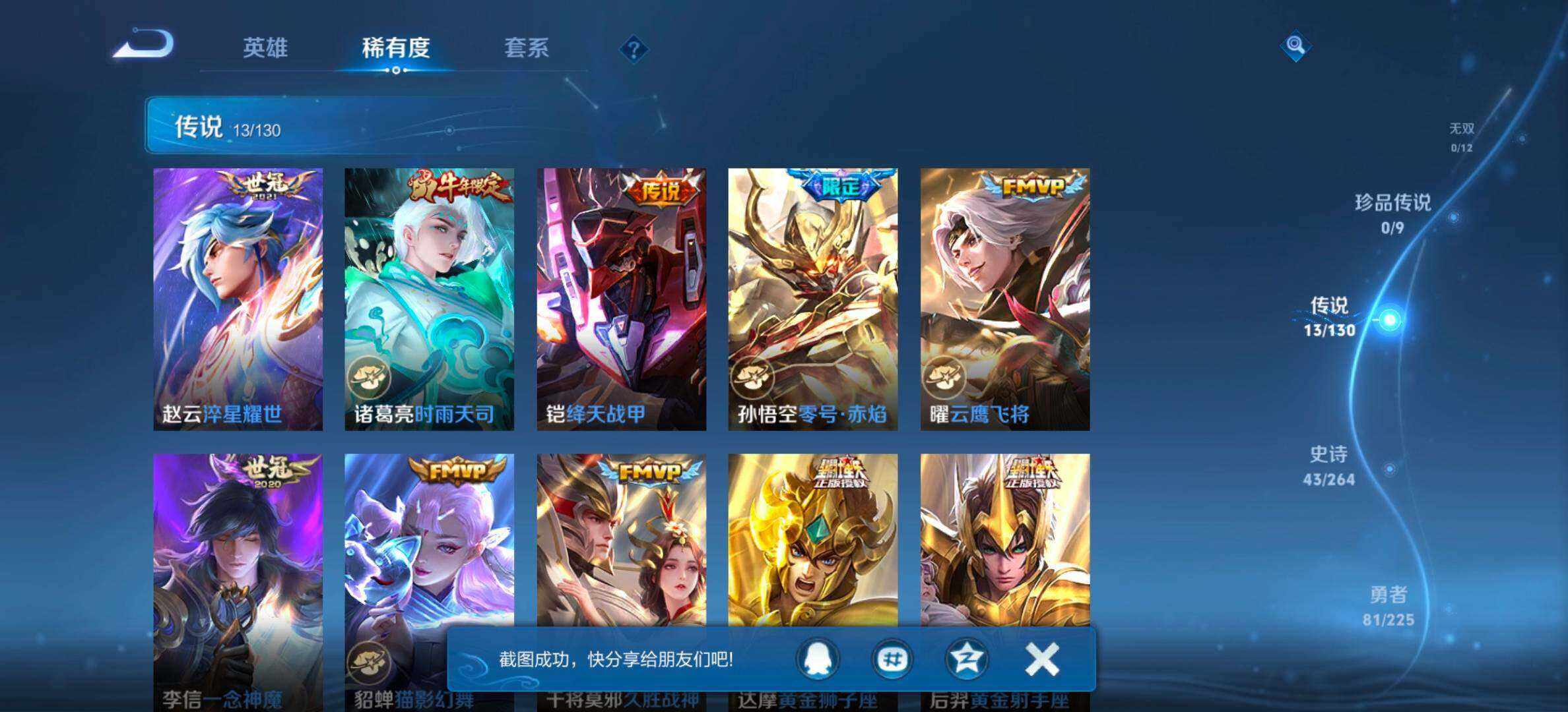 【传说皮肤】:赵云淬星耀世,诸葛亮时雨天司,铠绛天战甲,孙悟空零号赤焰,曜云鹰飞将,李信一念神魔,貂蝉猫影幻舞,干将莫邪久胜战神,达摩黄金狮子座,后羿黄金射手座,宫本武藏地