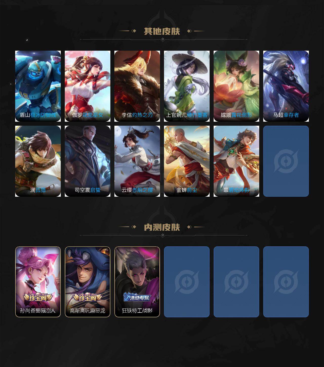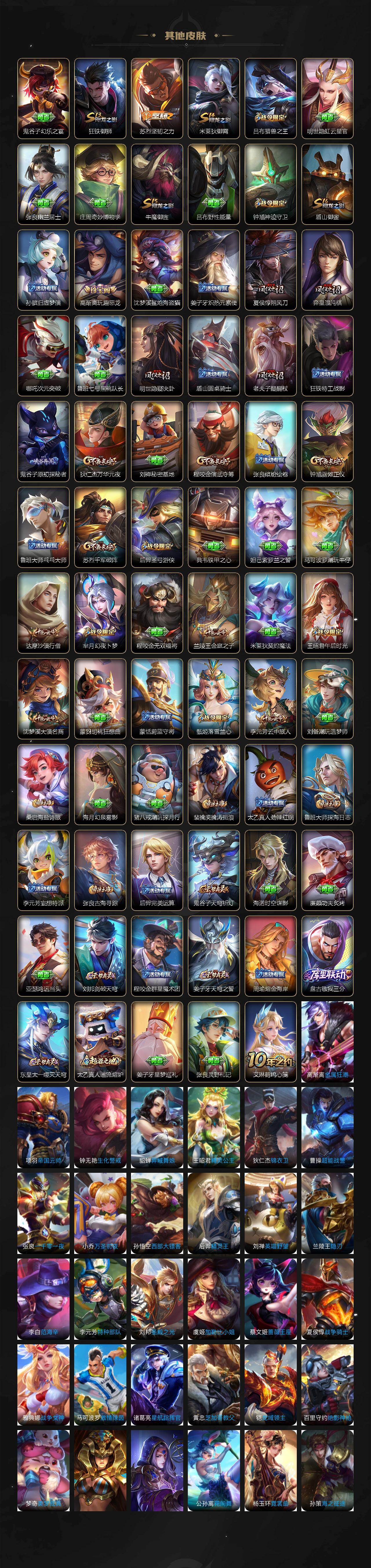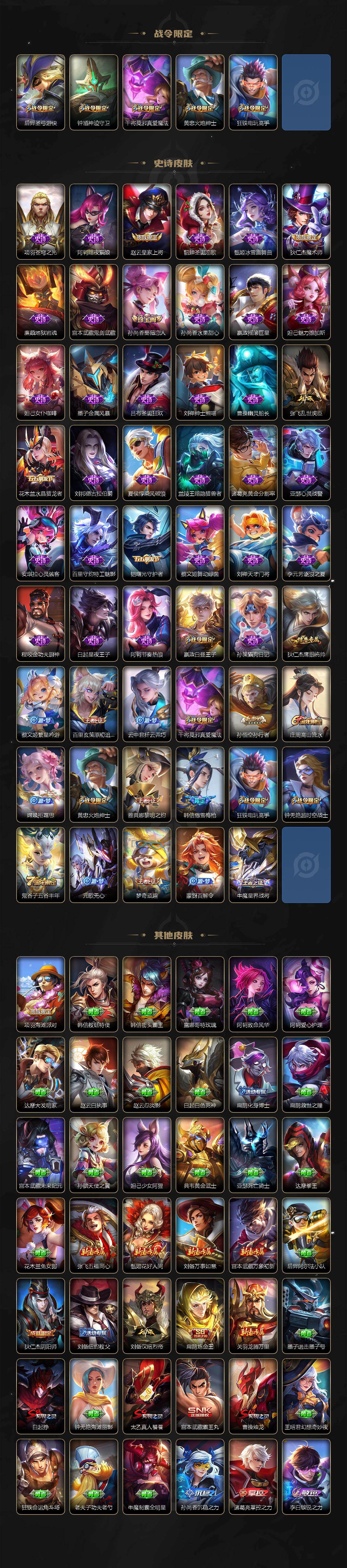 【限定皮肤】:白起狰,姜子牙天穹之誓,狄仁杰阴阳师,赵云皇家上将,嬴政白昼王子,孙尚香蔷薇恋人,庄周高山流水,高渐离玩趣恶龙,钟无艳超时空战士,扁鹊炼金王,芈月幻夜卜梦,吕布猎兽之王,元歌无心,夏侯