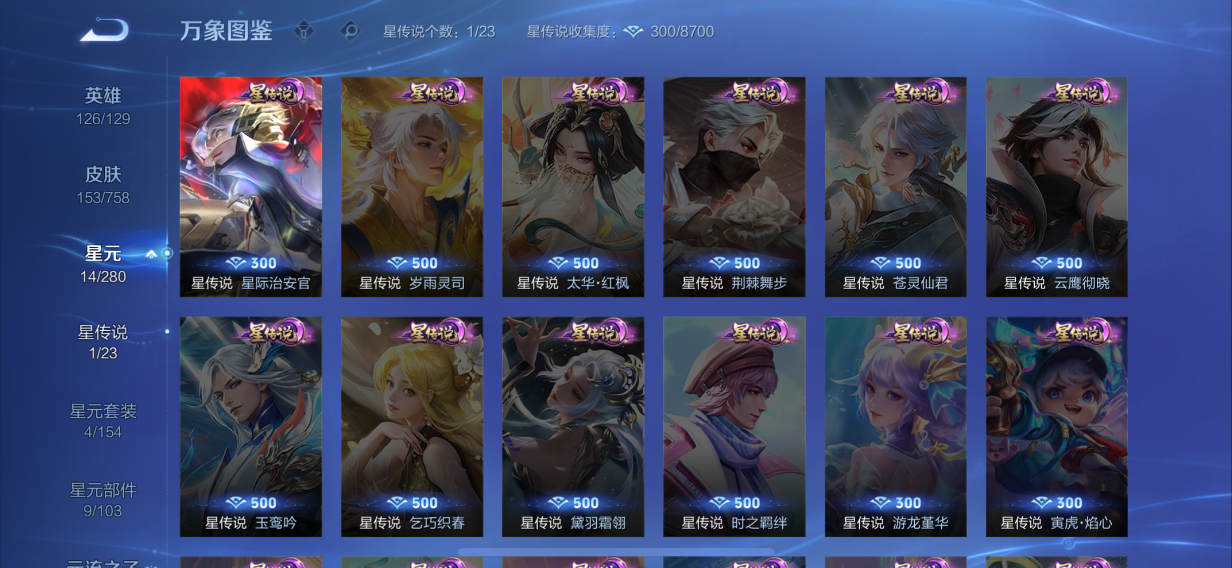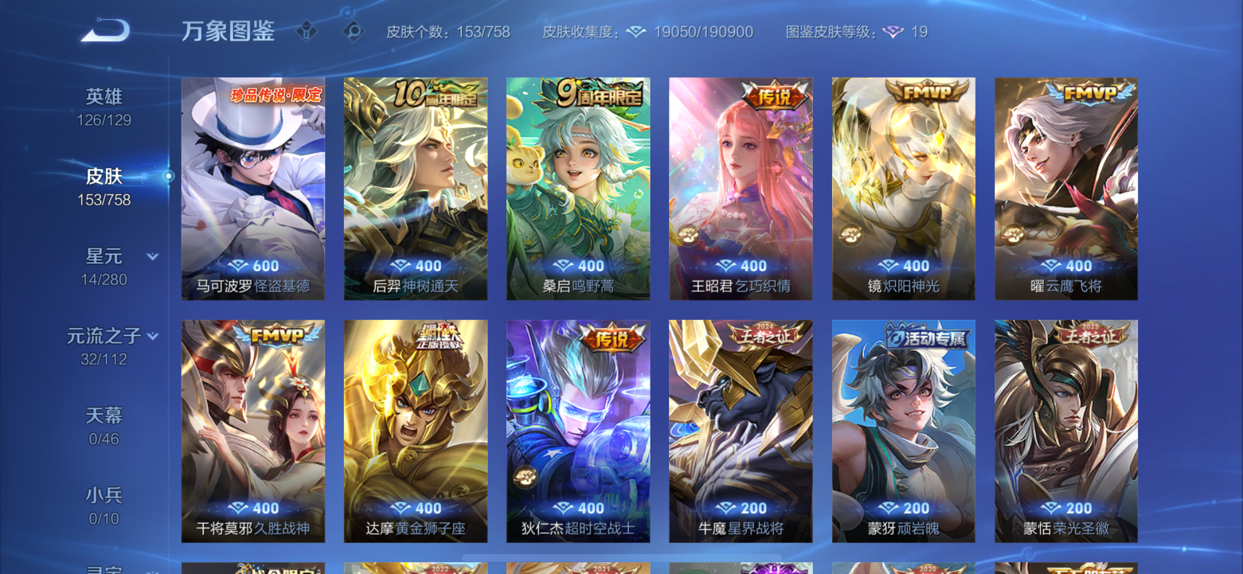 V6 皮肤153 英雄129 至尊星耀 珍品传说1 传说8 其他皮肤150