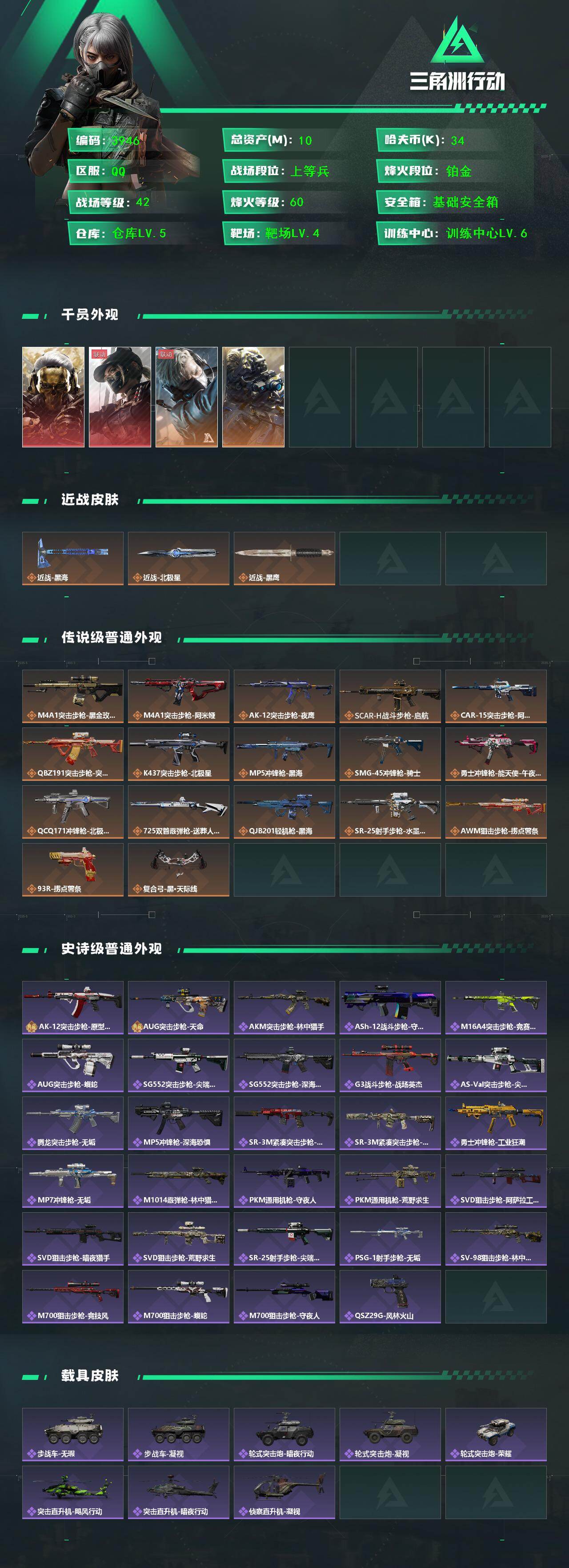 10m总资产-34k哈伏币-60烽火等级-铂金-42战场等级-上等兵【干员外