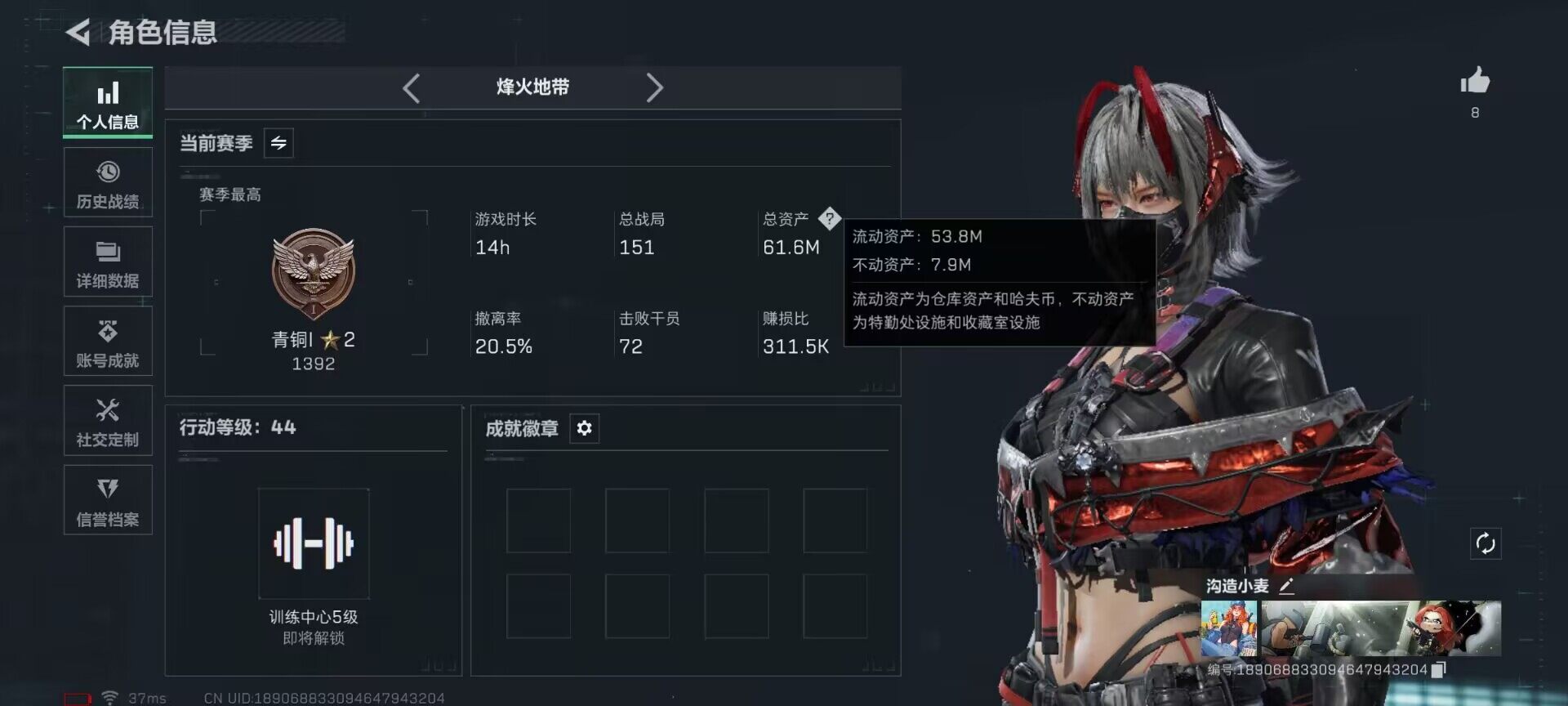 总资产(M):61M/哈夫币(K):10167K/哈夫币(K):10167K/全面战场等级:23_段