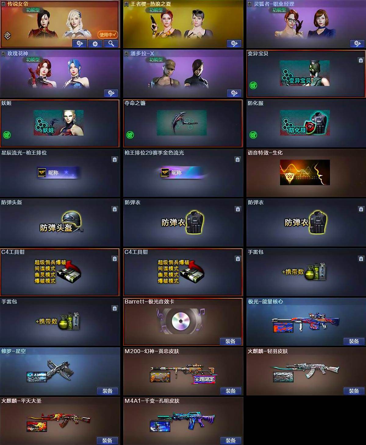 【皮肤】:M200-幻神-黄忠皮肤,火麒麟-轻羽皮肤,火麒麟-平天大圣,M4A1-千变-孔明皮