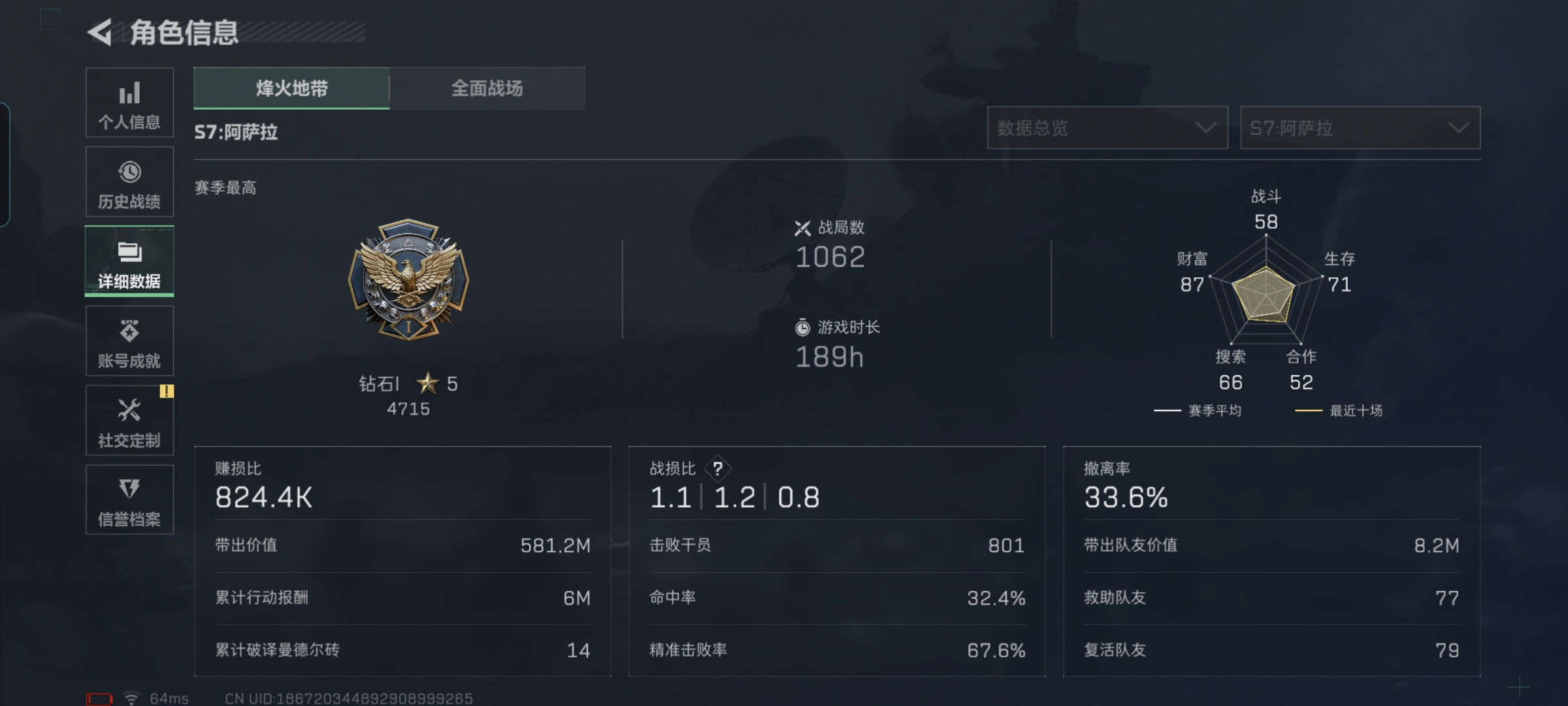 MSJ3164【高资产154M 信条捆绑包 2干员】【总资产(M)】154.63【哈夫币】1174k【行动等级】60【烽火地带段位】钻石【干员皮肤】 露娜-金牌射手 红狼-电锯惊魂 【近战武器】 黑鹰 信条 【枪皮】AS Val突击步枪-星之彩 M4A1突击步枪-粉色涂装 M4A1突击步枪-高雅黑 M4A1突击步枪-海色 M4A1突击步枪-繁盛 AKM突击步枪-肃杀 QBZ95-1突击步枪-高雅黑 QBZ95-1突击步枪-海浪 QBZ95-1突击步枪-三角洲力量 QBZ95-1突击步枪-海色 Q