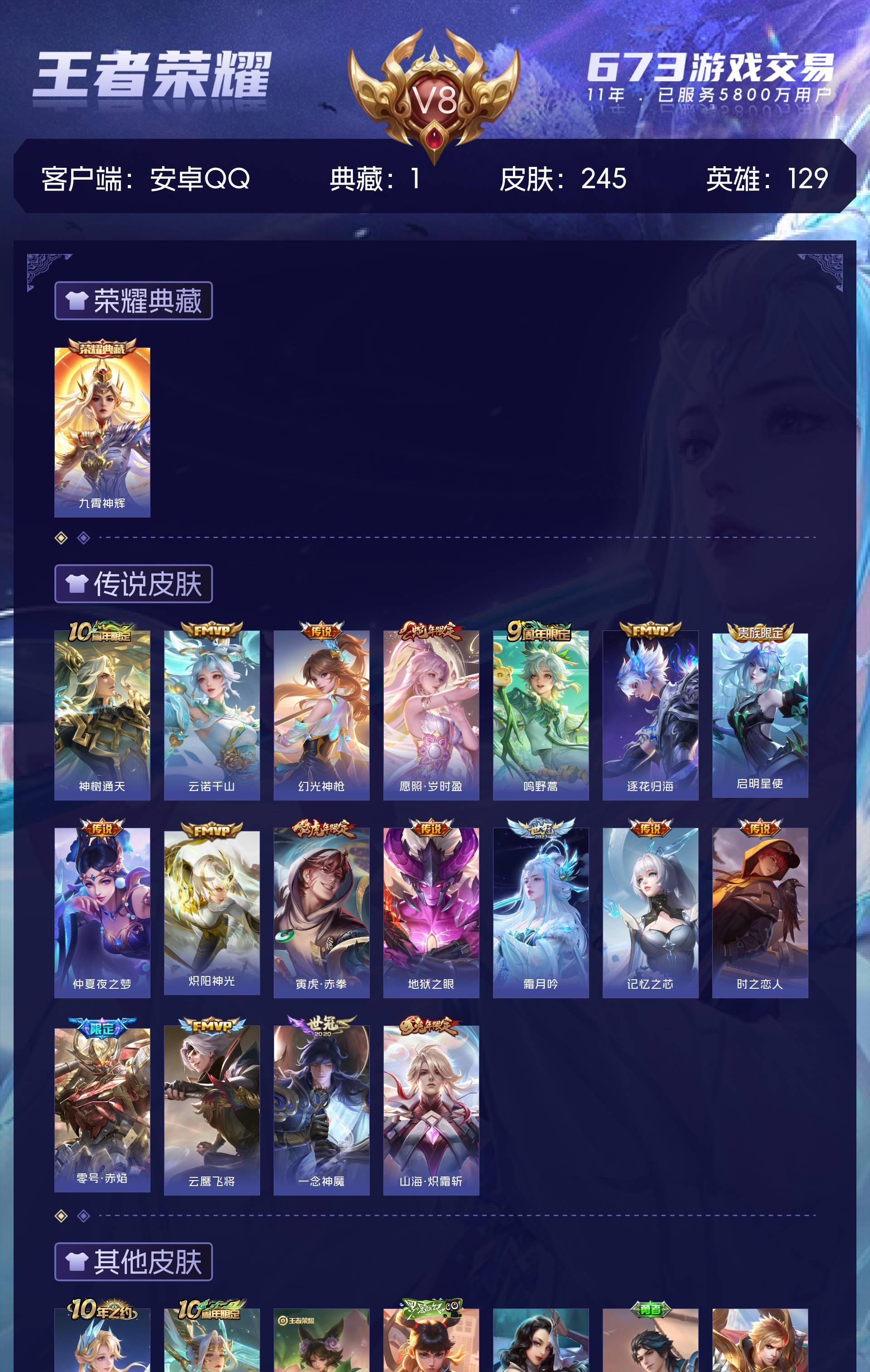 V8 皮肤245 英雄129 尊贵铂金 荣耀典藏1 传说18 其他皮肤232