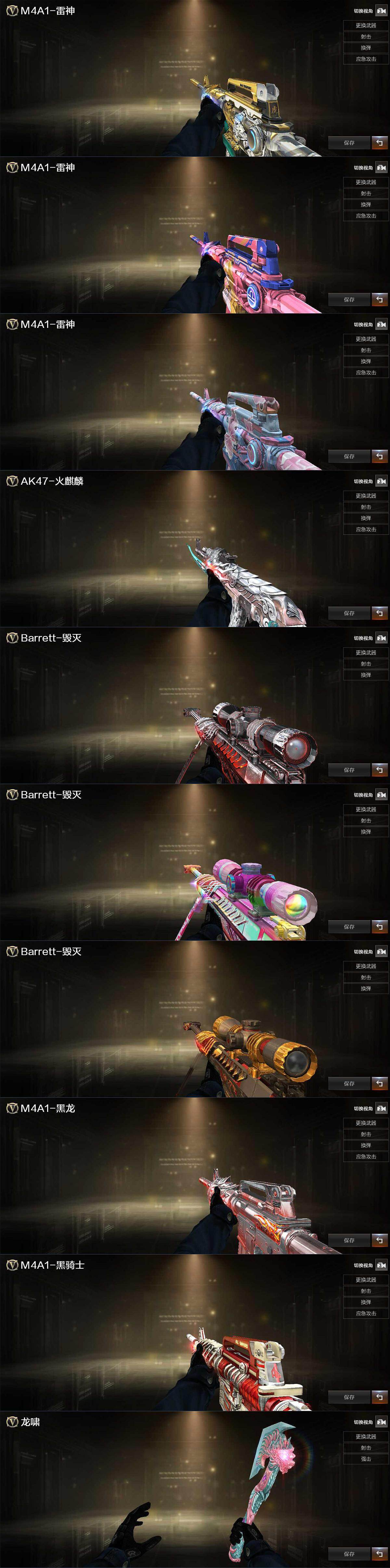 【皮肤】:雷神-虎将,雷神-维纳斯皮肤,雷神-梦蝶 皮肤,火麒麟-轻羽皮肤,毁灭-暗月,毁灭-虹光风暴 皮肤*2,毁灭-英雄计划 皮肤,黑龙-暗月,黑骑士-AG-S4冠军典藏,龙啸-青青莓果 皮肤