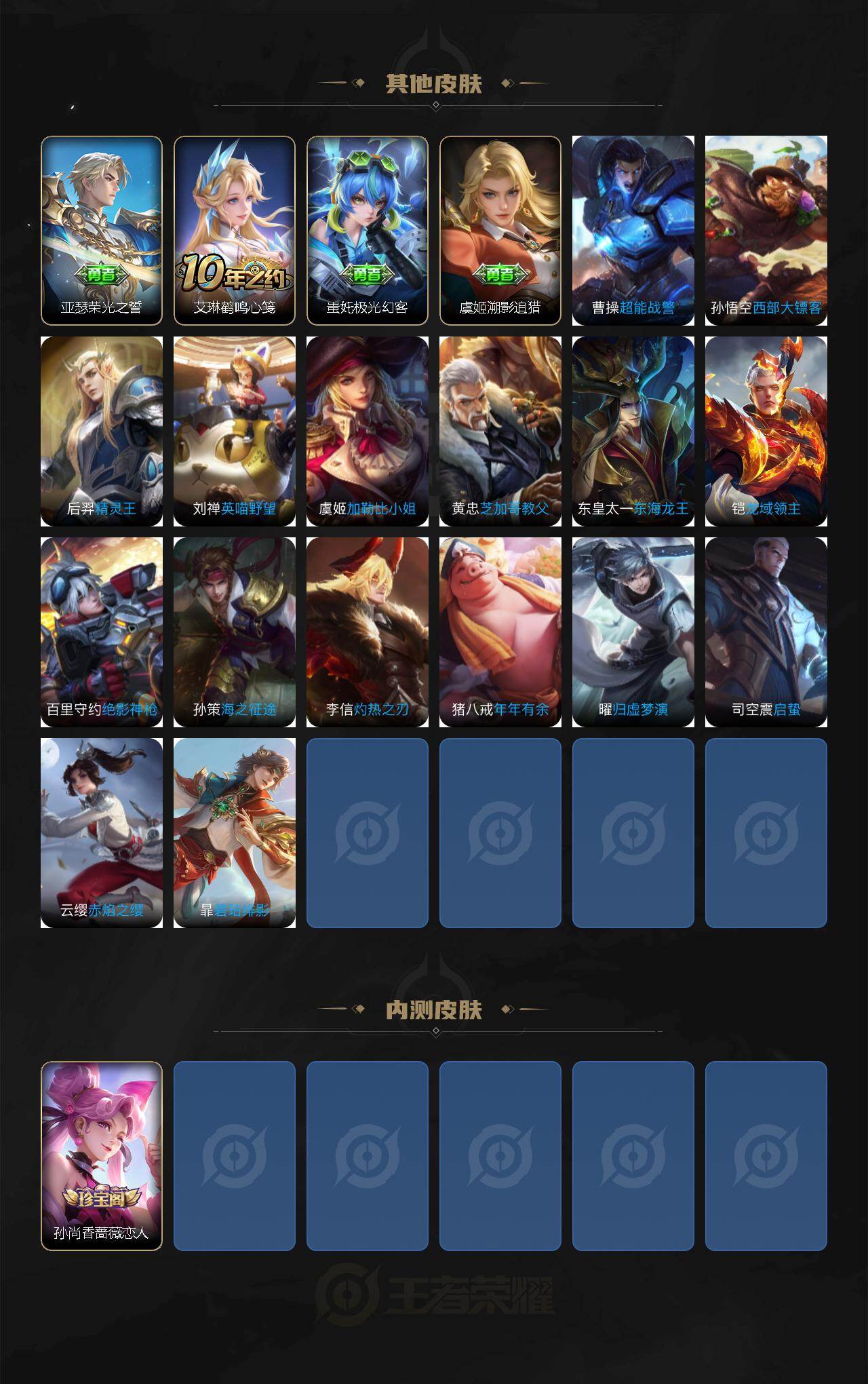 【限定皮肤】:姜子牙天穹之誓,狄仁杰阴阳师,孙尚香蔷薇恋人,李元芳云中旅人,沈梦溪大漠名商,裴擒虎李小龙,裴擒虎擒涛扼浪,鲁班大师探海日志,桑启海盐诗旅,阿古朵江河有灵,张良古海