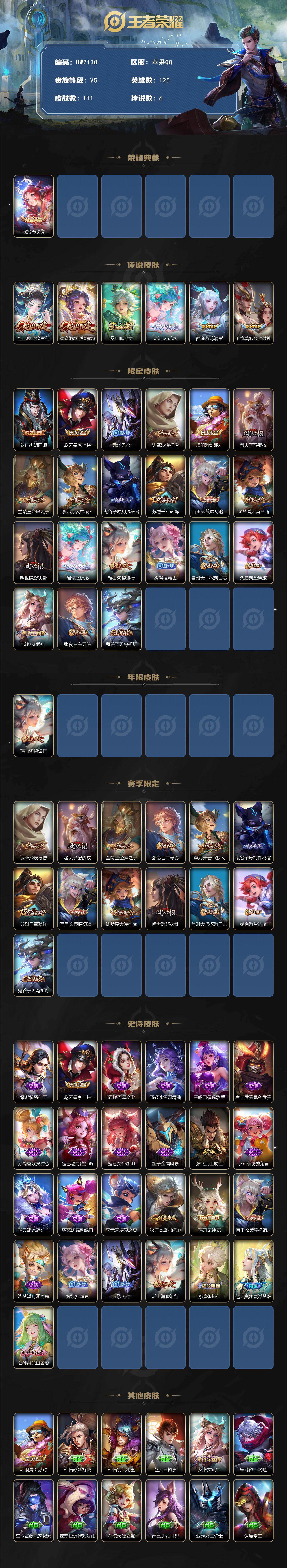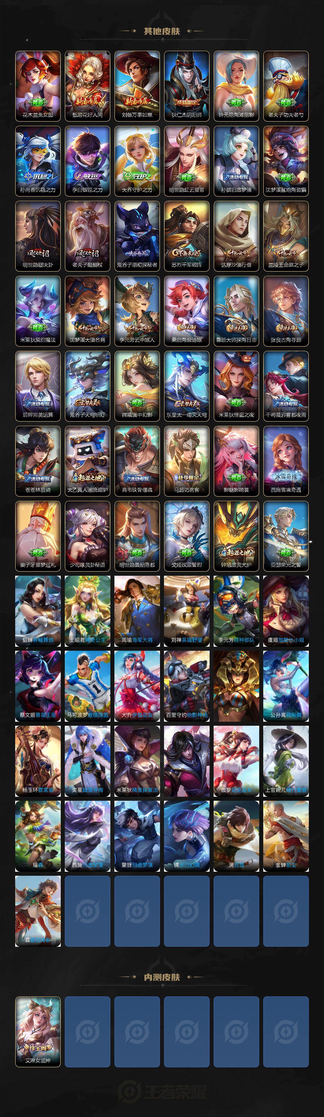 【限定皮肤】:狄仁杰阴阳师,赵云皇家上将,元歌无心,达摩沙漠行僧,项羽海滩派对,老夫子醍醐杖,兰陵王金庭之子,李元芳云中旅人,鬼谷子原初探秘者,苏烈千军破阵,百里