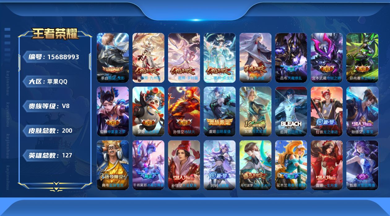 [15688993]V8 1典藏 12传说 127英雄 200皮肤 可修改实名