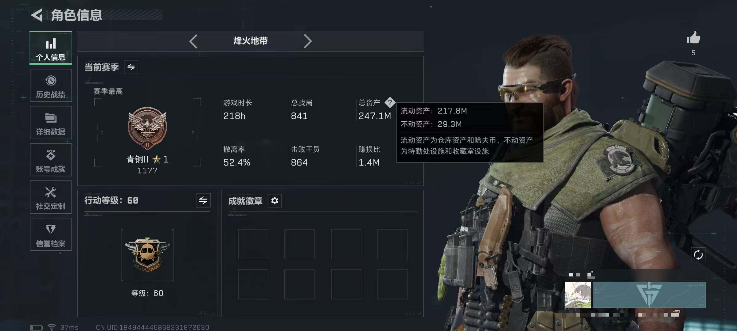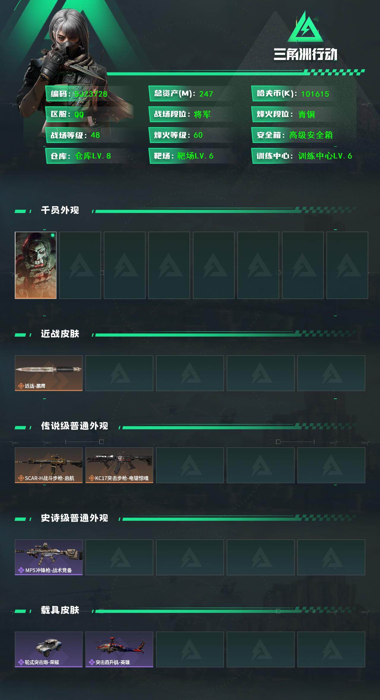 总资产(M):247M/哈夫币(K):101615K/传说枪皮数:2/全面战场等级:48_段位:将军/烽火地带等级:60_段位:青铜/