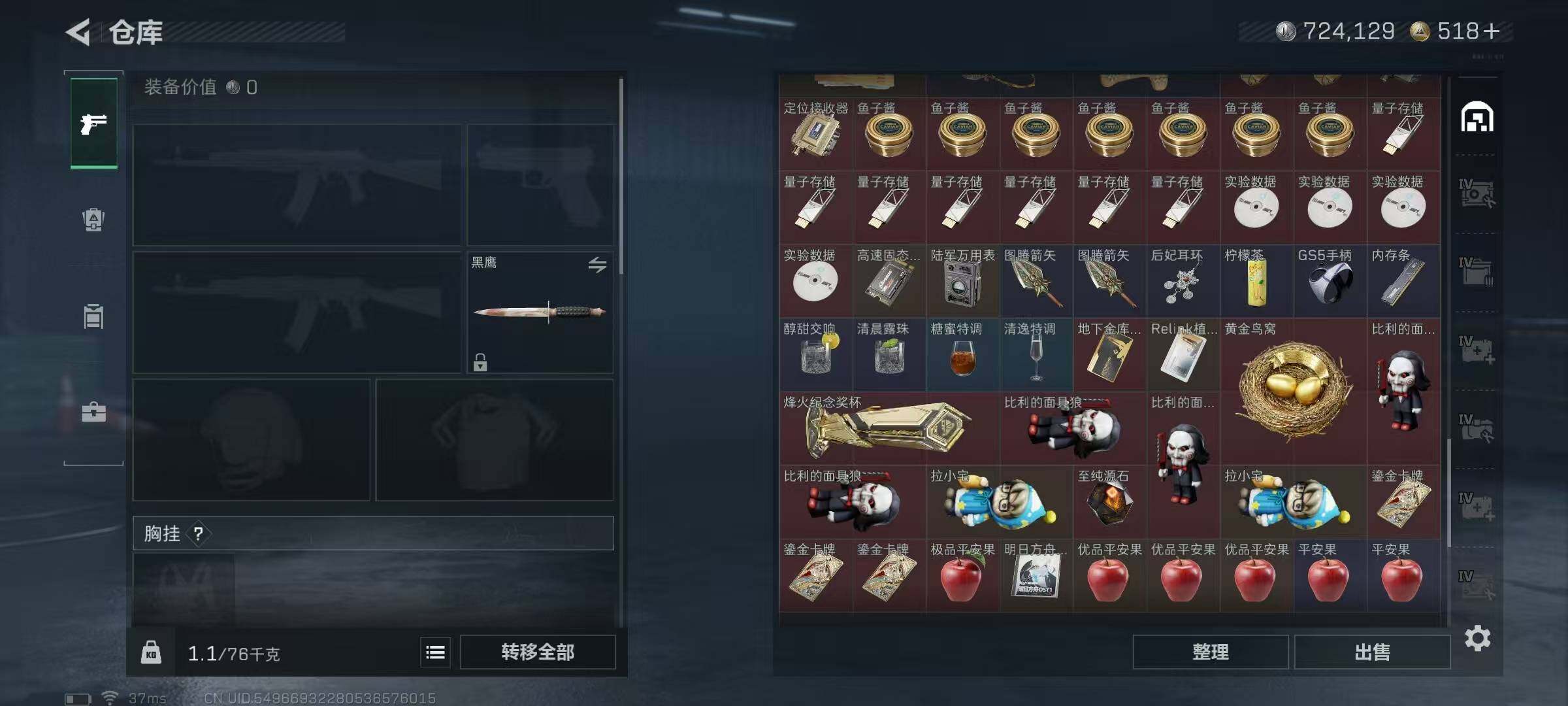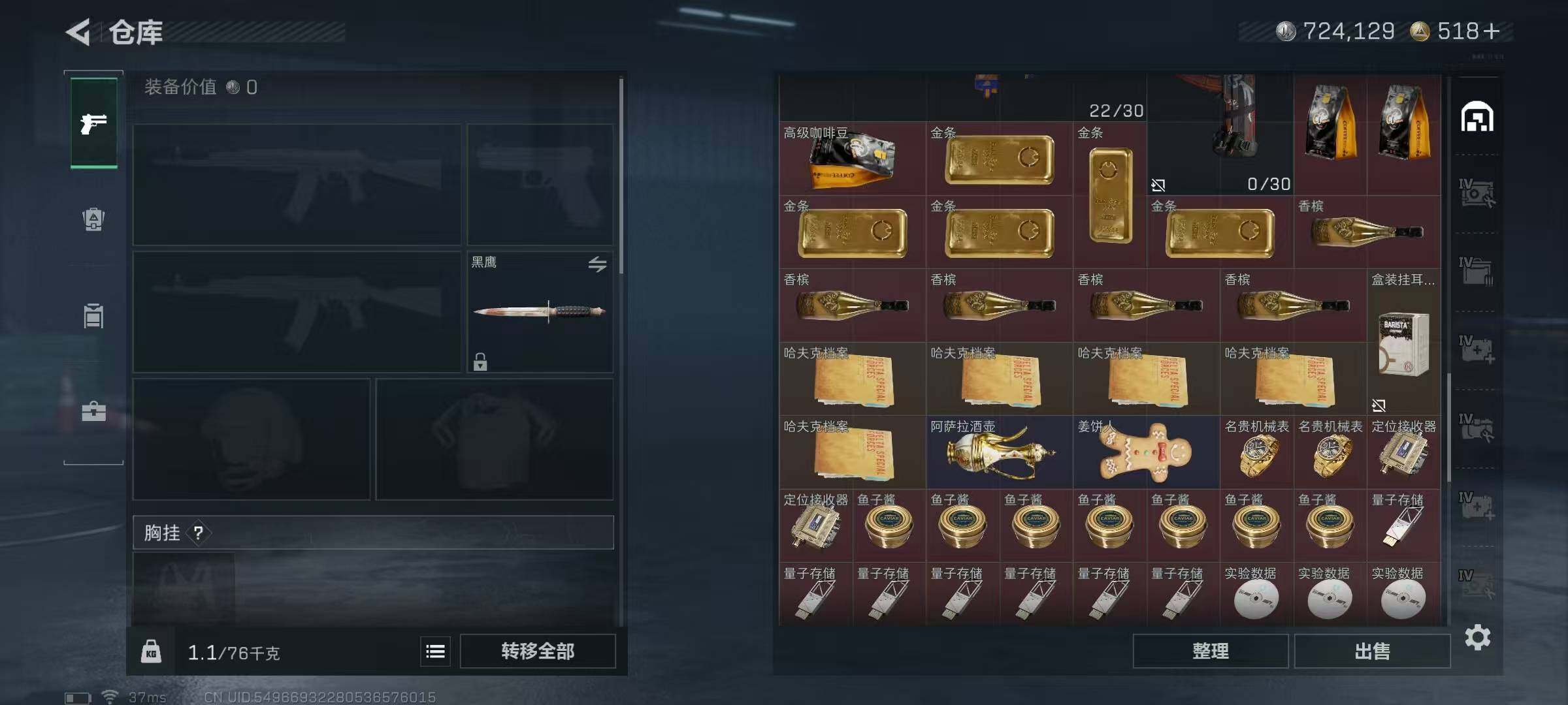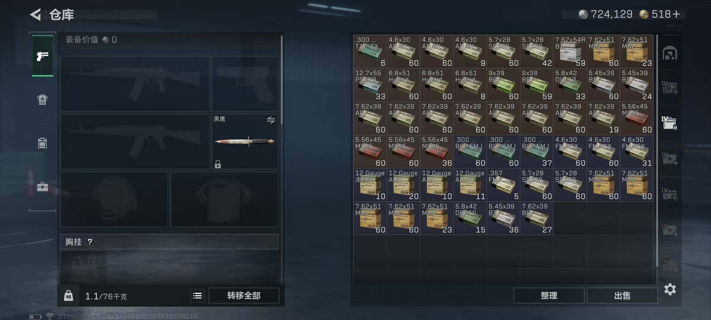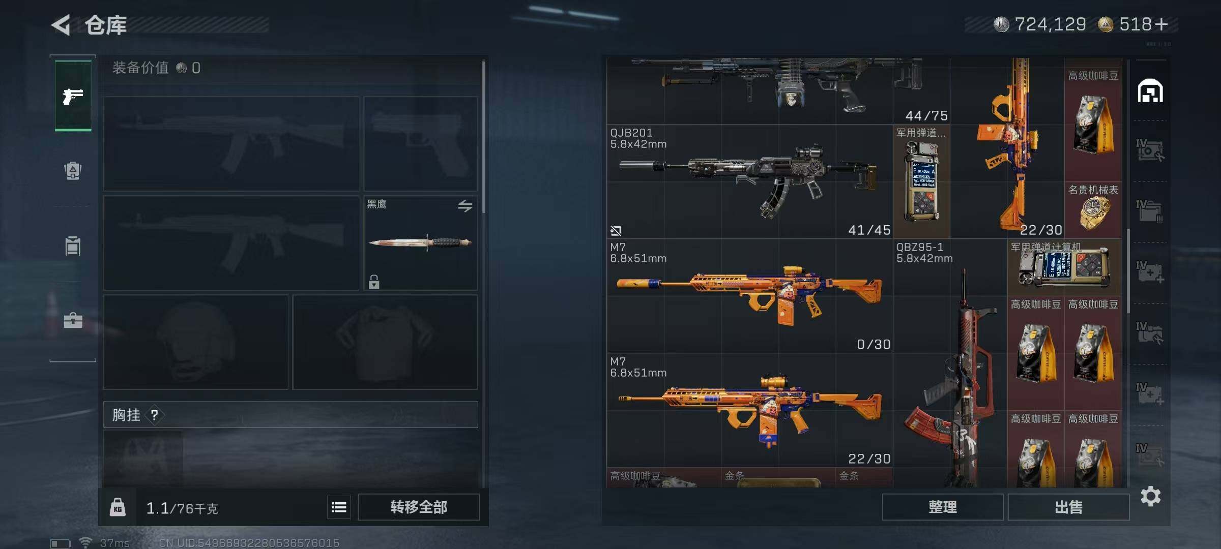【SJZ3729】总资产(M):105M/哈夫币(K):724K/哈夫币(K):724K/传说枪皮数:13/全面战场等级:14_段位:列兵/烽火地带等级:60_段位:钻石/深蓝-不破誓约/红狼-电锯惊魂/近战-黑鹰/M4A1突击步枪-阿米娅/AK-12突击步枪-特斯拉线圈/SCAR-H战斗步枪-水墨云图/SCAR-H战斗步枪-启航/G3战斗步枪-骑士/CAR-15突击步枪-阿米娅/KC17突击步枪-电锯惊魂/Vector冲锋枪-能天使-午夜邮差/UZI冲锋枪-特斯拉线圈/SMG-45冲锋枪-骑士