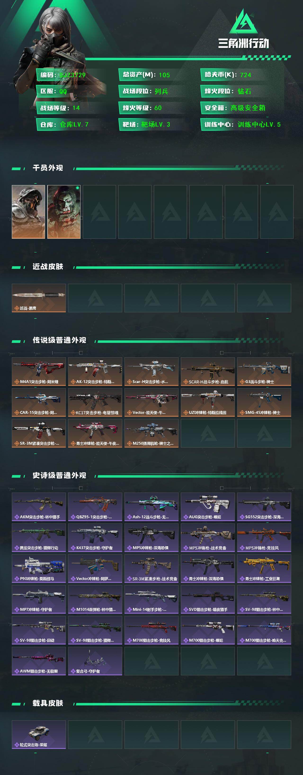 总资产(M):105M/哈夫币(K):724K/传说枪皮数:13/全面战场等级:14_段位:列兵/烽火地带等级:60_段位:钻石