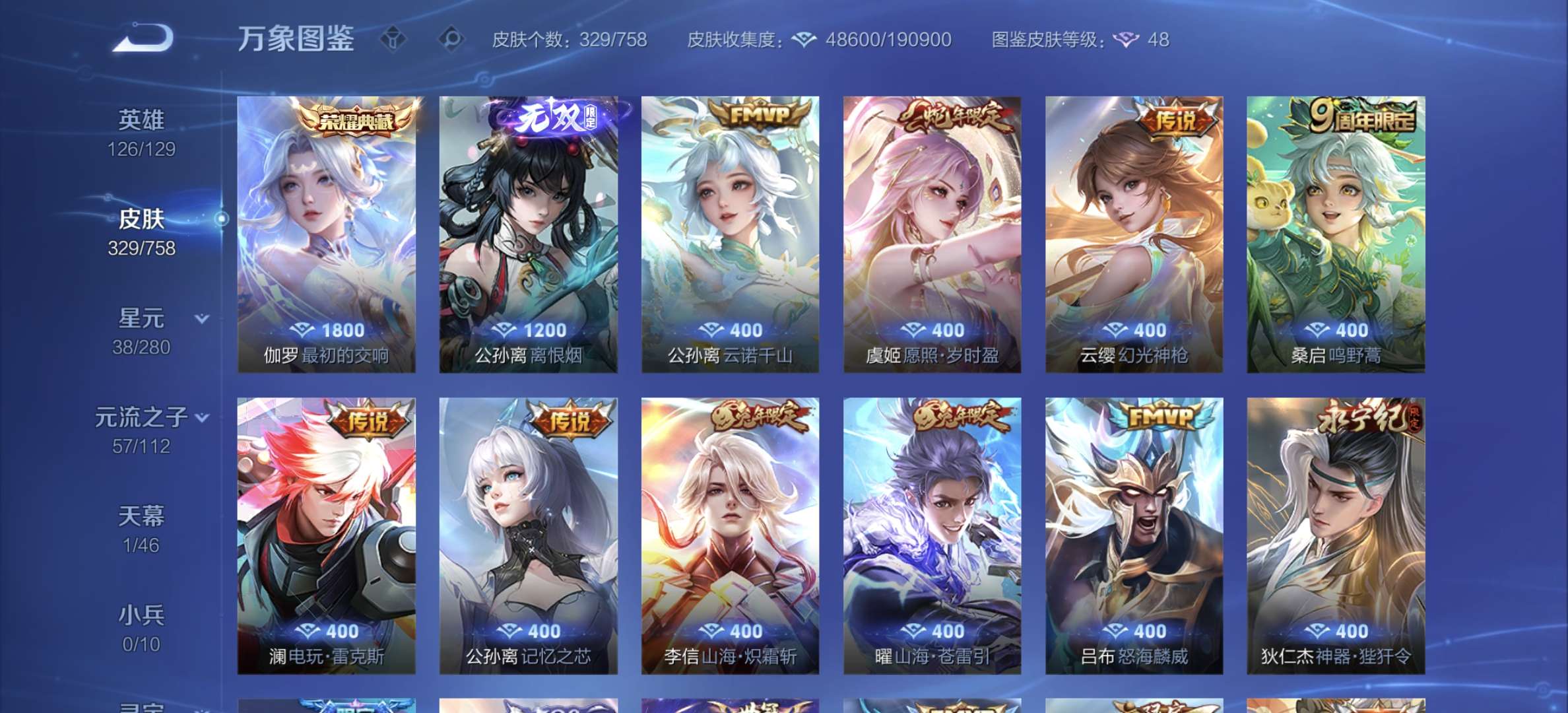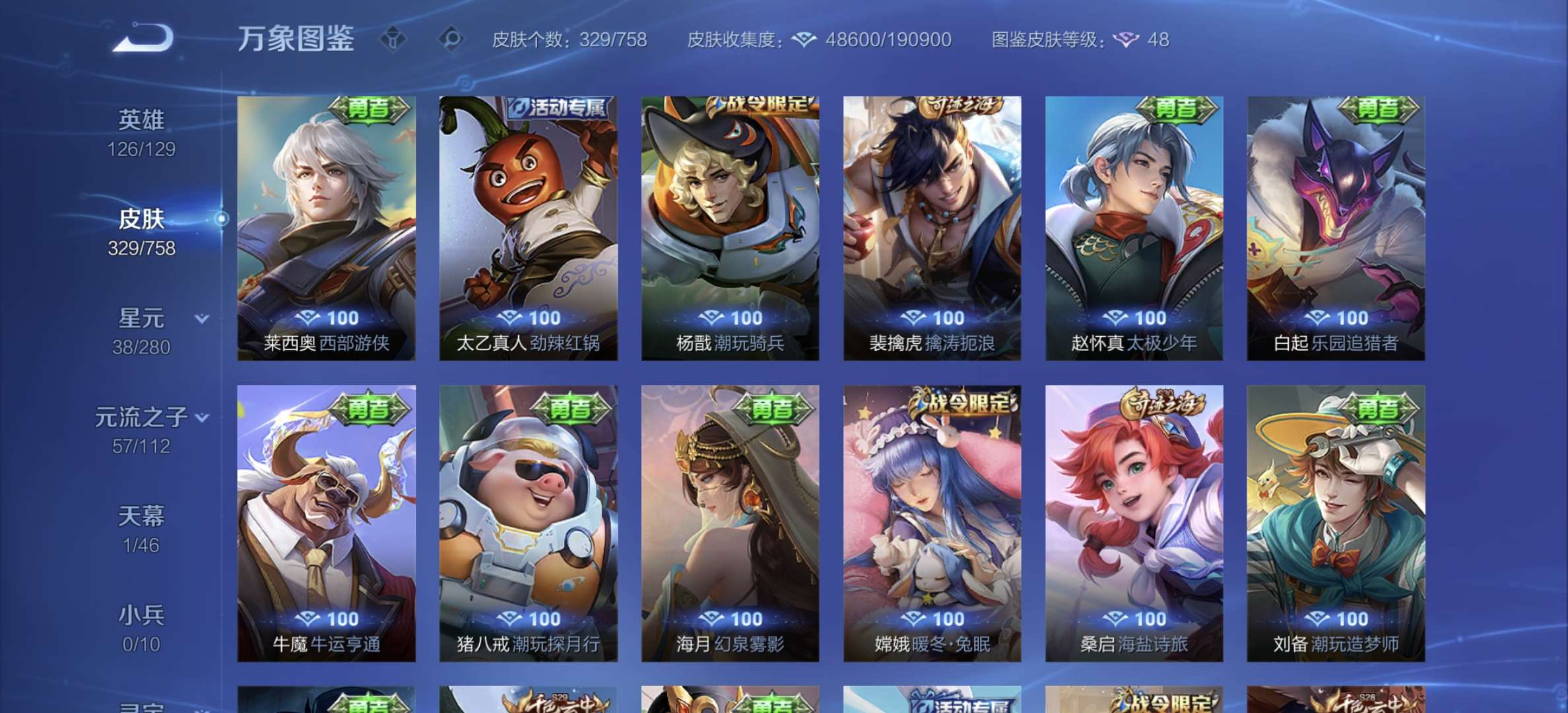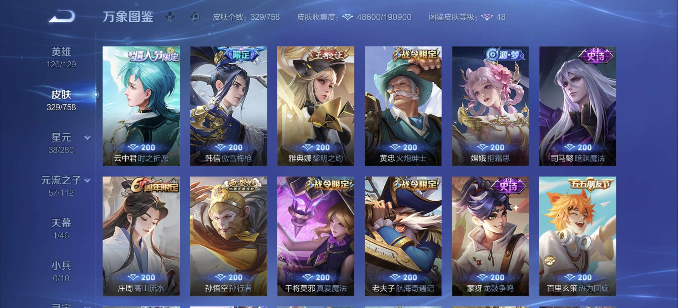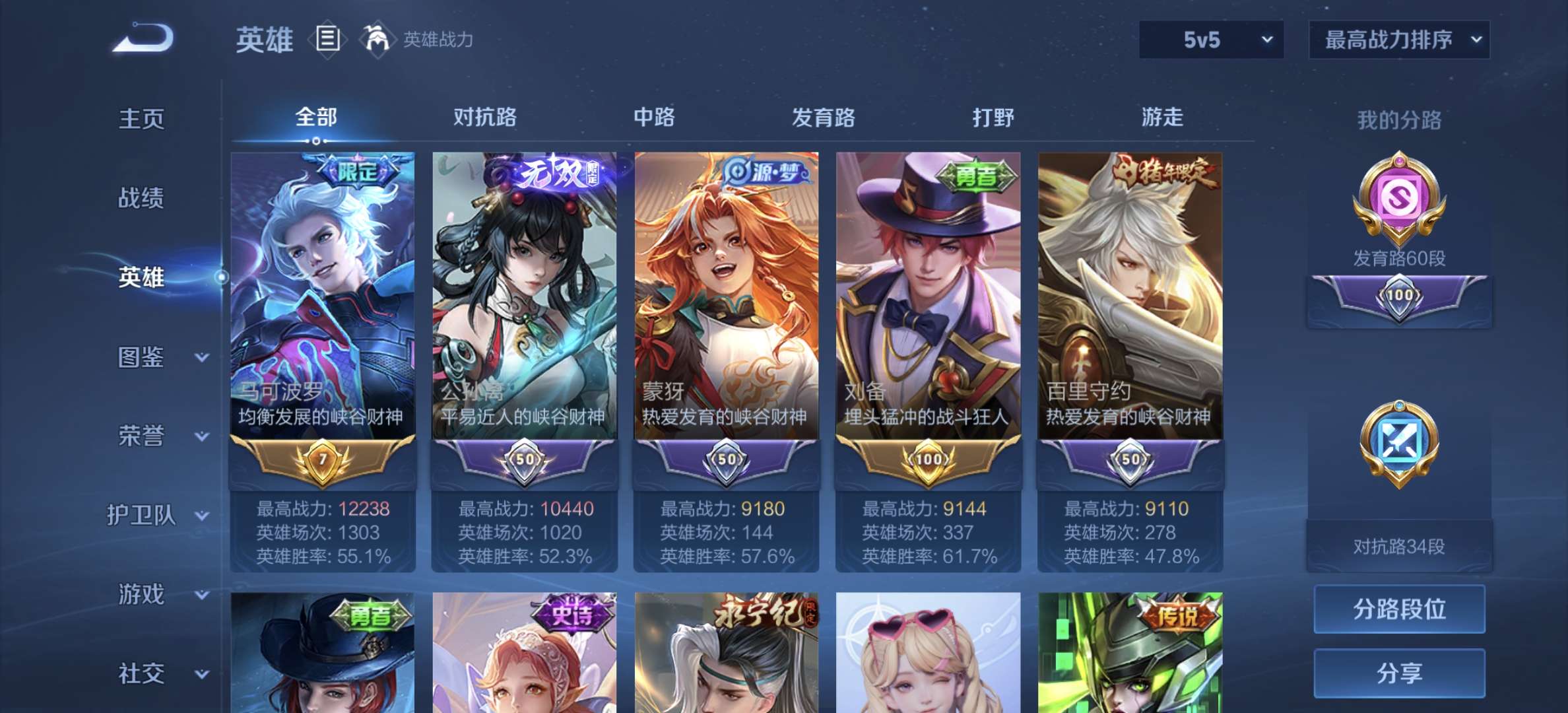 v8,329个皮肤,射手和战士皮肤超多,上过2100,发育路60段,对抗路34段,打野32段