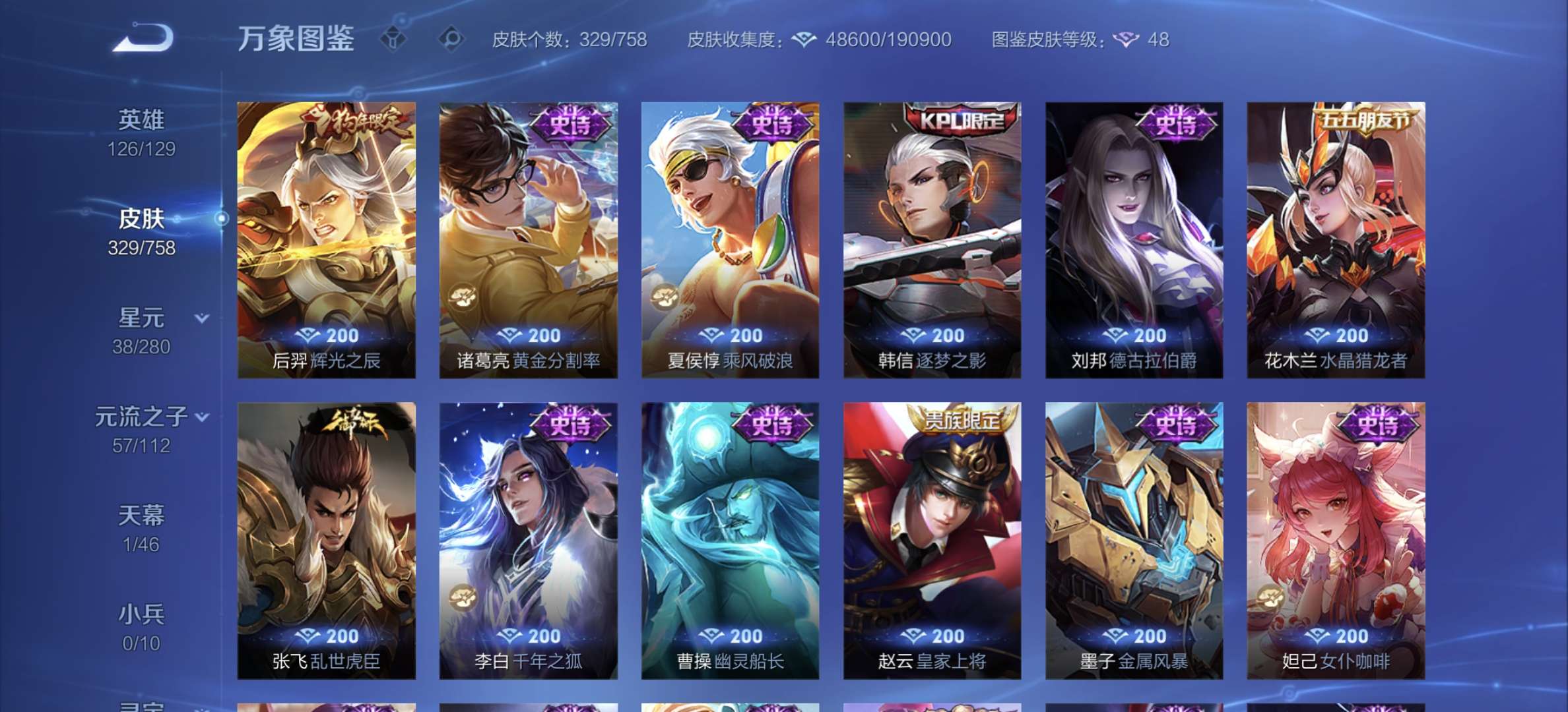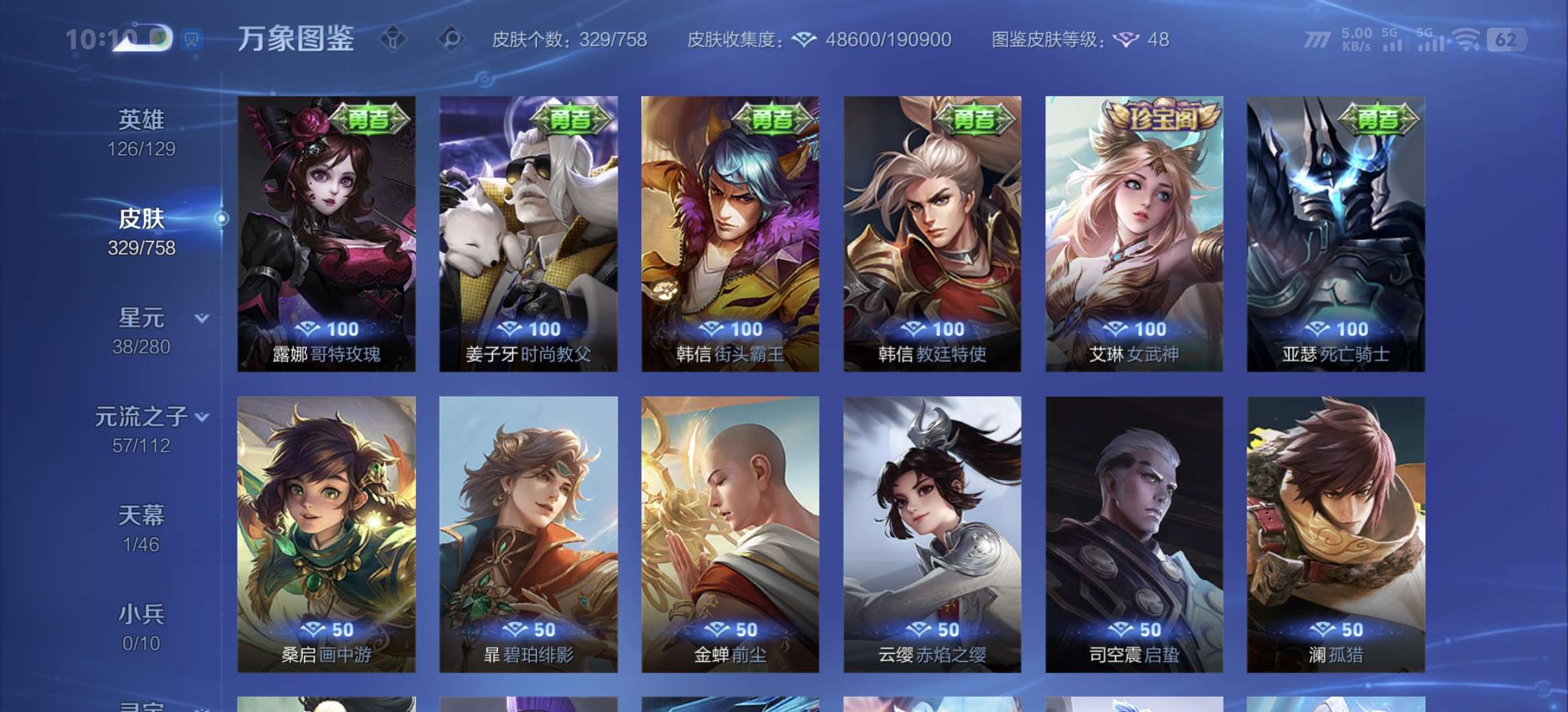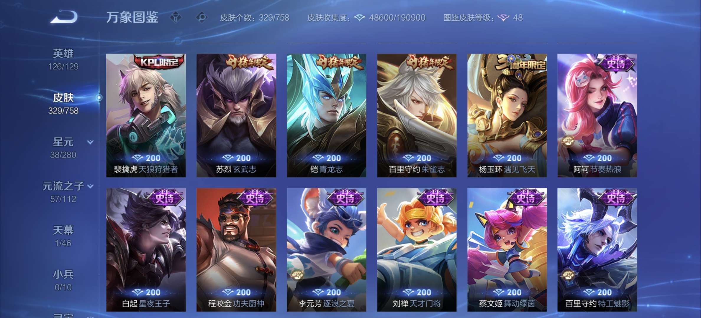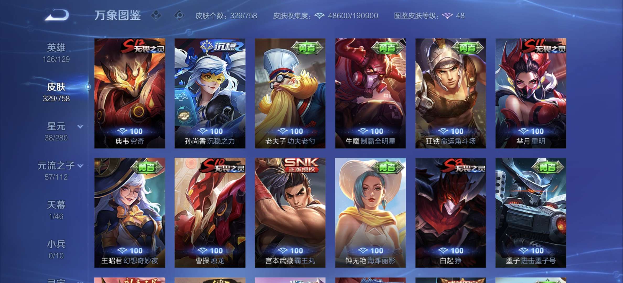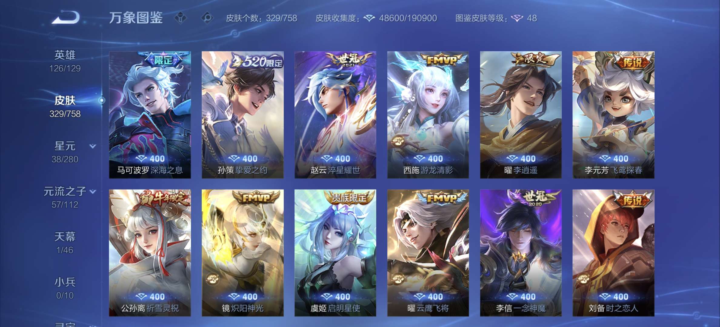 v8,329个皮肤,射手和战士皮肤超多,上过2100,发育路60段,对抗路34段,打野32段