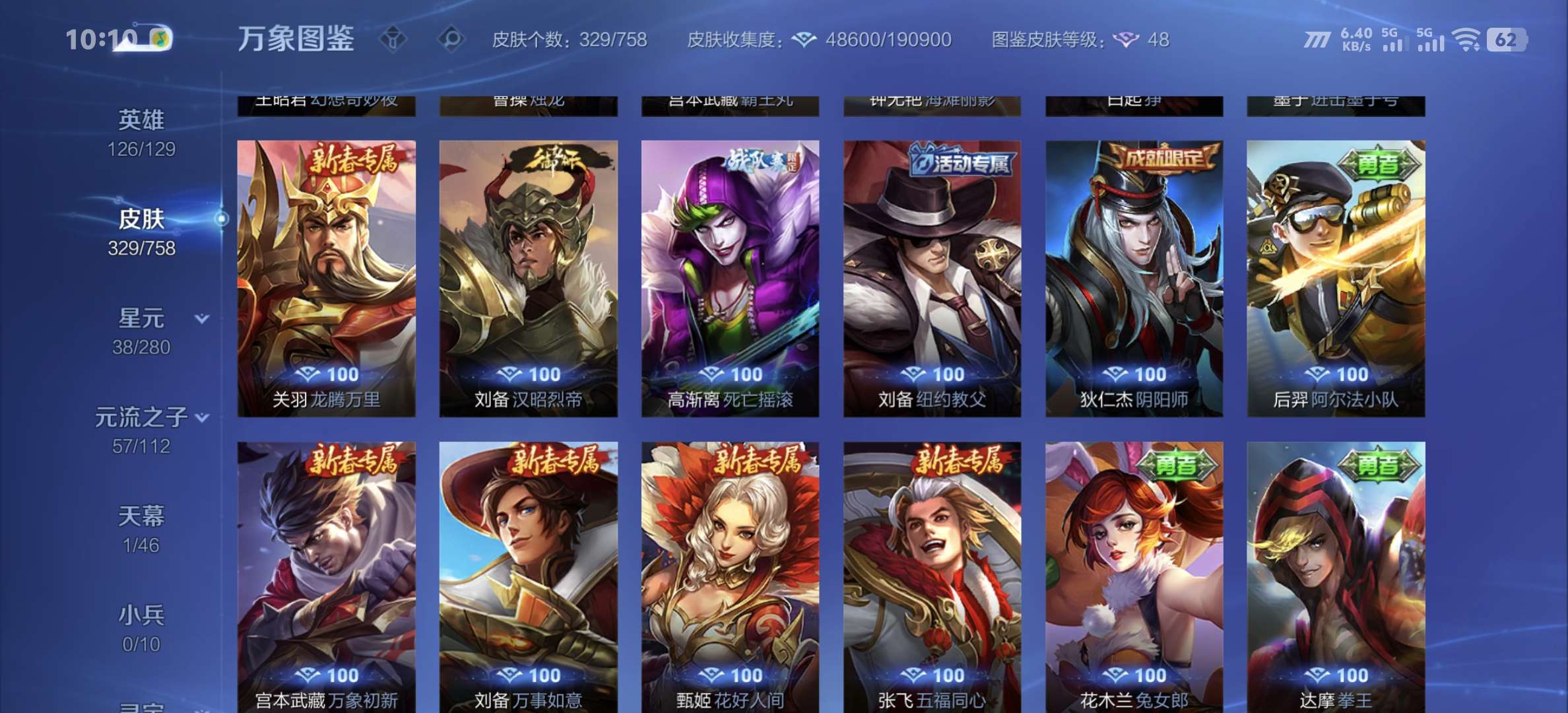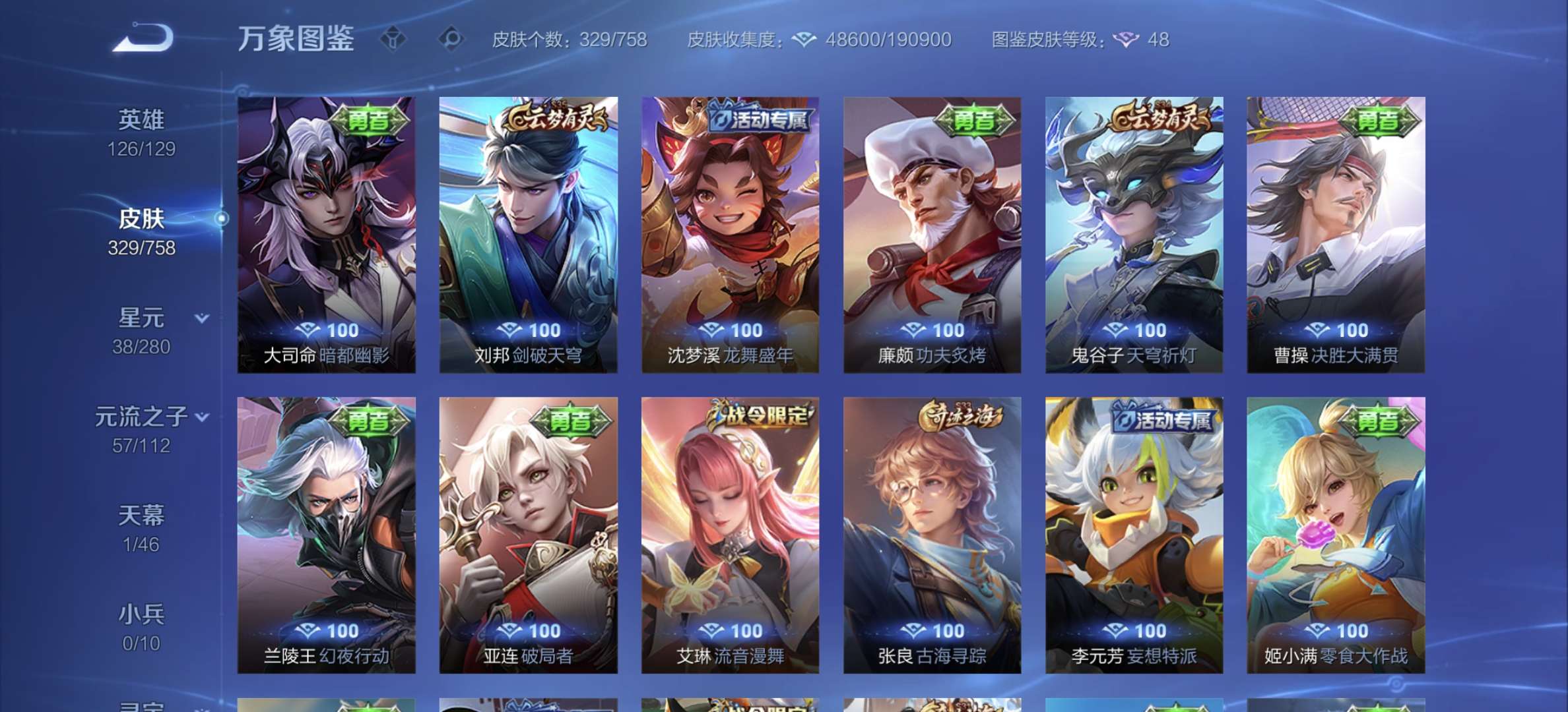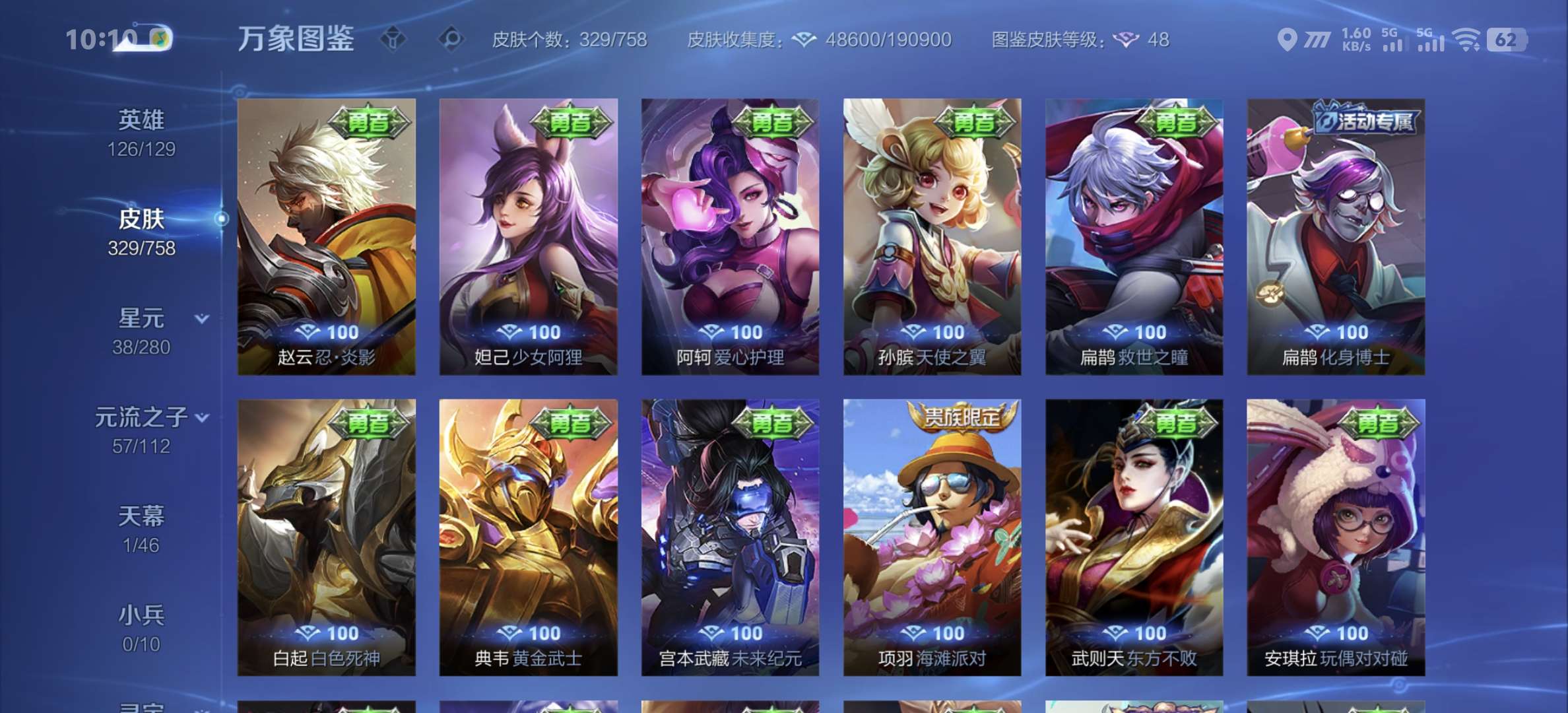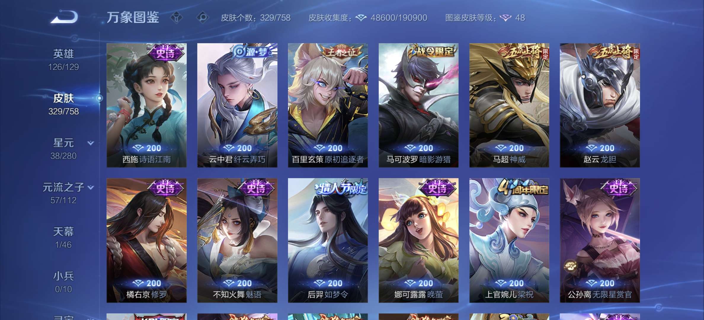 v8,329个皮肤,射手和战士皮肤超多,上过2100,发育路60段,对抗路34段,打野32段
