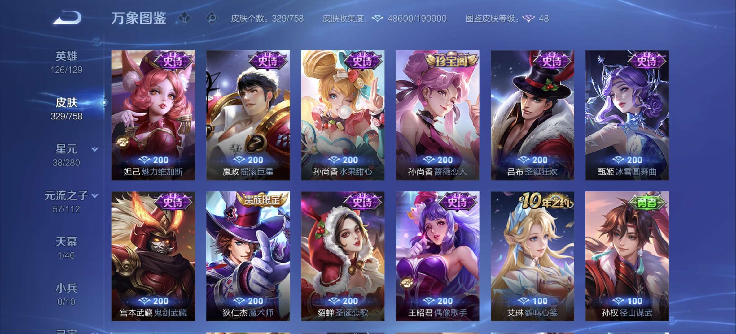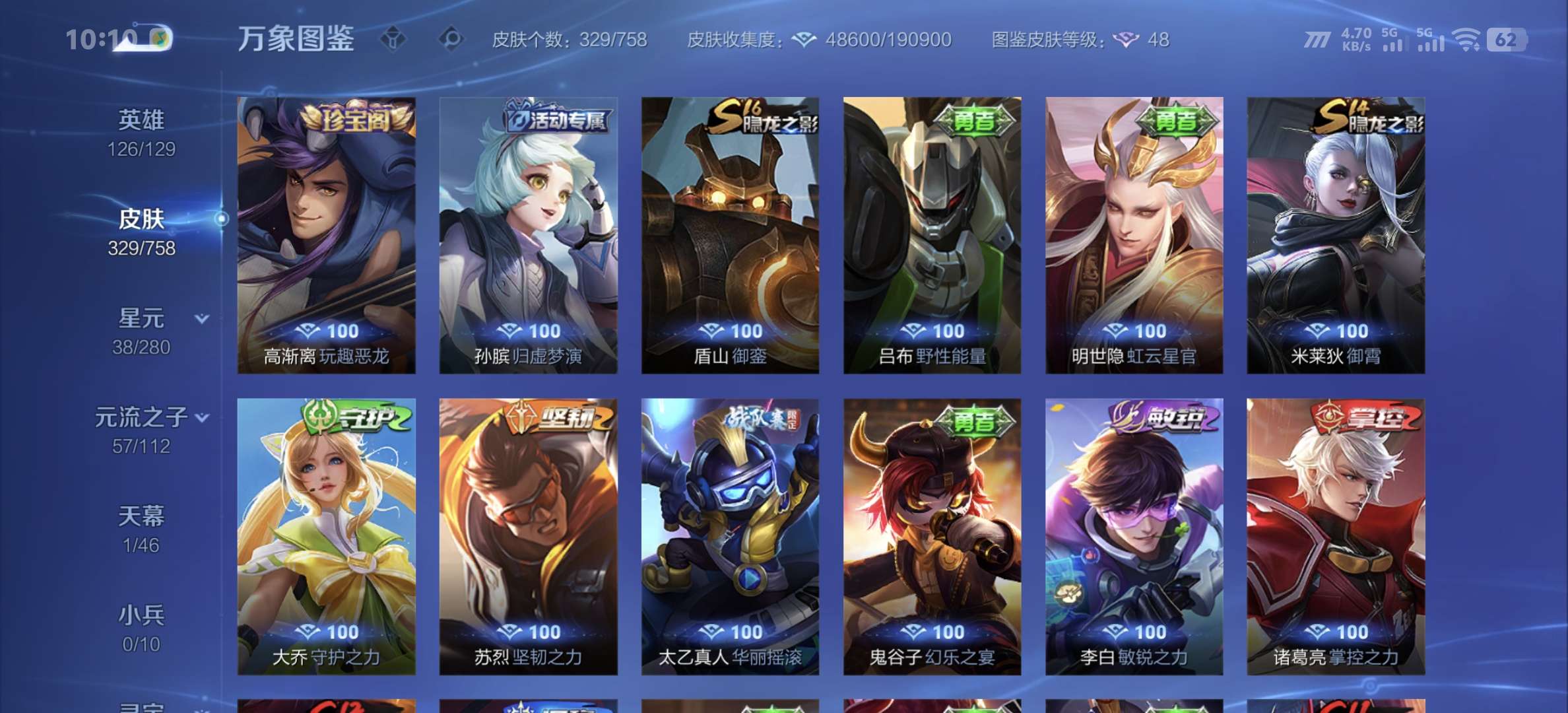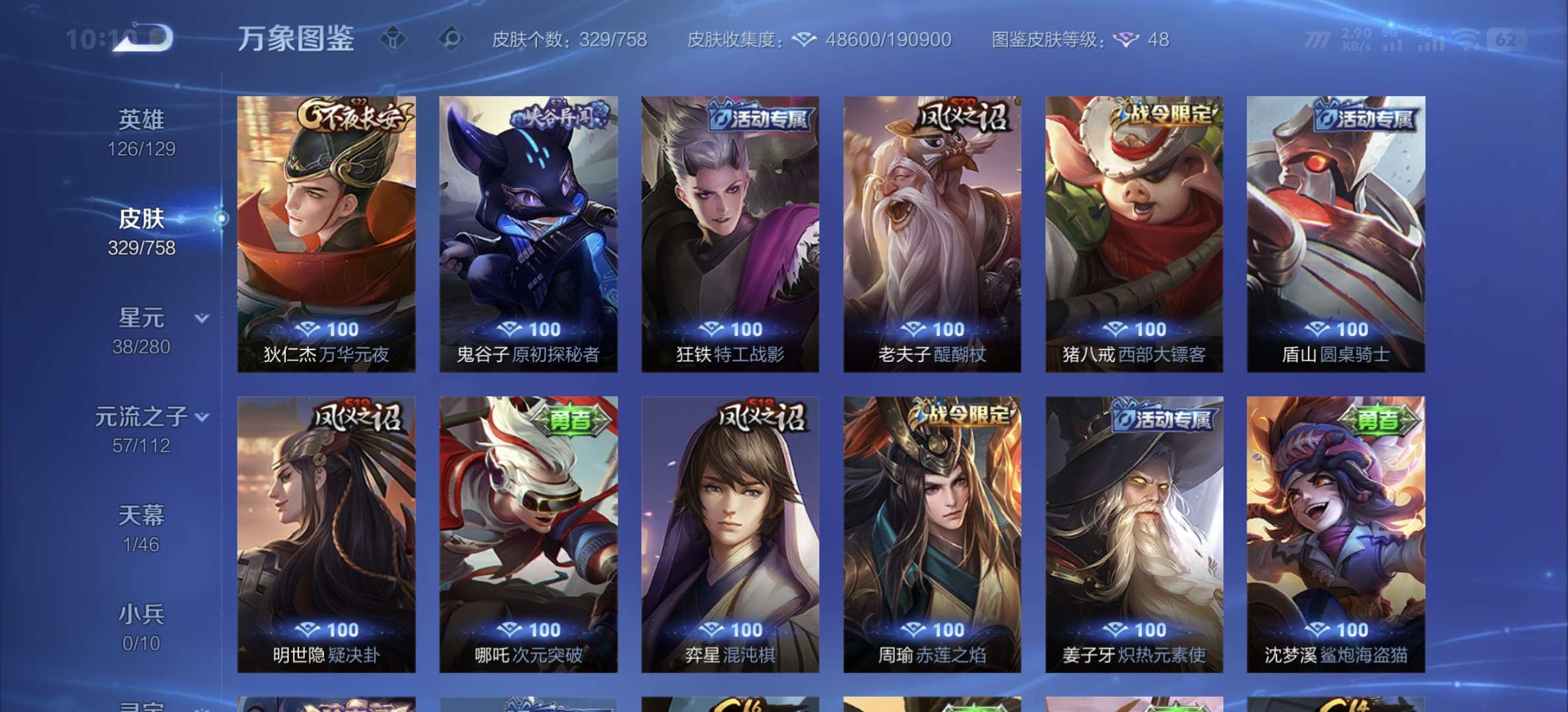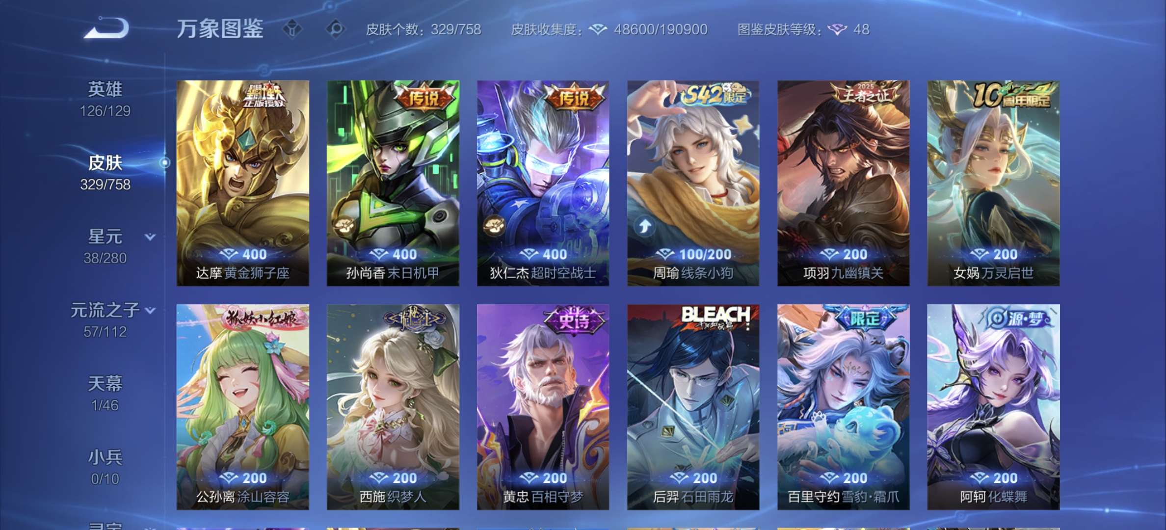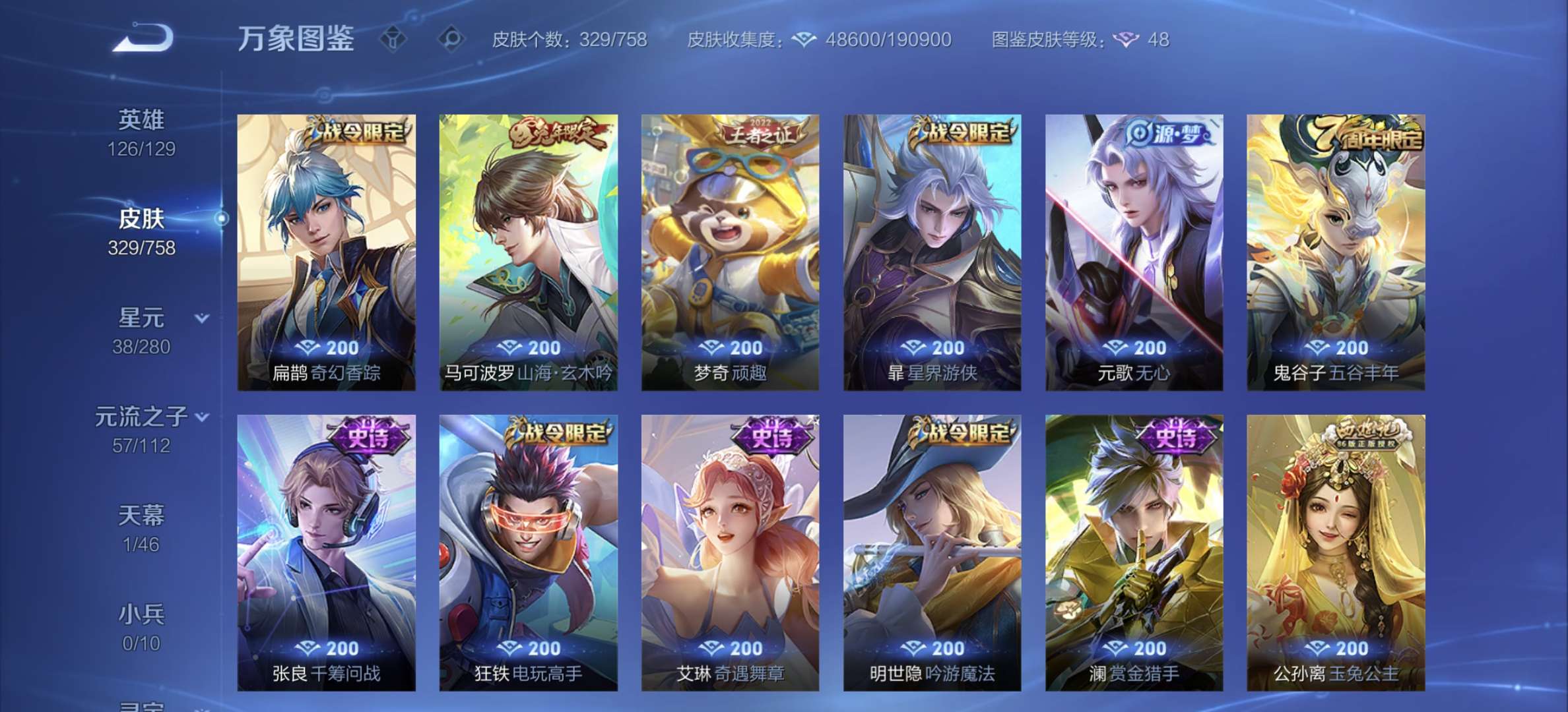 v8,329个皮肤,射手和战士皮肤超多,上过2100,发育路60段,对抗路34段,打野32段