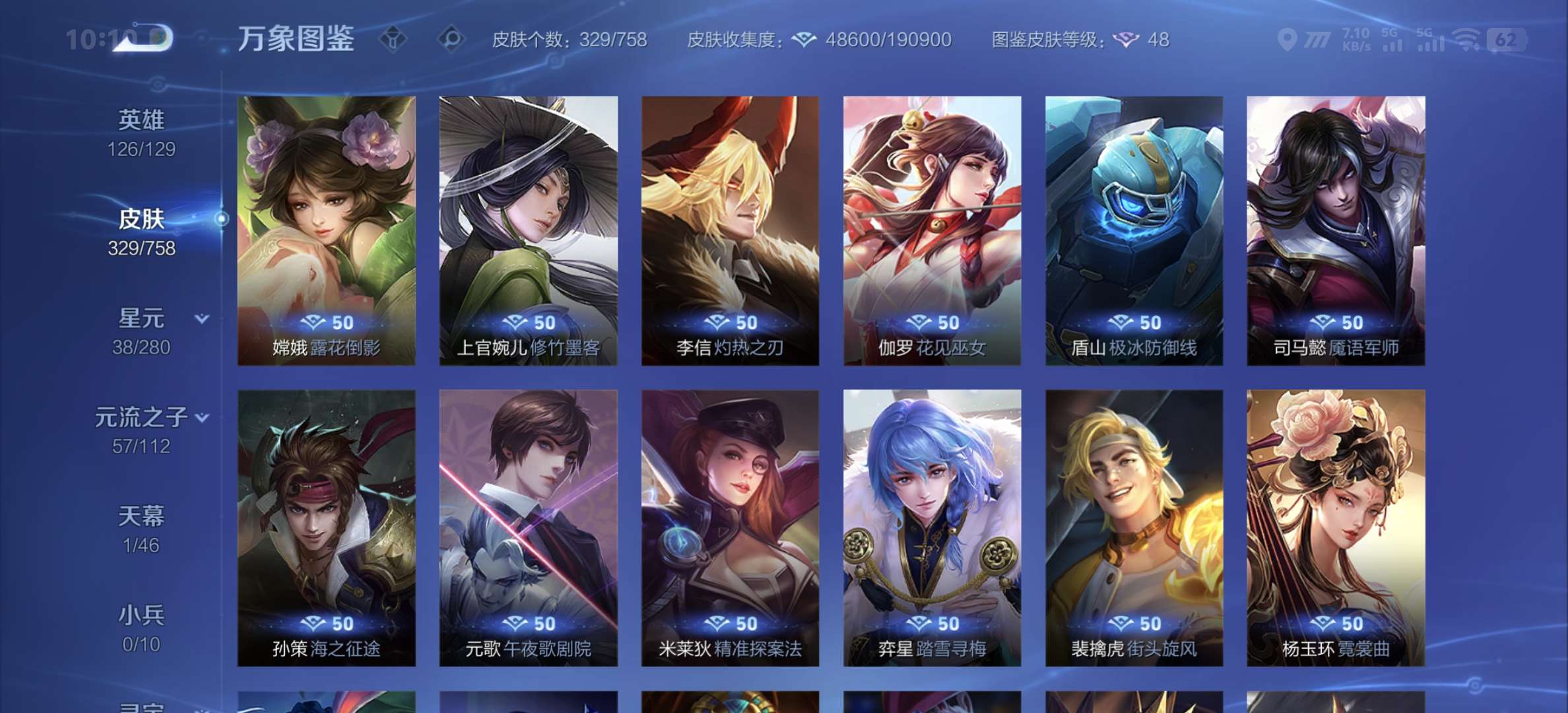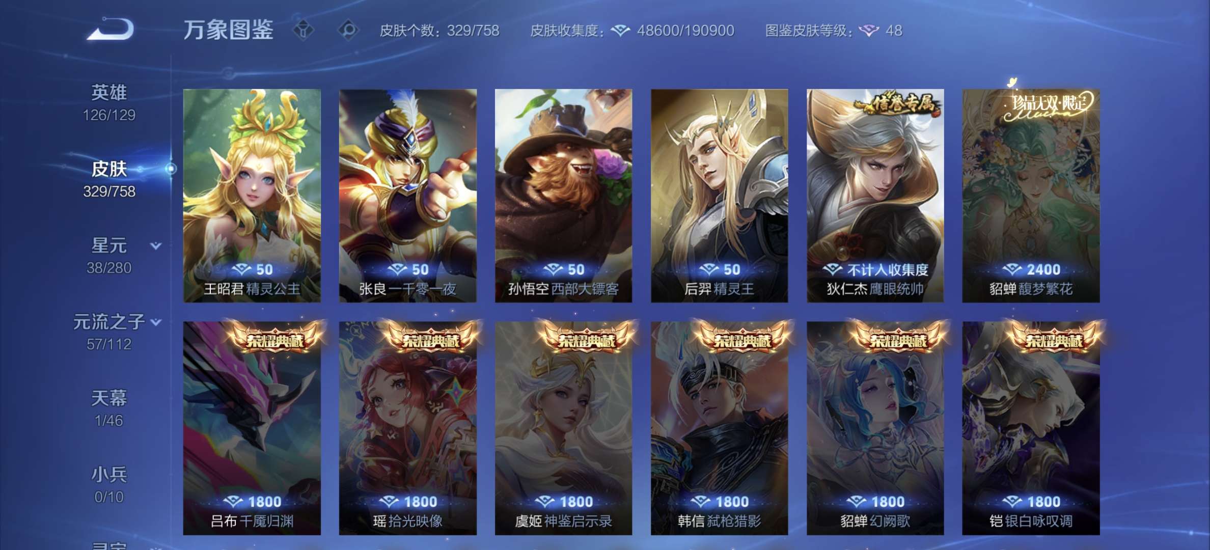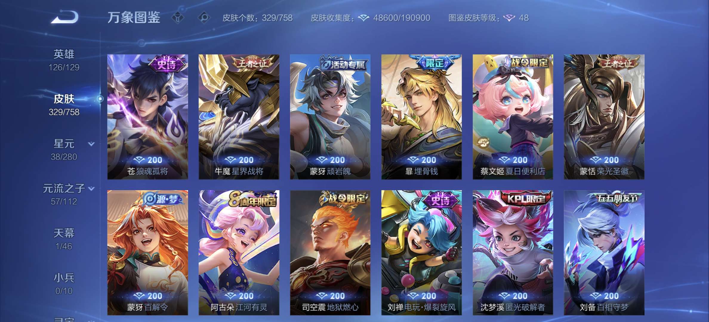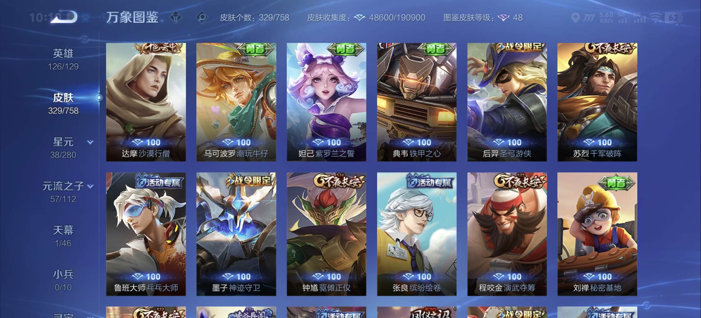 v8,329个皮肤,射手和战士皮肤超多,上过2100,发育路60段,对抗路34段,打野32段