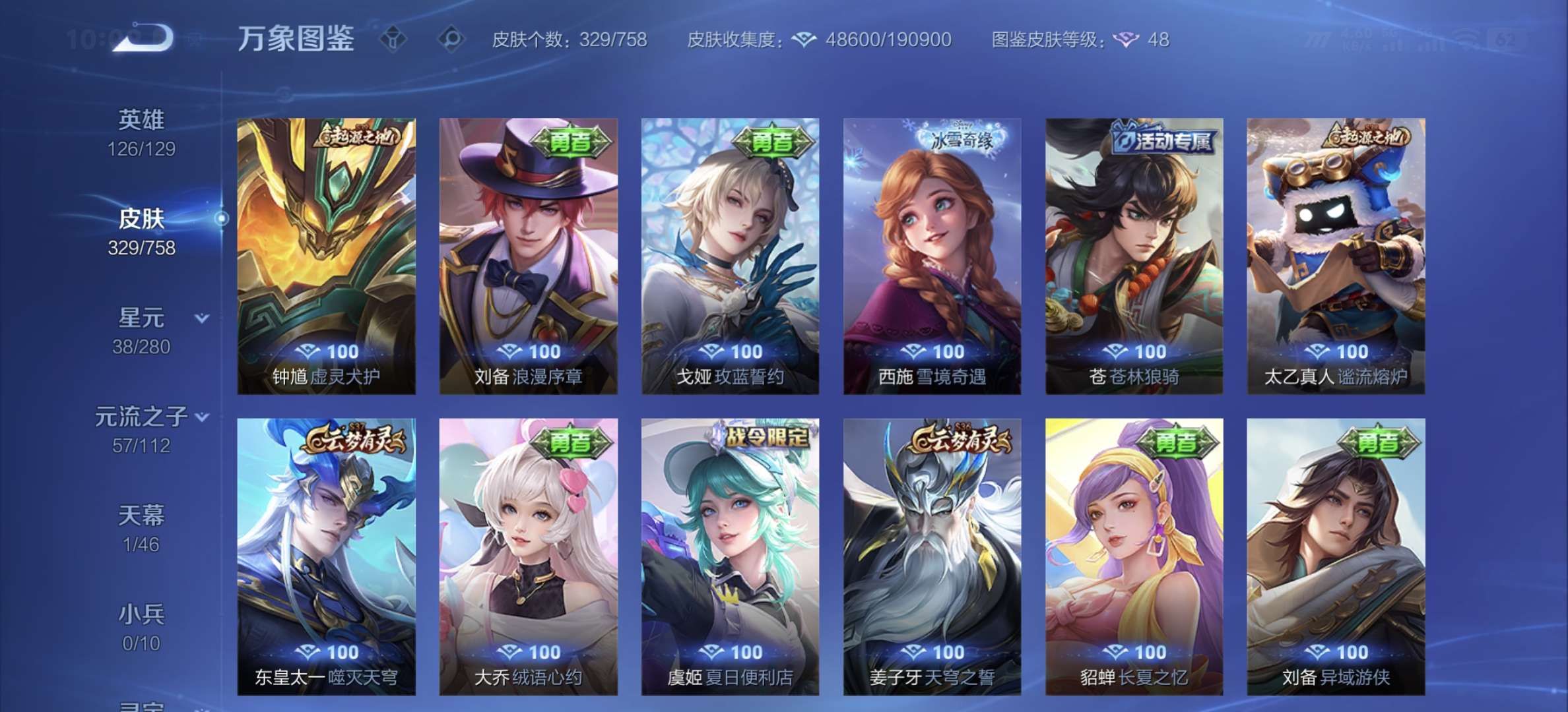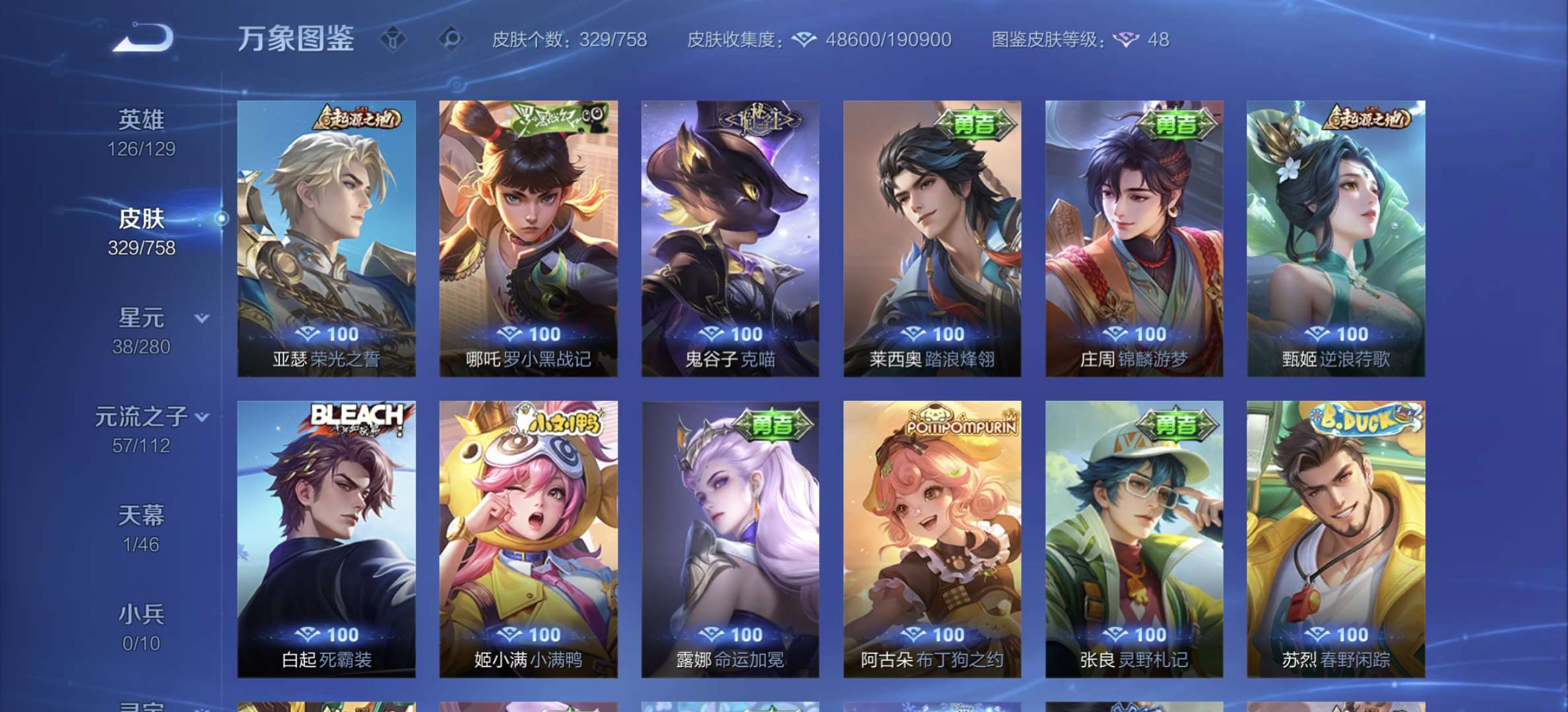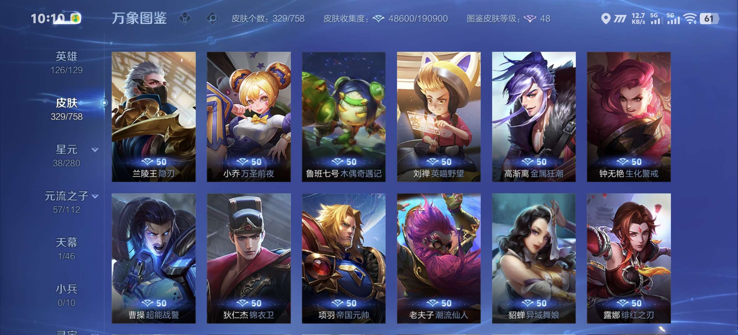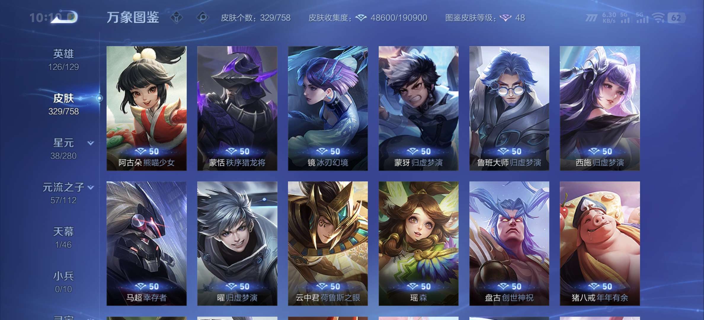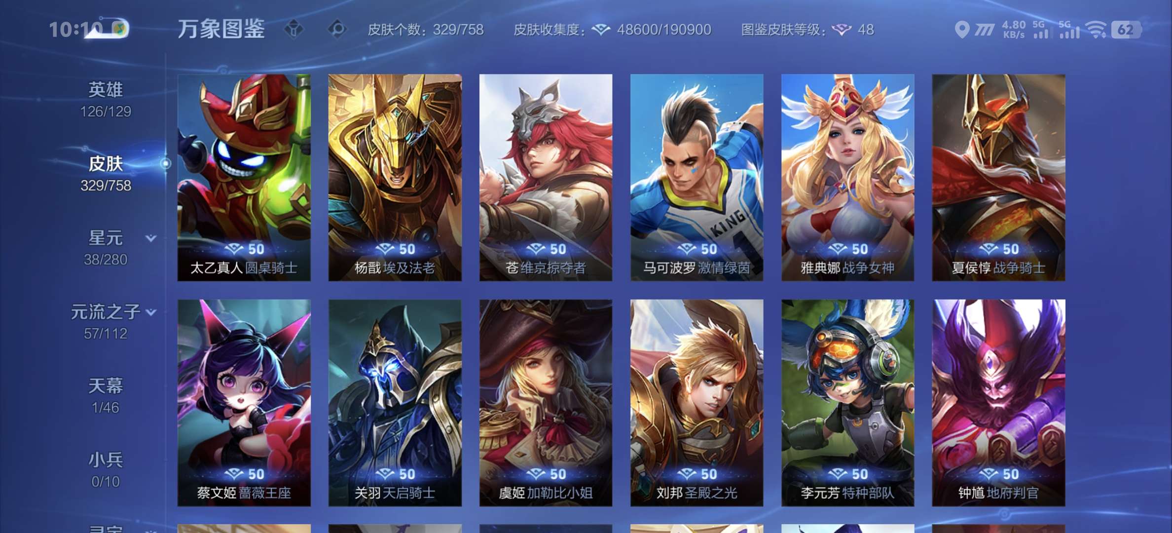 v8,329个皮肤,射手和战士皮肤超多,上过2100,发育路60段,对抗路34段,打野32段