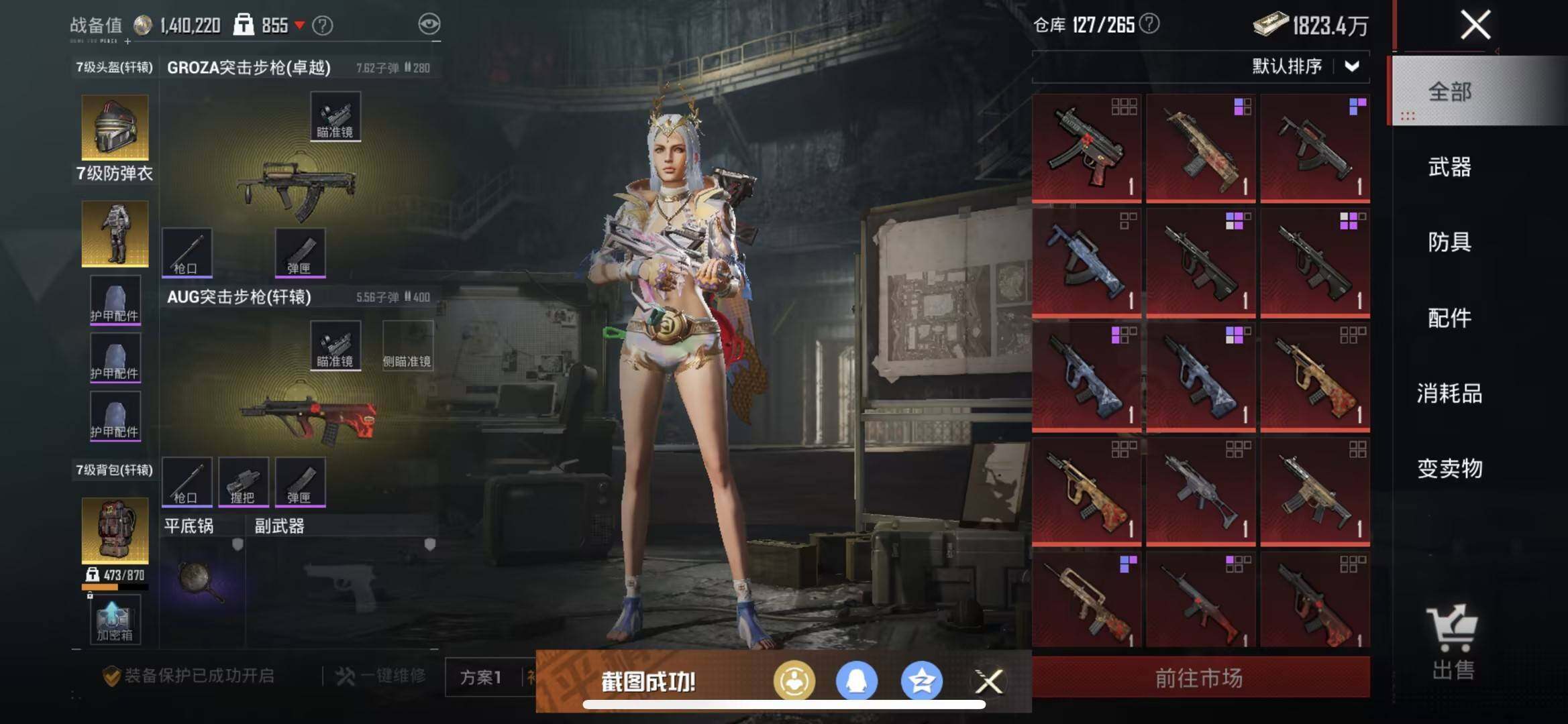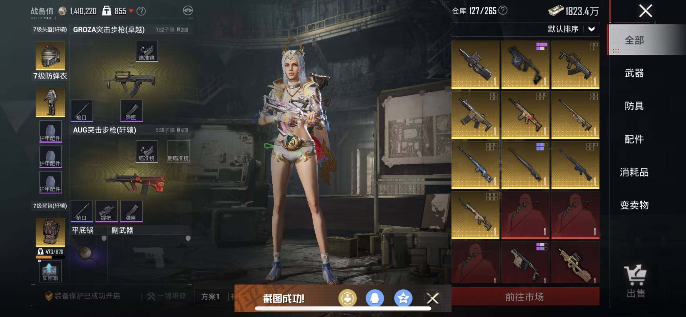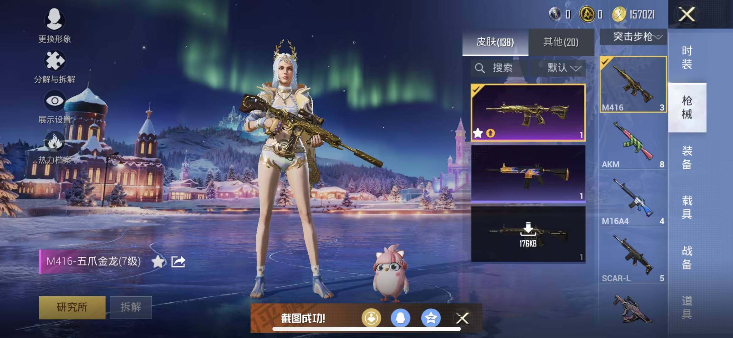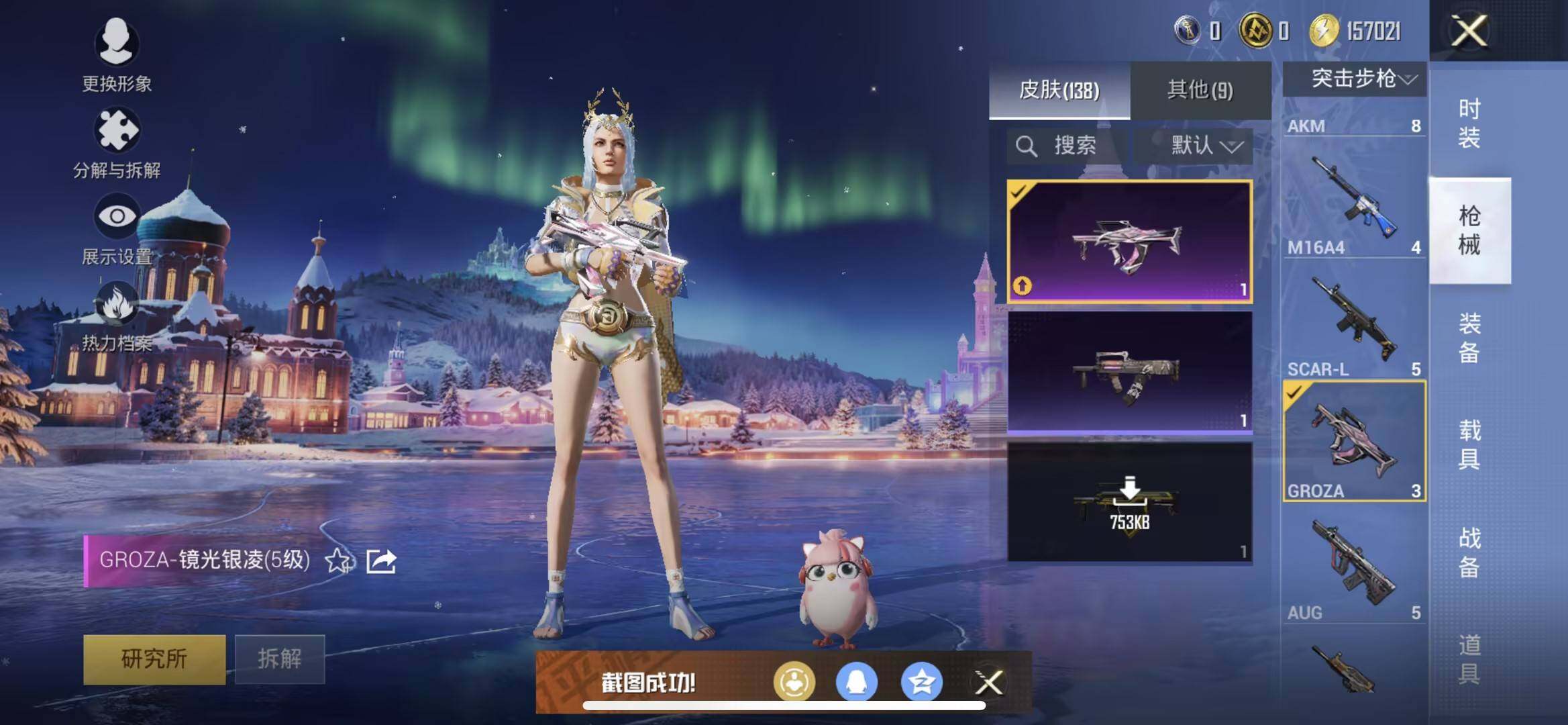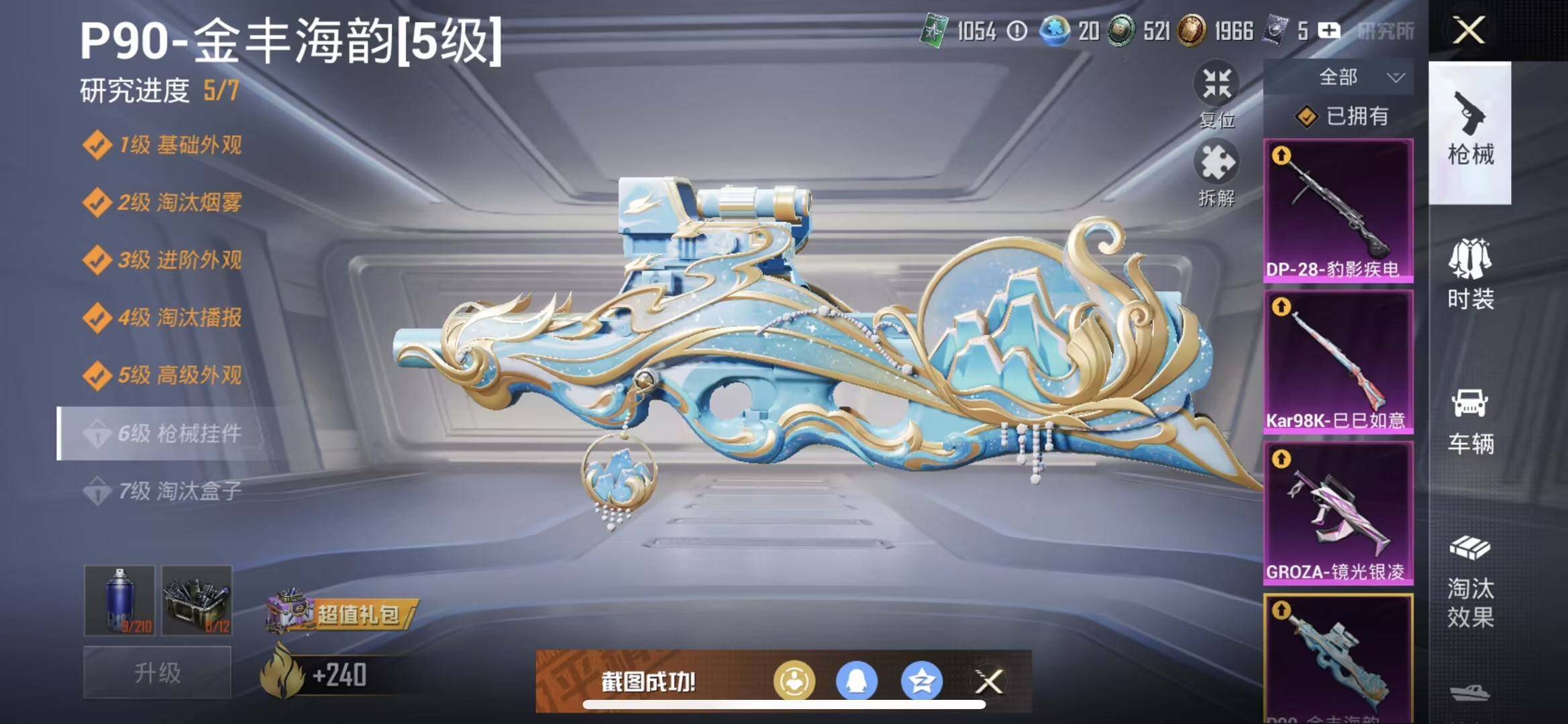 【粉色枪皮等级】:M416-五爪金龙(七级),GROZA-镜光银凌(五级),UMP45-量子极限(五级),P90-金丰海韵(五级),K