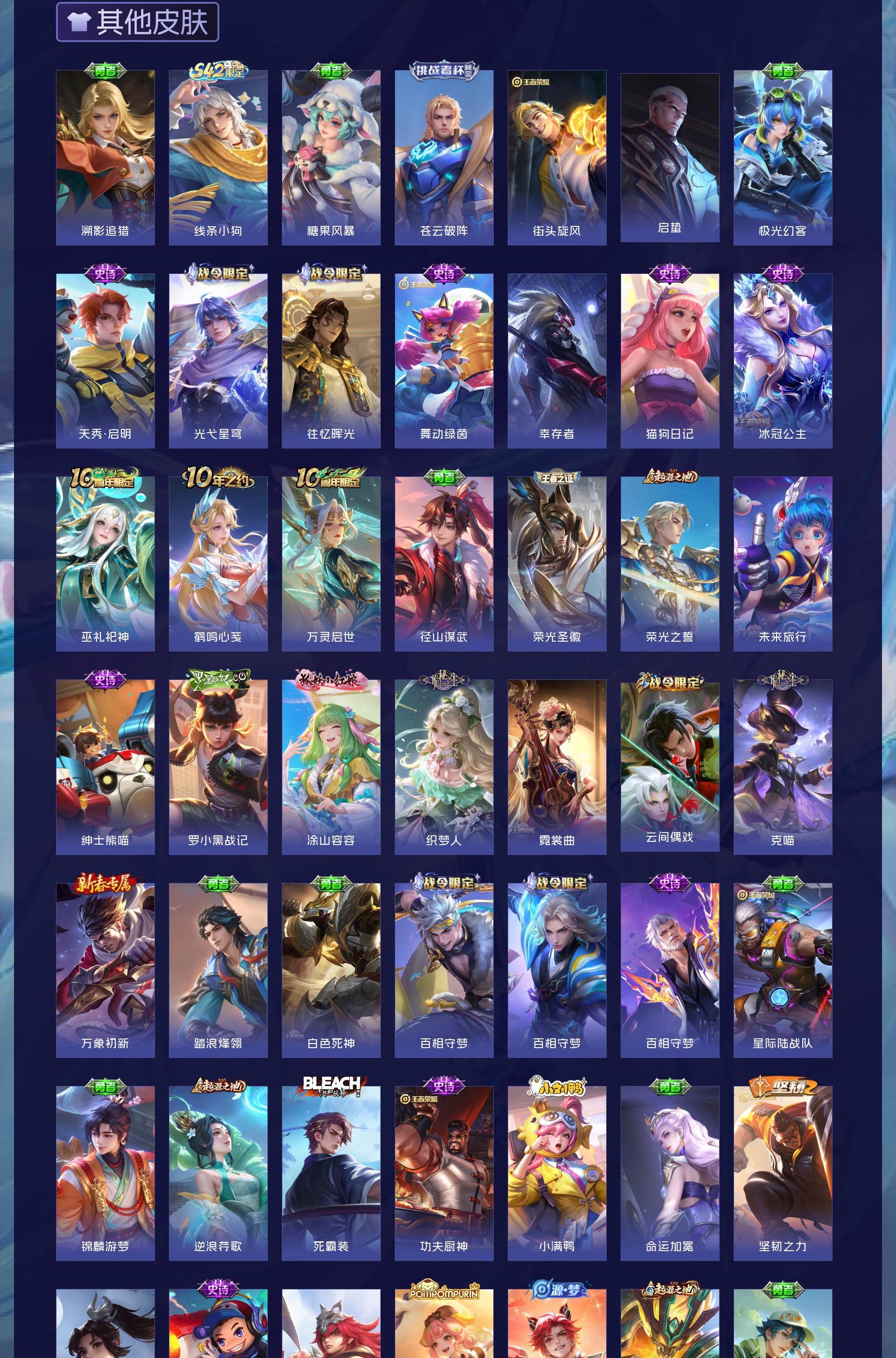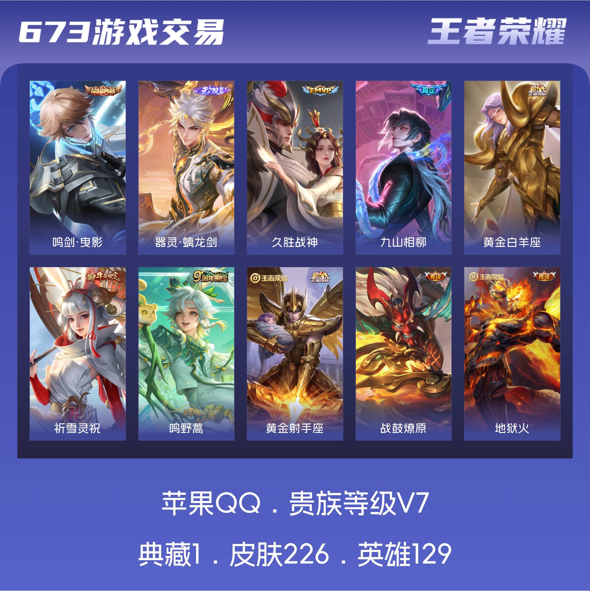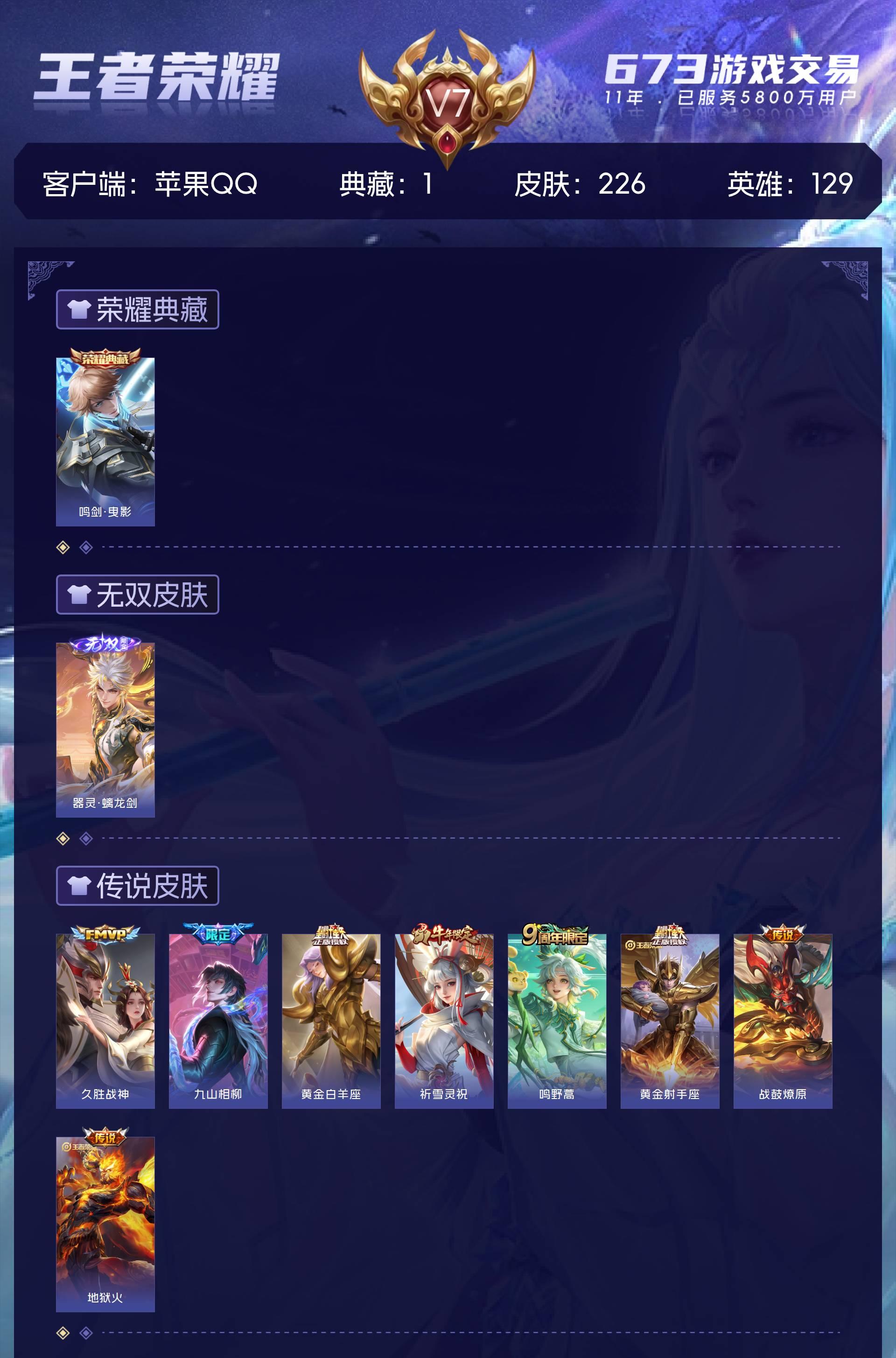 V7 皮肤226 英雄129 至尊星耀 荣耀典藏1 无双皮肤1 传说8 其他皮肤222