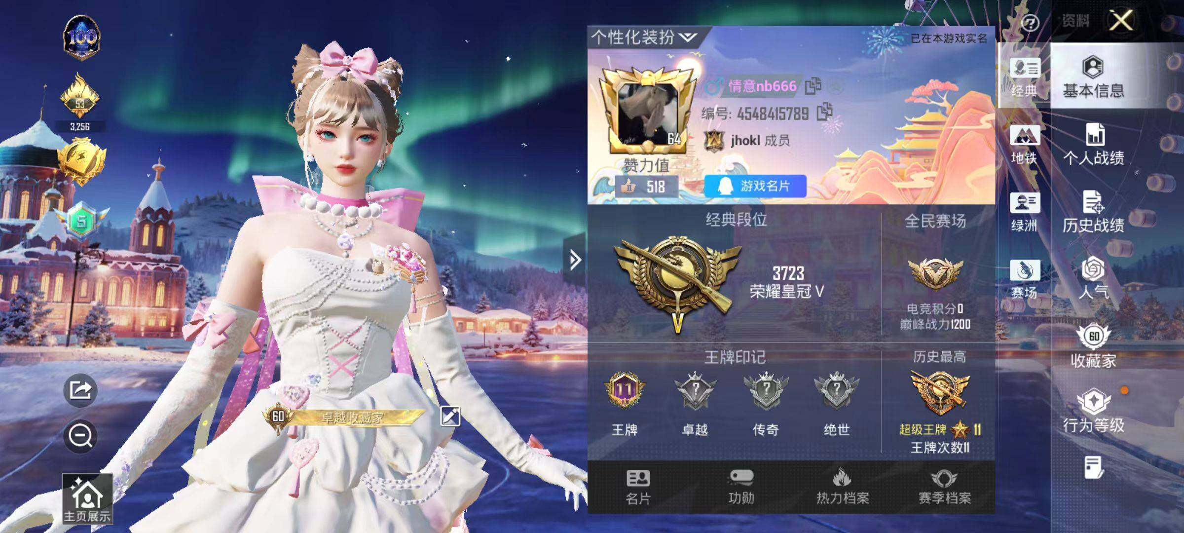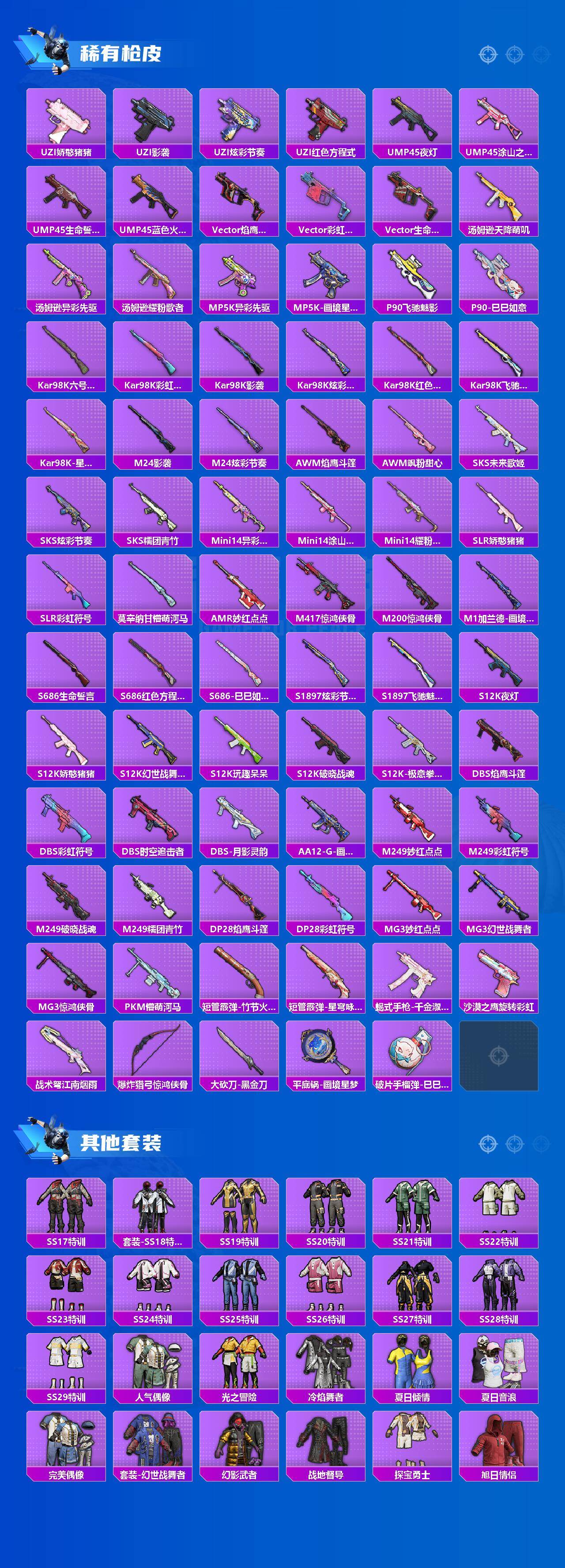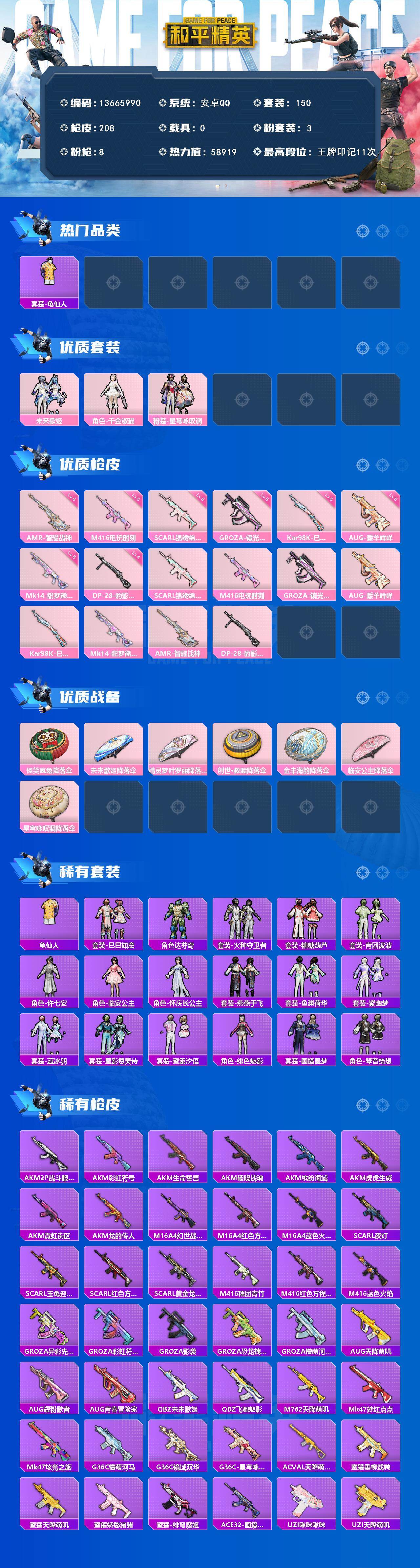 150套装/枪械8/装备224/战备146/王牌印记11/热力值58919/五级SCAR-L-锦绣绵绵/五级M416-电玩时刻/五级GROZA-镜光银凌/五级AUG-暖羊咩咩/五级Kar98K-巳巳如意/五级Mk14-甜梦熊击/六级AMR-智耀战神/四级DP-28-豹影疾电/套装-龟仙人/未来歌姬/角色-千金淑猫/粉装-星穹咏叹调/SCAR-L-锦绣绵绵/M416-电玩时刻/GROZA-镜光银凌