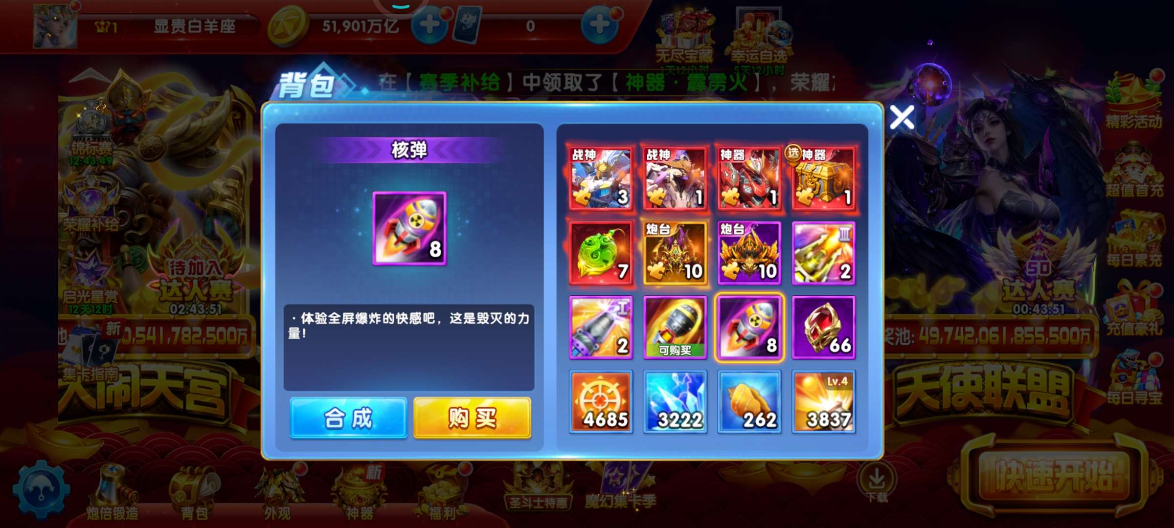 519万亿 60炮 带滋炮台 巅峰10级 加速翅膀9天 4级狂2天 狂暴3837 核弹8 激光4