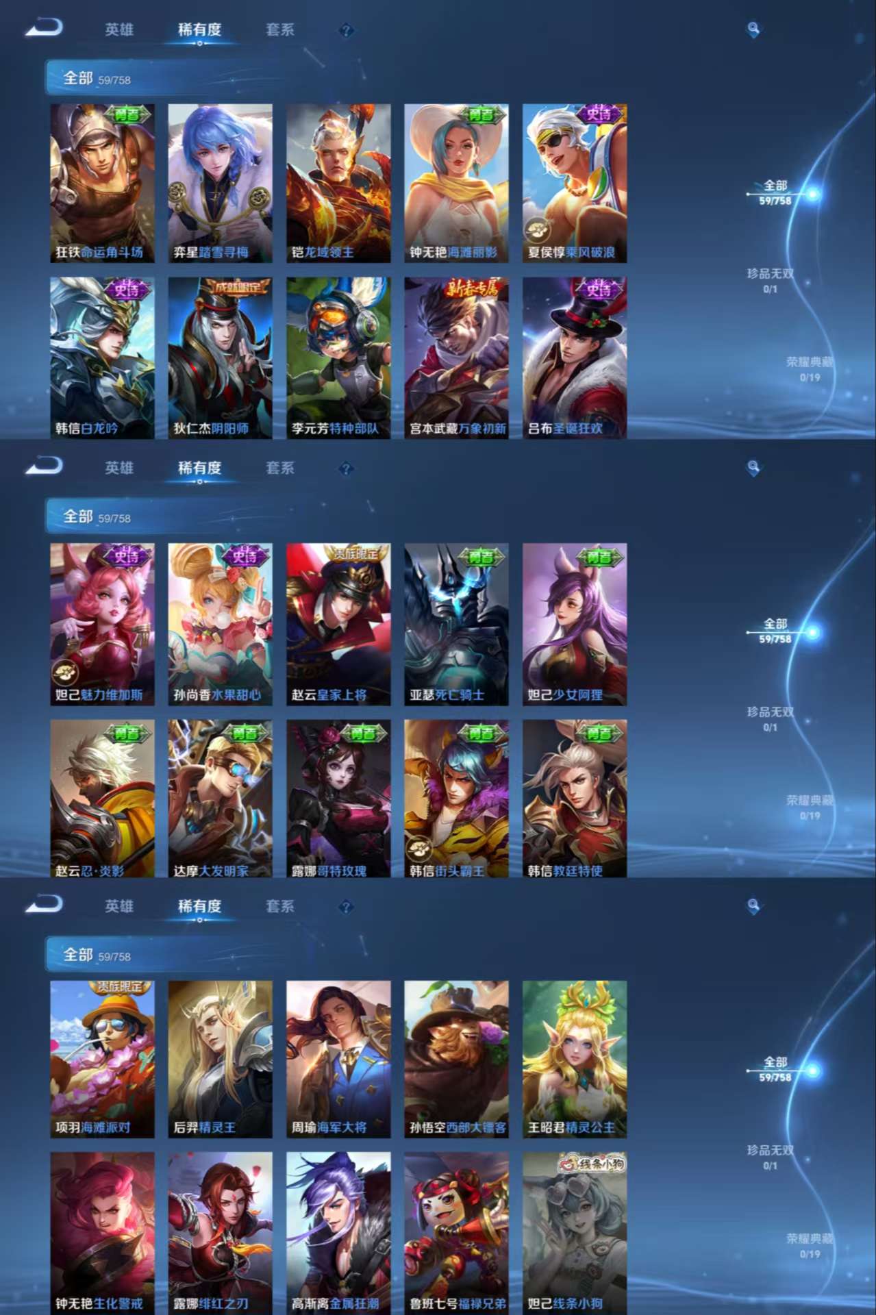 【史诗皮肤】 魅力维加斯 鹰眼统帅 大圣娶亲 孙行者 李小龙 傲雪梅枪 神威 皇家上将 圣诞狂欢 白龙吟 航海奇遇记 青龙志 水果甜心 乘风破浪