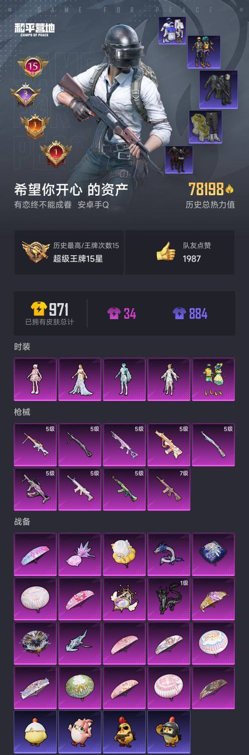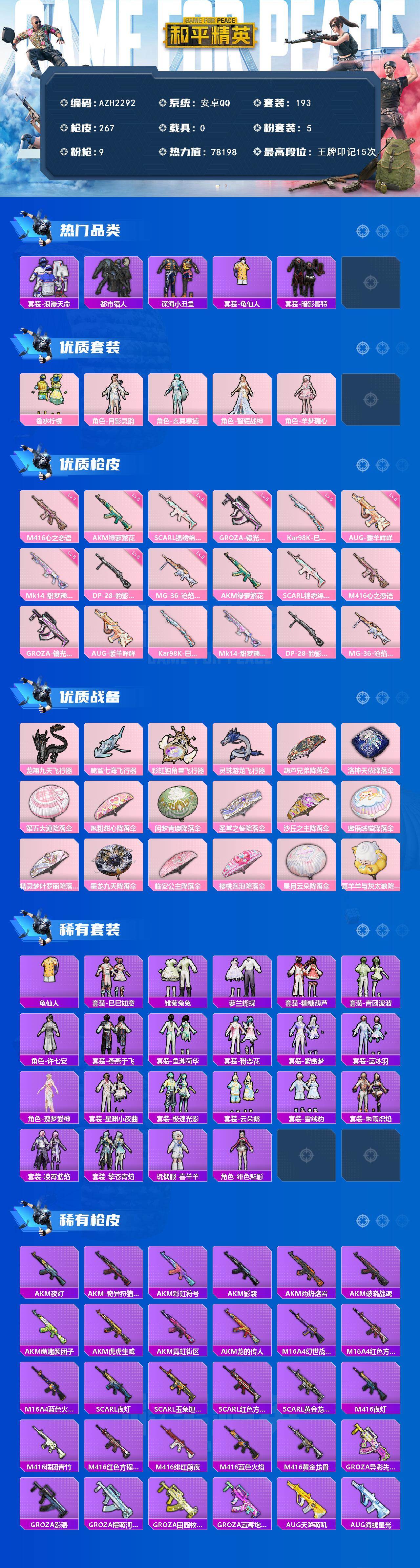 【AZH2292】安卓 手Q【15印记 羊梦糖心 都市暗影哥特深海小丑鱼 满级心之恋语M416】5粉装-9特效枪-0载具-5粉色飞行器-78198热力值-15王牌印记-193套装-267枪皮