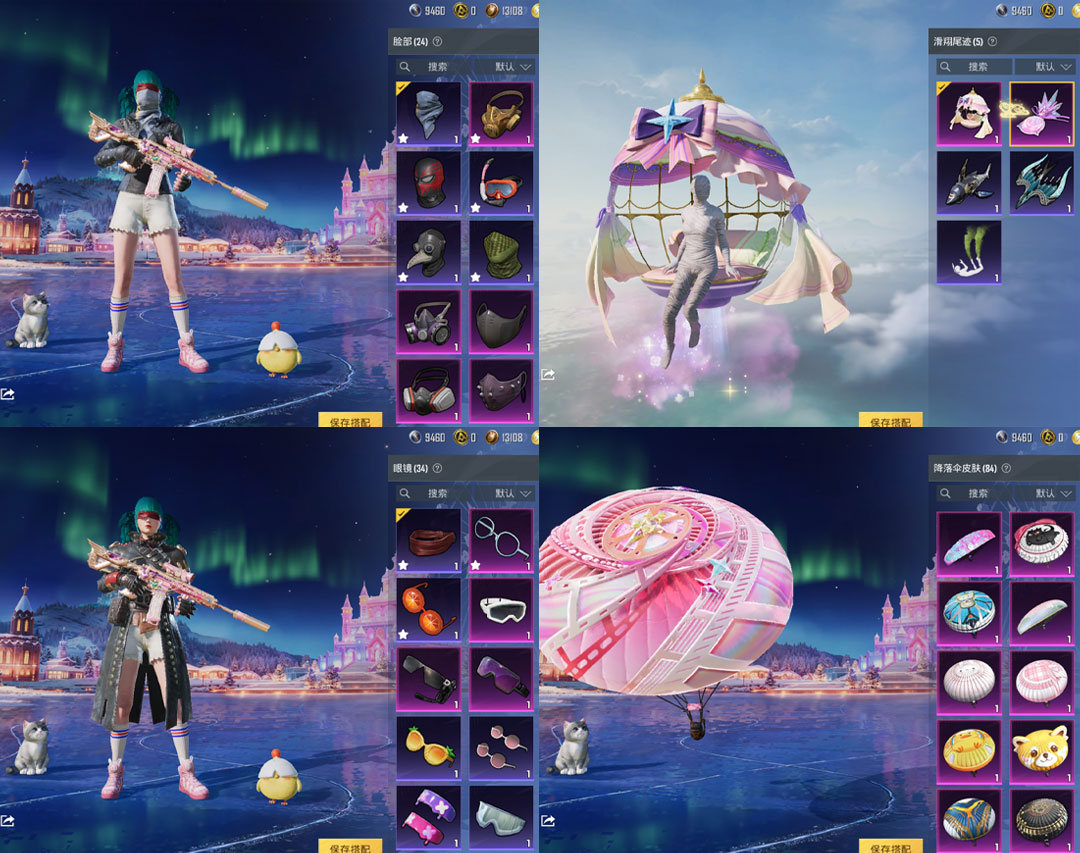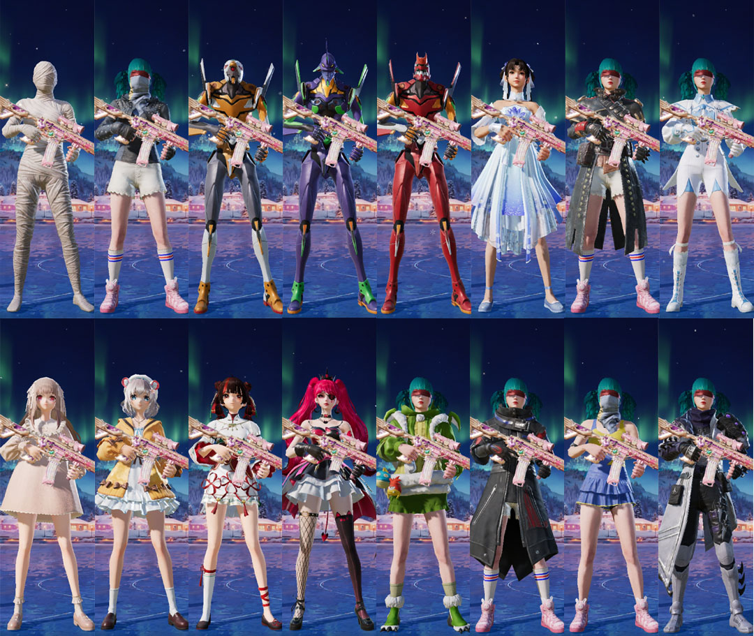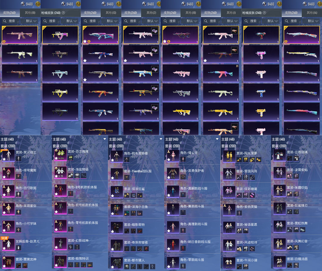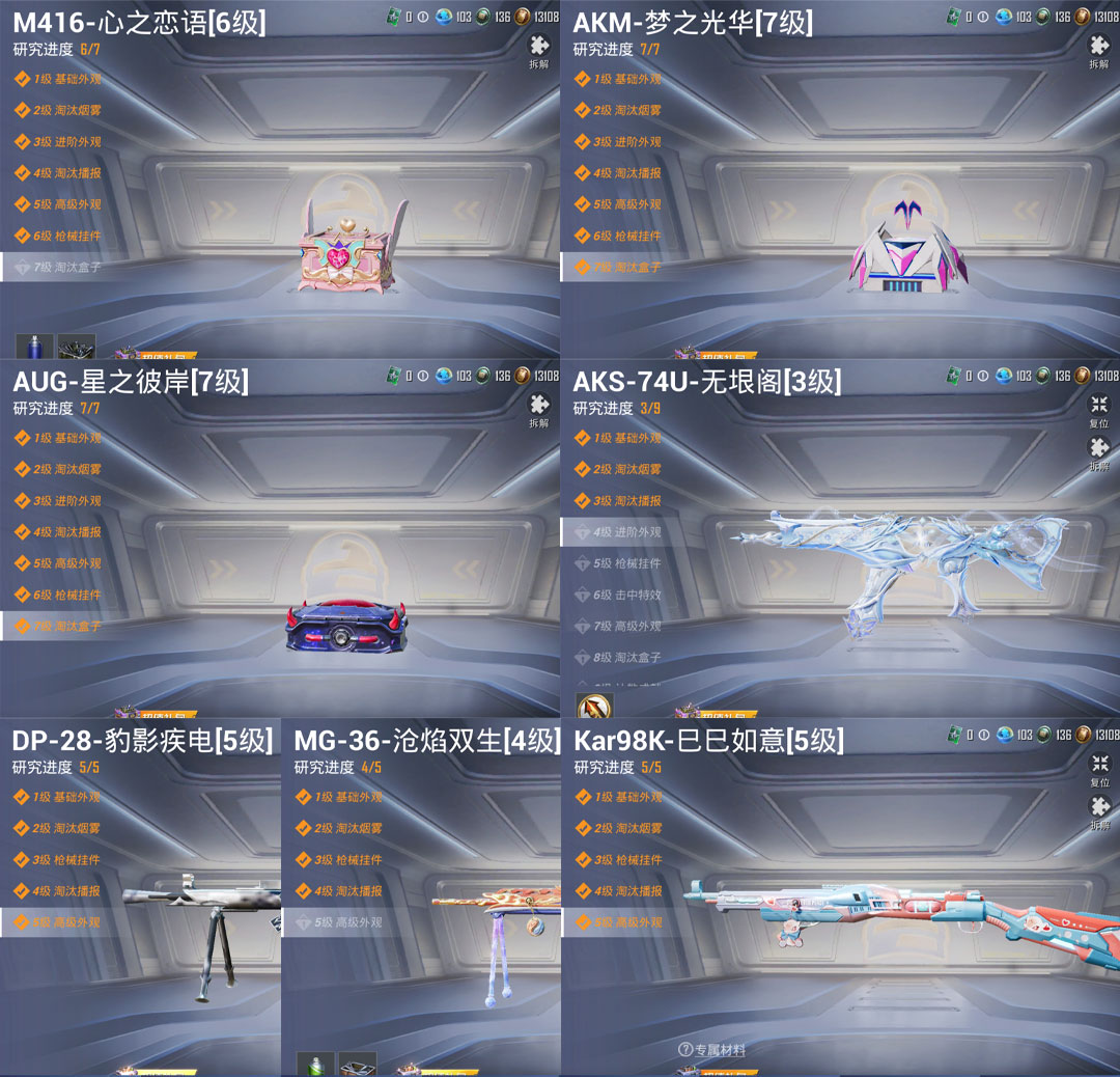 特效枪7:M416-心之恋语-6级,AKM-梦之光华-7级, AUG-星之彼岸-7级 , AKS-74U-无垠阁3级,Kar98K-巳巳如意-5级, DP-28-豹影疾电-5级 ,MG-36-沧焰双生-4级 ,