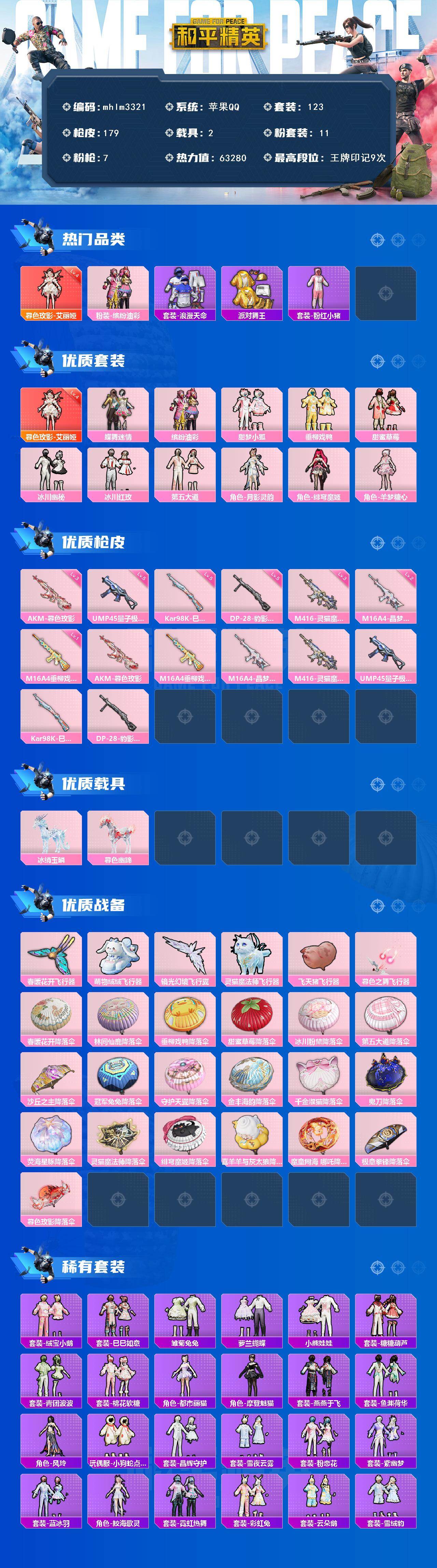【mhlm3321】苹果 手Q-1神装-11粉装-7特效枪-2载具-9粉色飞行器-63280热力值-9王牌印记-123套装-179枪皮