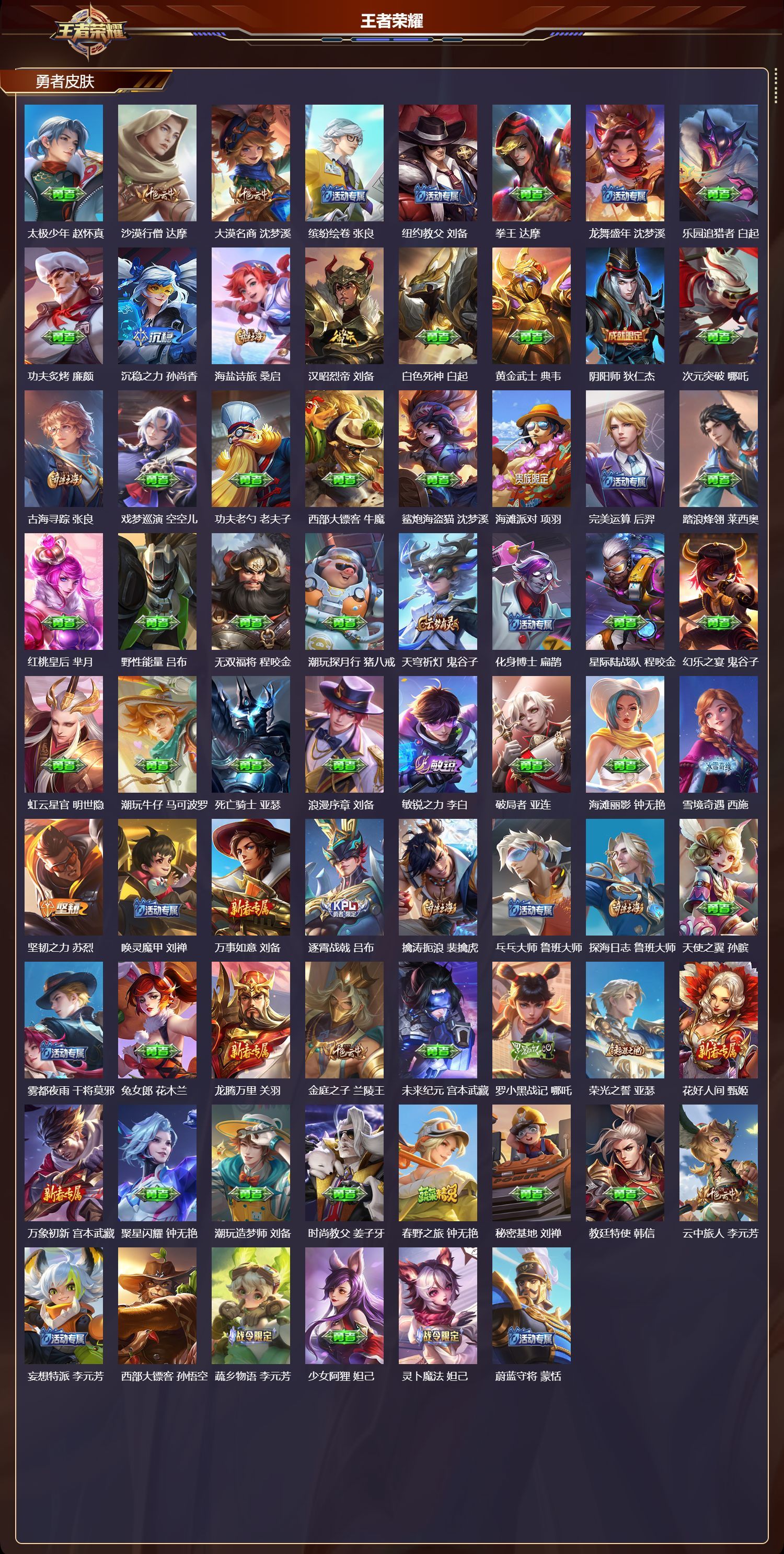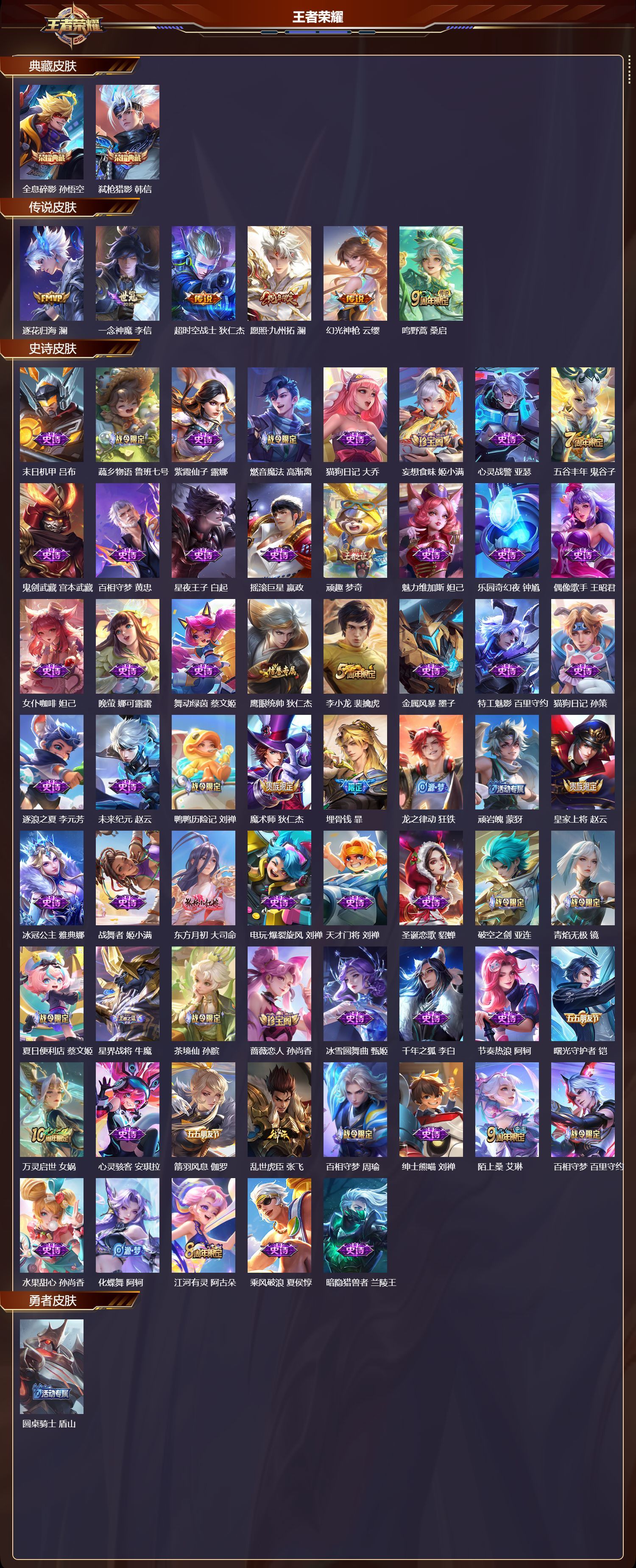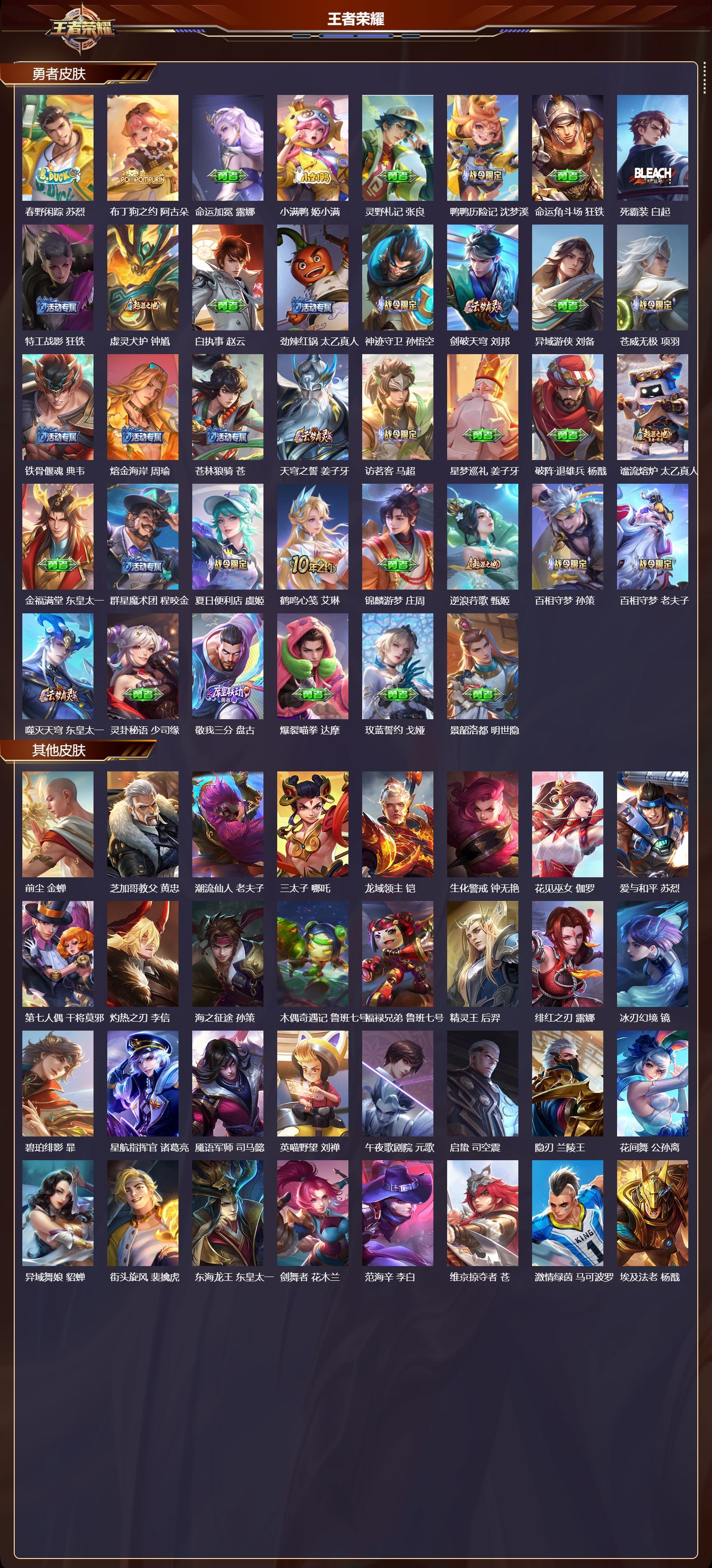 安卓QQ/绝世王者/229皮肤/125英雄/2典藏/0珍品无双/0无双/0珍品传说/6传说/61史诗