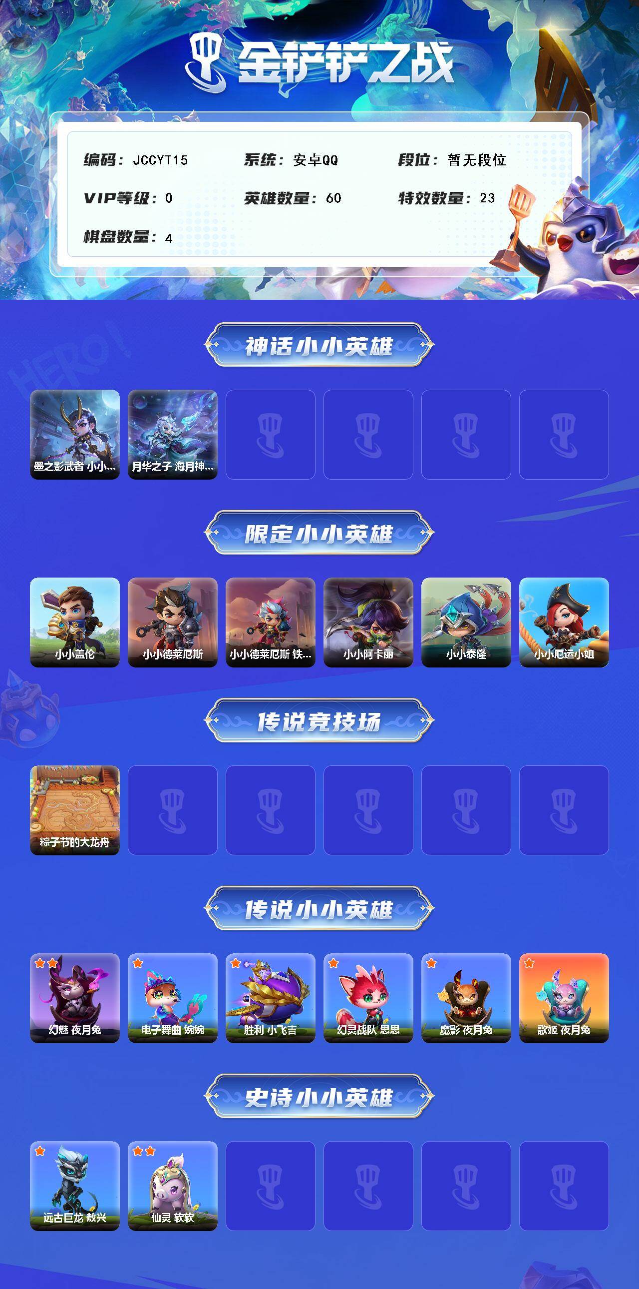 【JCCYT15】1神话/60小小英雄/4棋盘/墨之影武者 小小永恩/月华之子 海月神 小小佛耶戈/小小盖伦/小小德莱厄斯/小小德莱厄斯 铁血将军/小小阿卡丽/小小泰隆/小小厄运小姐/粽子节的大龙舟/幻魅 夜月兔/电子舞曲 婉婉/胜利 小飞吉/幻灵战队 思思/魔影 夜月兔/歌姬 夜月兔/远古巨龙 敖兴/仙灵 软软