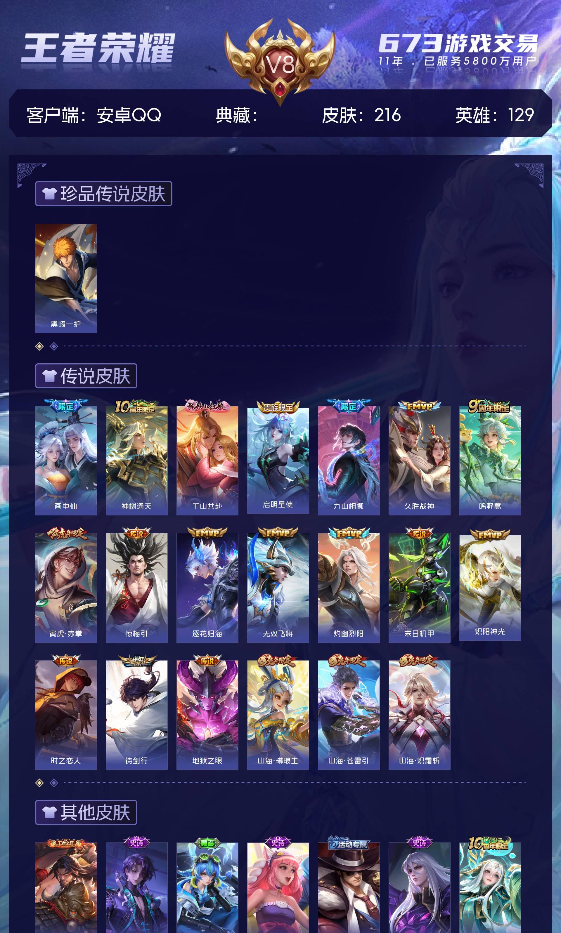 V8 皮肤216 英雄129 永恒钻石 珍品传说1 传说20 其他皮肤199