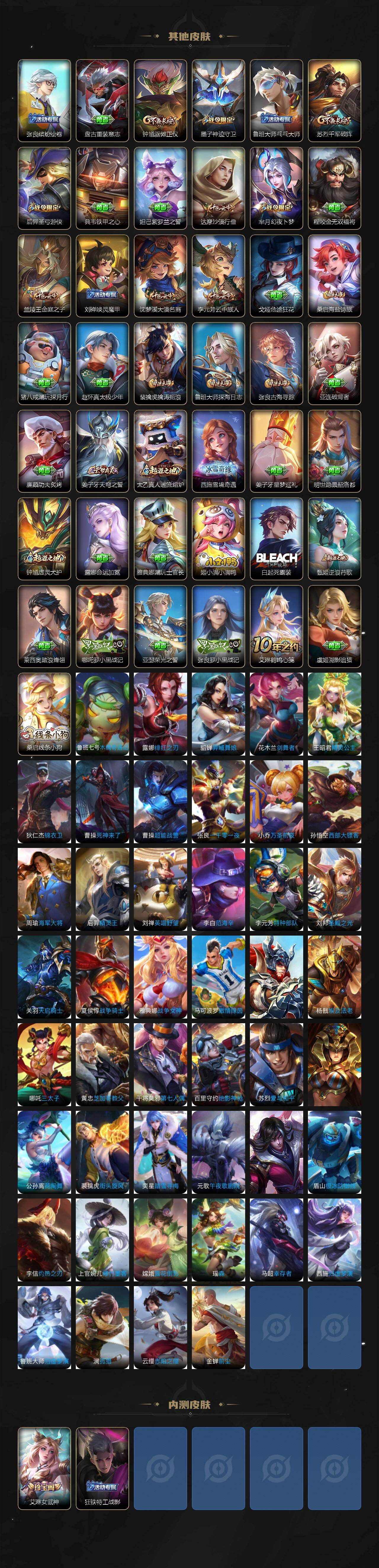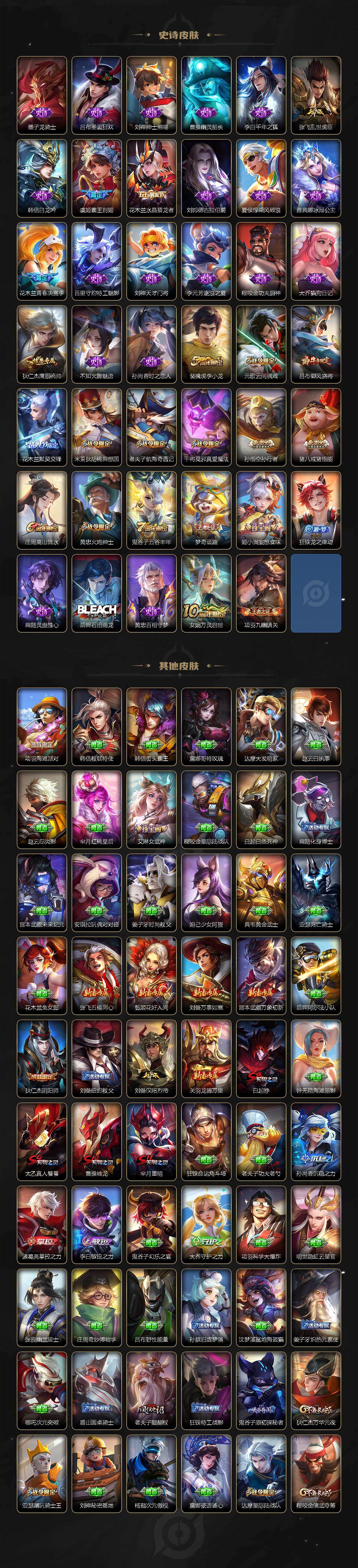 【限定皮肤】:白起狰,姜子牙天穹之誓,狄仁杰阴阳师,赵云皇家上将,墨子神迹守卫,庄周高山流水,芈月重明,芈月幻夜卜梦,吕布御风骁将,元歌云间偶戏,曹操烛龙,狄仁杰魔术师,狄仁杰万华元夜,达摩星