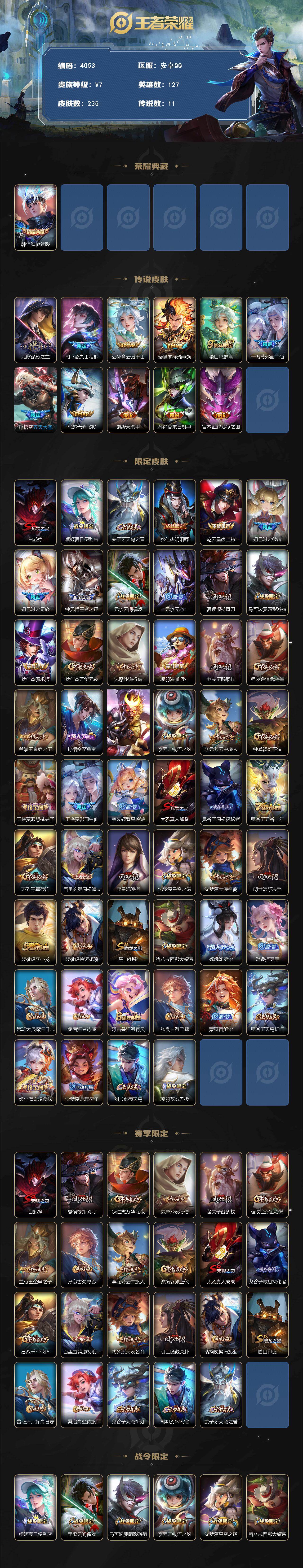 安卓Q-V7-至尊星耀III段位-127英雄-235皮肤-1典藏皮肤-11传说-64史诗