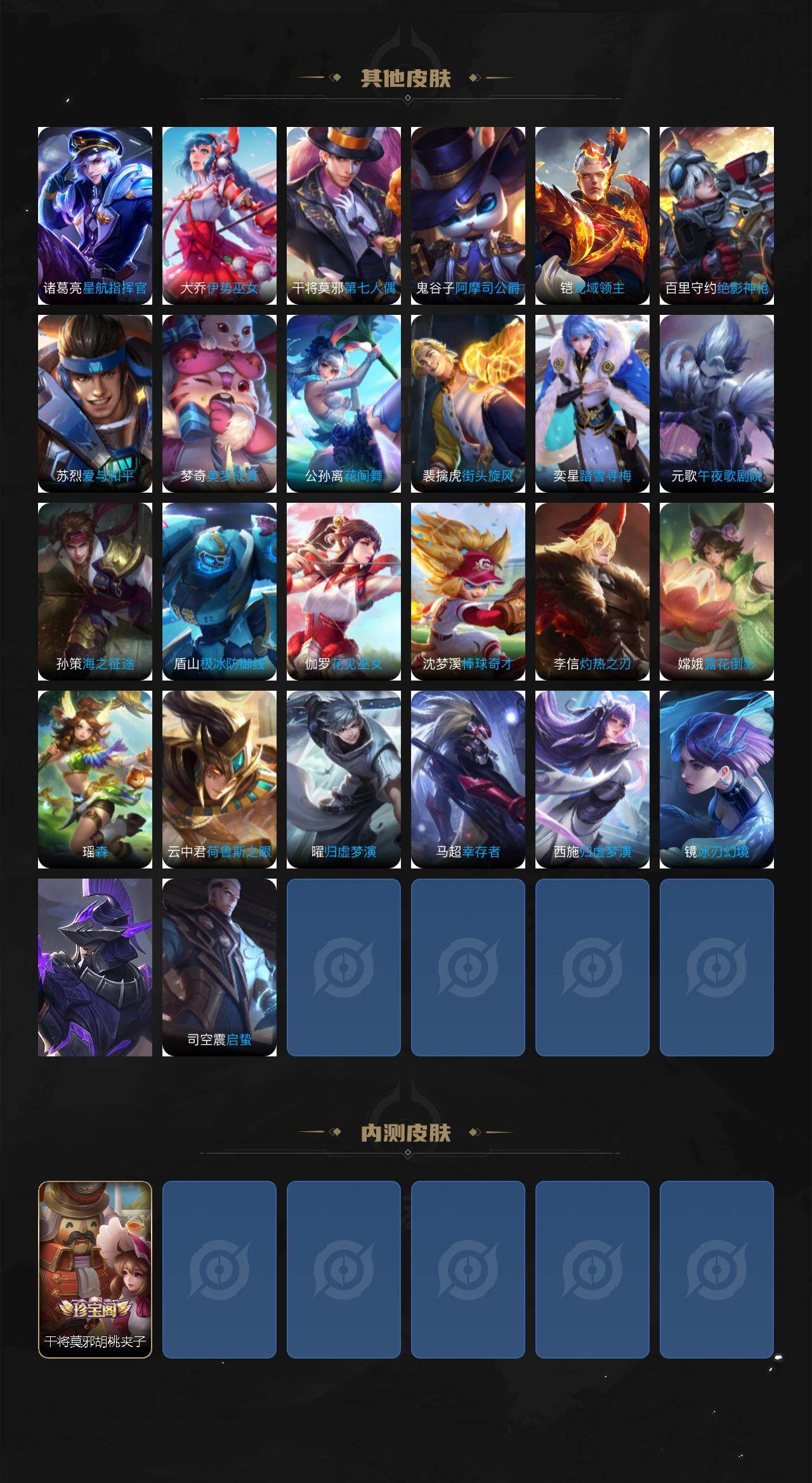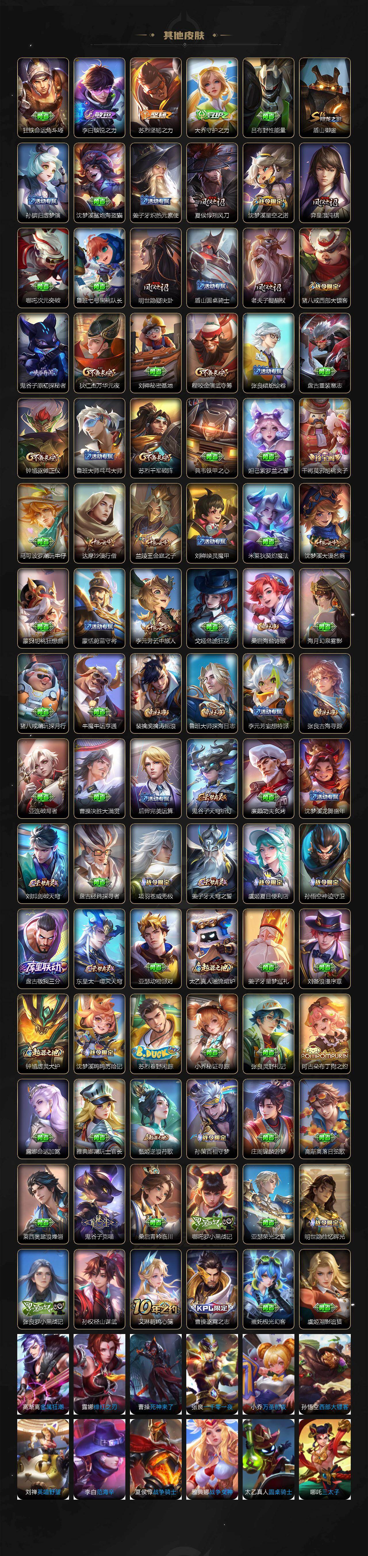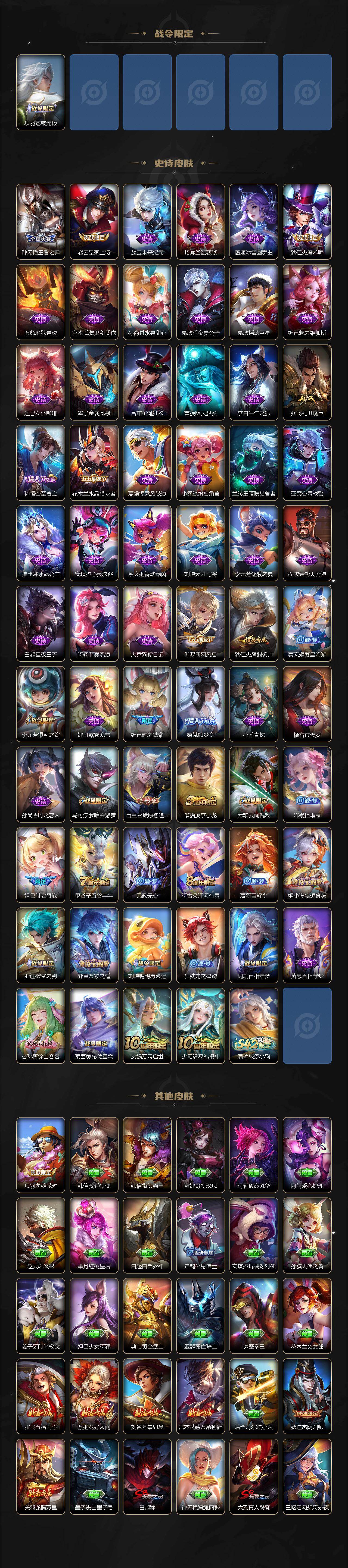 【传说皮肤】:元歌诡秘之主,司马懿九山相柳,公孙离云诺千山,裴擒虎祥瑞亨通,桑启鸣野蒿,干将莫邪画中仙,孙悟空齐天大圣,马超无双飞将,铠绛天战甲,孙尚香末日机甲,宫本武藏地狱之眼