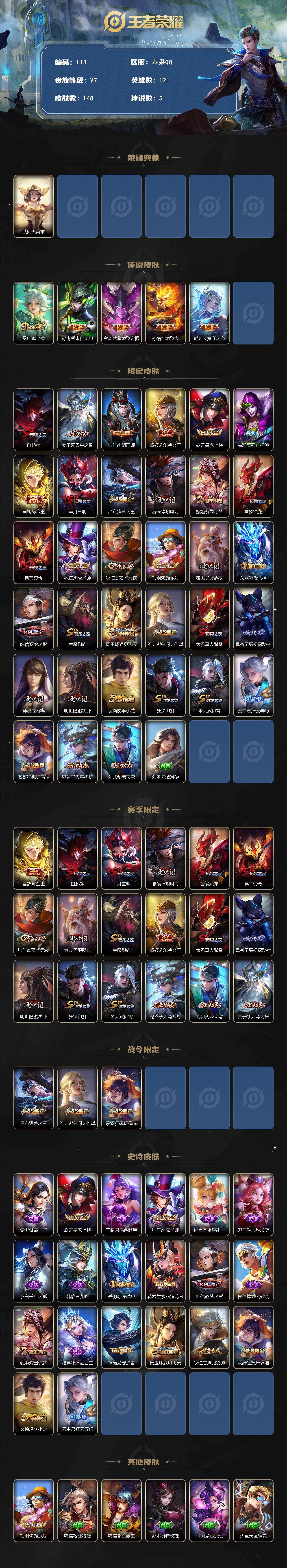 苹果Q-V7-尊贵铂金II段位-121英雄-148皮肤-1典藏英雄-5传说-20史诗