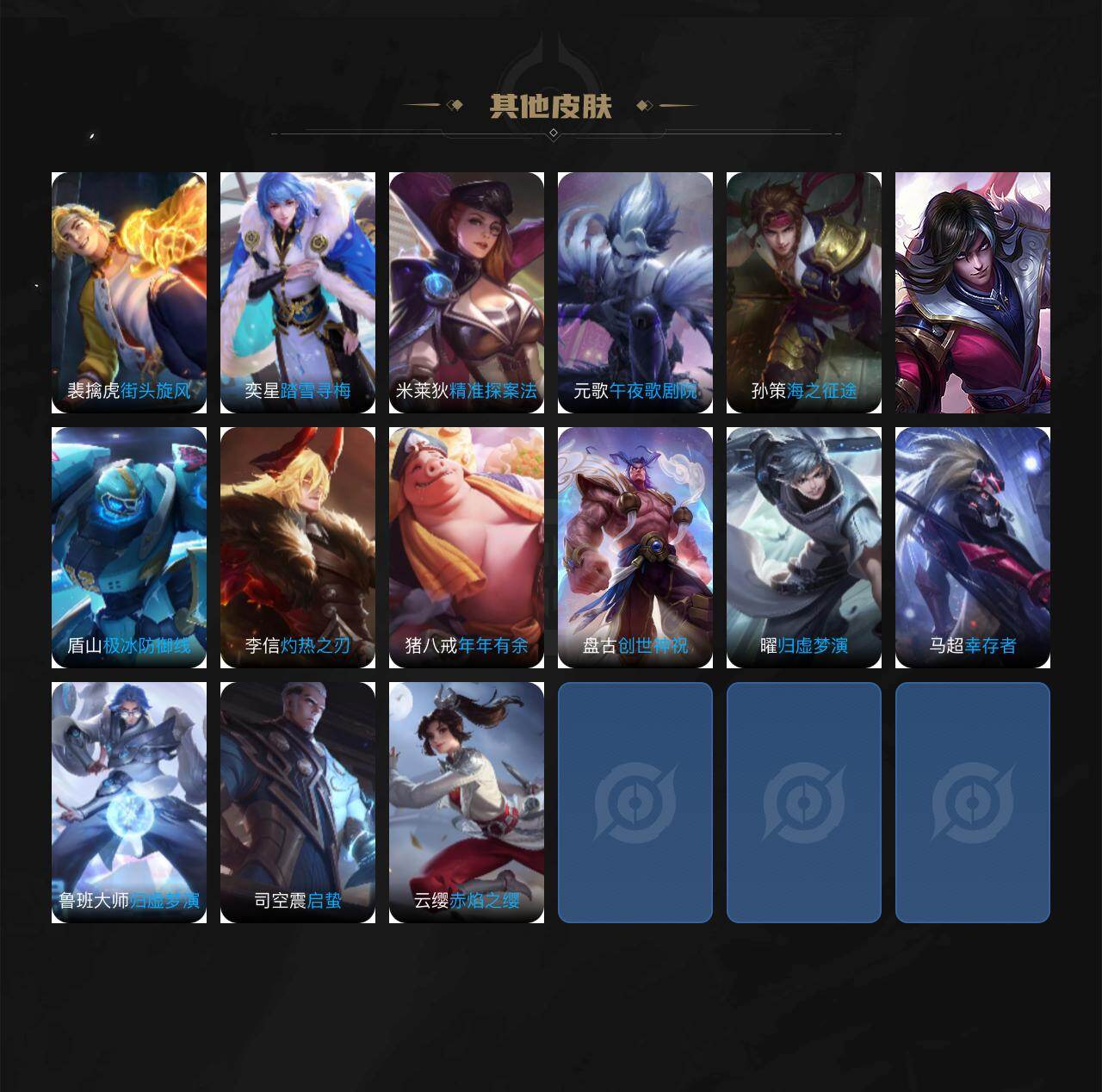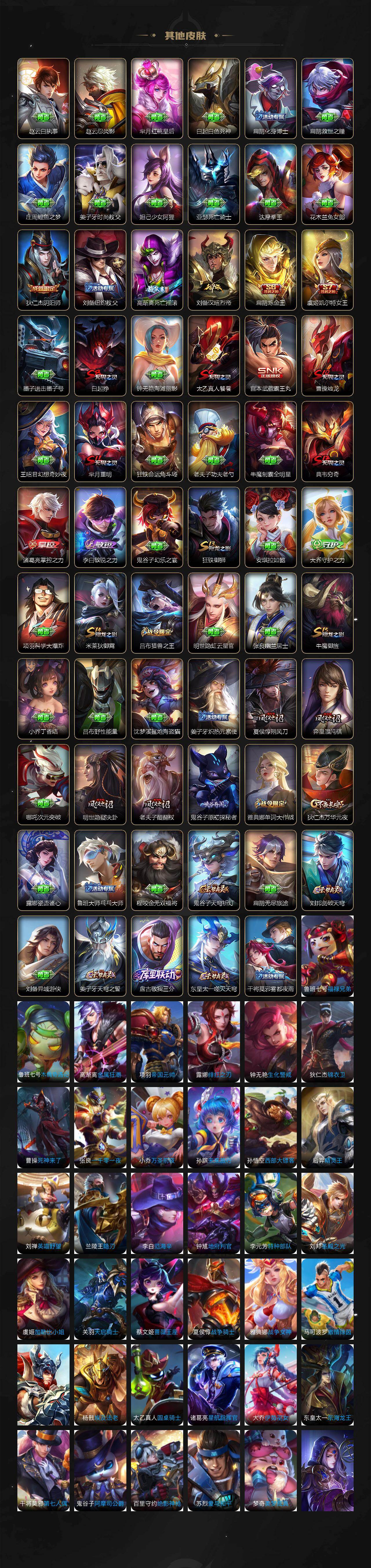 【限定皮肤】:白起狰,姜子牙天穹之誓,狄仁杰阴阳师,虞姬凯尔特女王,赵云皇家上将,高渐离死亡摇滚,扁鹊炼金王,芈月重明,吕布猎兽之王,夏侯惇朔风刀,甄姬