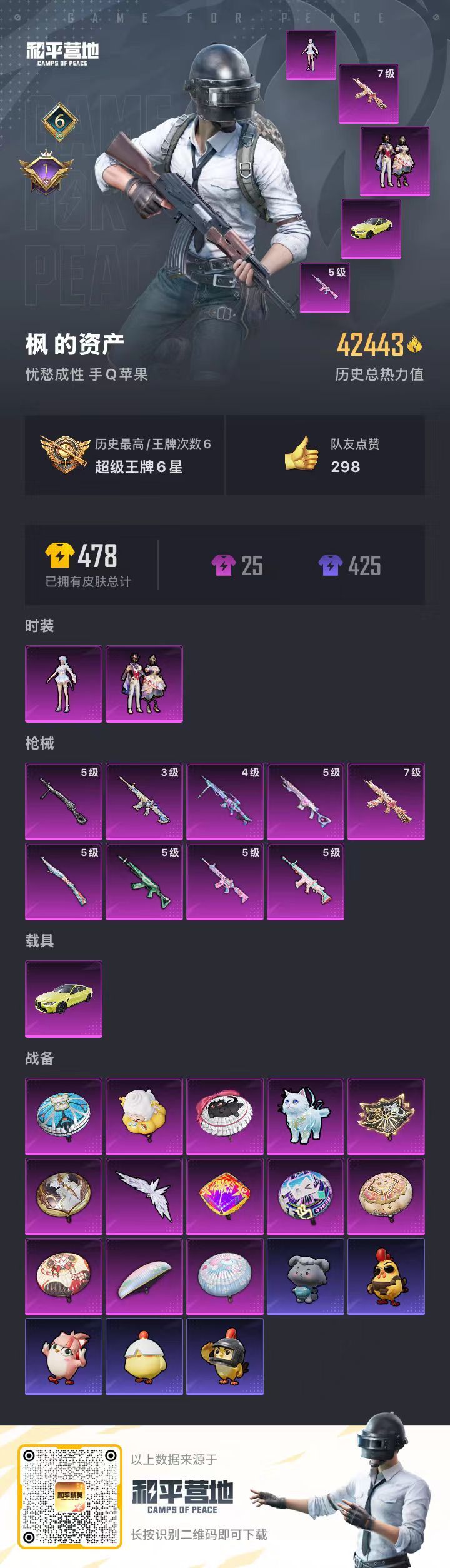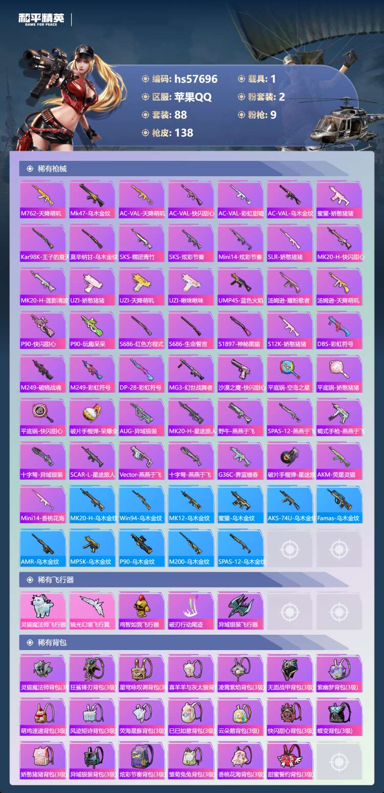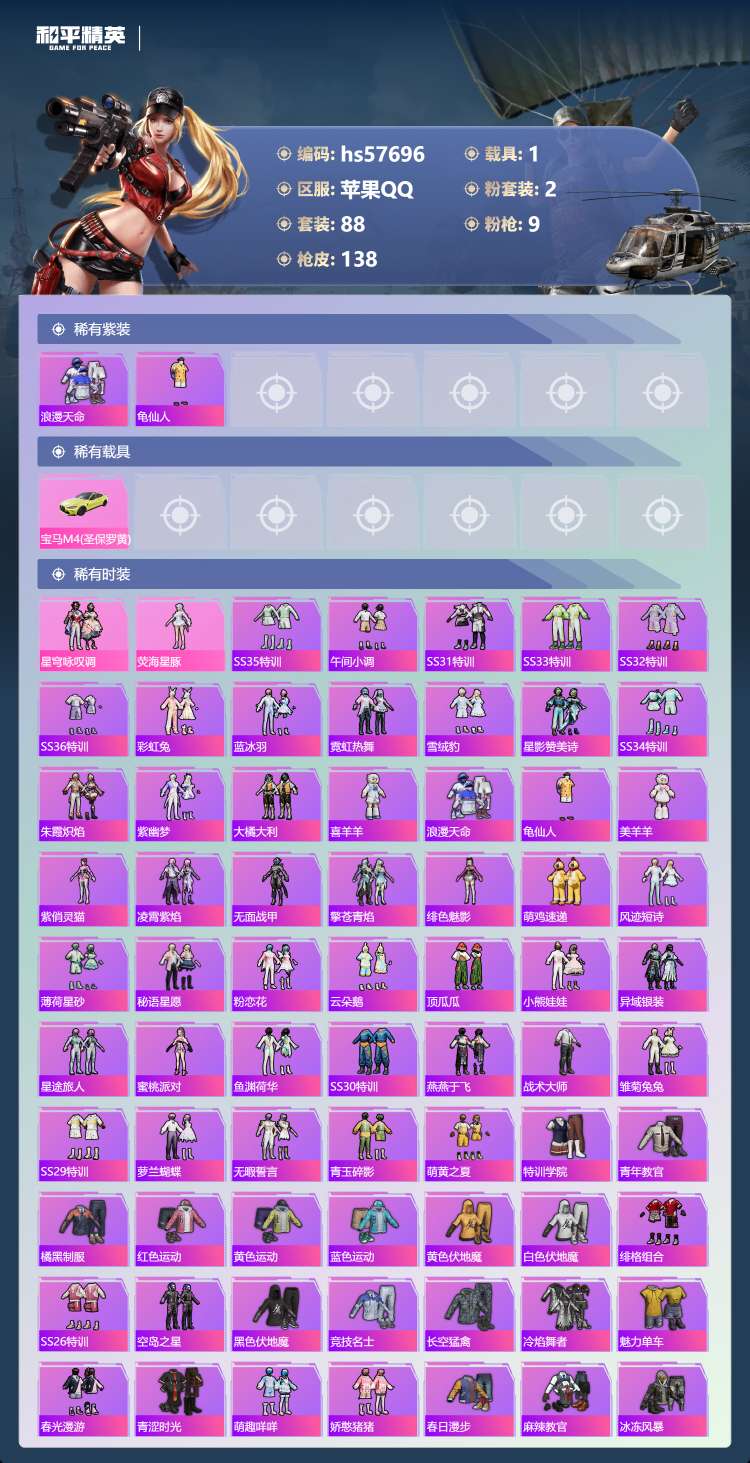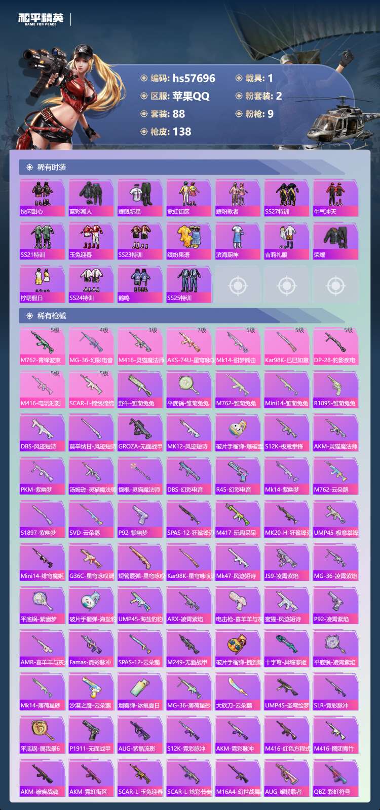 hs57696 苹果手Q-6王牌印记-2粉装-9特效枪-1载具-42443热力值-88套装-138枪