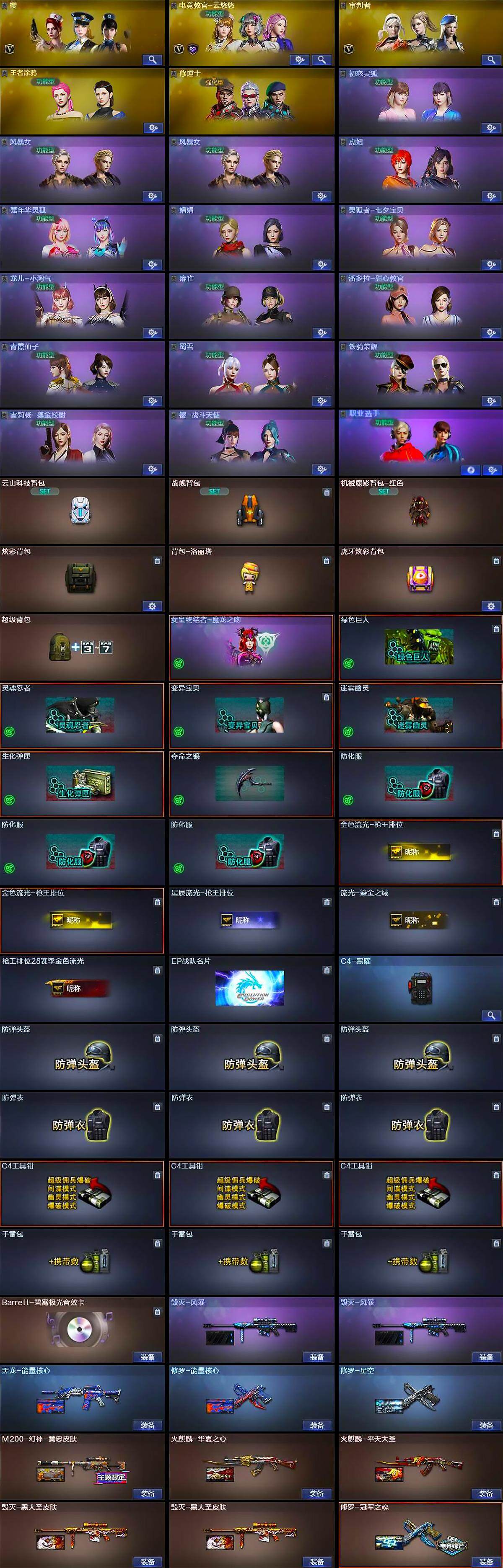 【皮肤】:M200-幻神-黄忠皮肤,火麒麟-华夏之心,火麒麟-平天大圣,毁灭-黑大圣皮肤*2,毁灭-风暴*2,黑龙-能量核心,修罗-能量核心,修罗-星空,修罗-冠军之魂