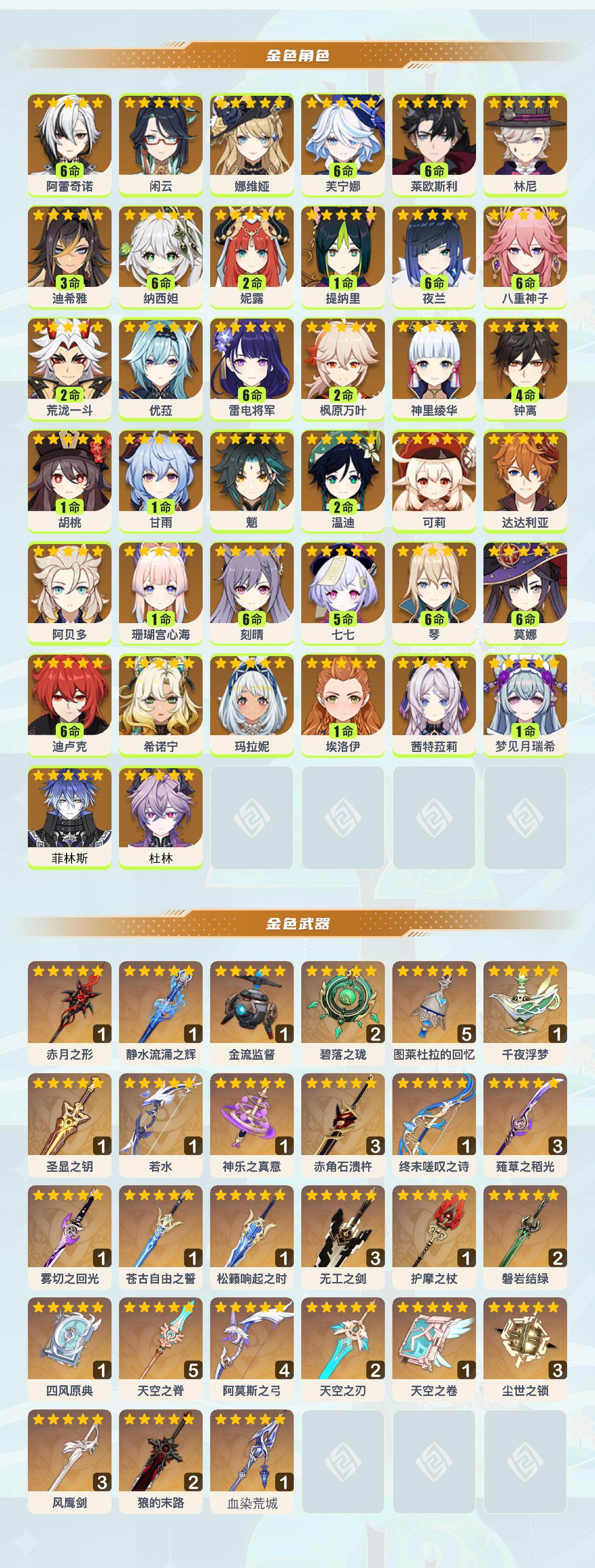 【YSF1541】60级/182黄/女主/38个五星角色/28个五星武器/满命芙宁娜/4命钟离/满命雷电将军/满命夜兰/满命阿蕾奇诺/希诺宁/娜维娅/2命荒泷一斗/阿贝多/闲云/2命枫原万叶/魈/2命温迪/满命琴/茜特菈莉/满命莱欧斯利/优菈/1命甘雨/5命七七/神里绫华/0命菲林斯/满命八重神子/满命刻晴/满命纳西妲/1命提纳里/玛拉妮/2命妮露/1命珊瑚宫心海/满命莫娜/达达利亚/0命杜林/林尼/1命胡桃/可莉/满命迪卢克/1命梦见月瑞希/0命埃洛伊/3命迪希雅/若水/终末嗟叹之诗/精4阿莫