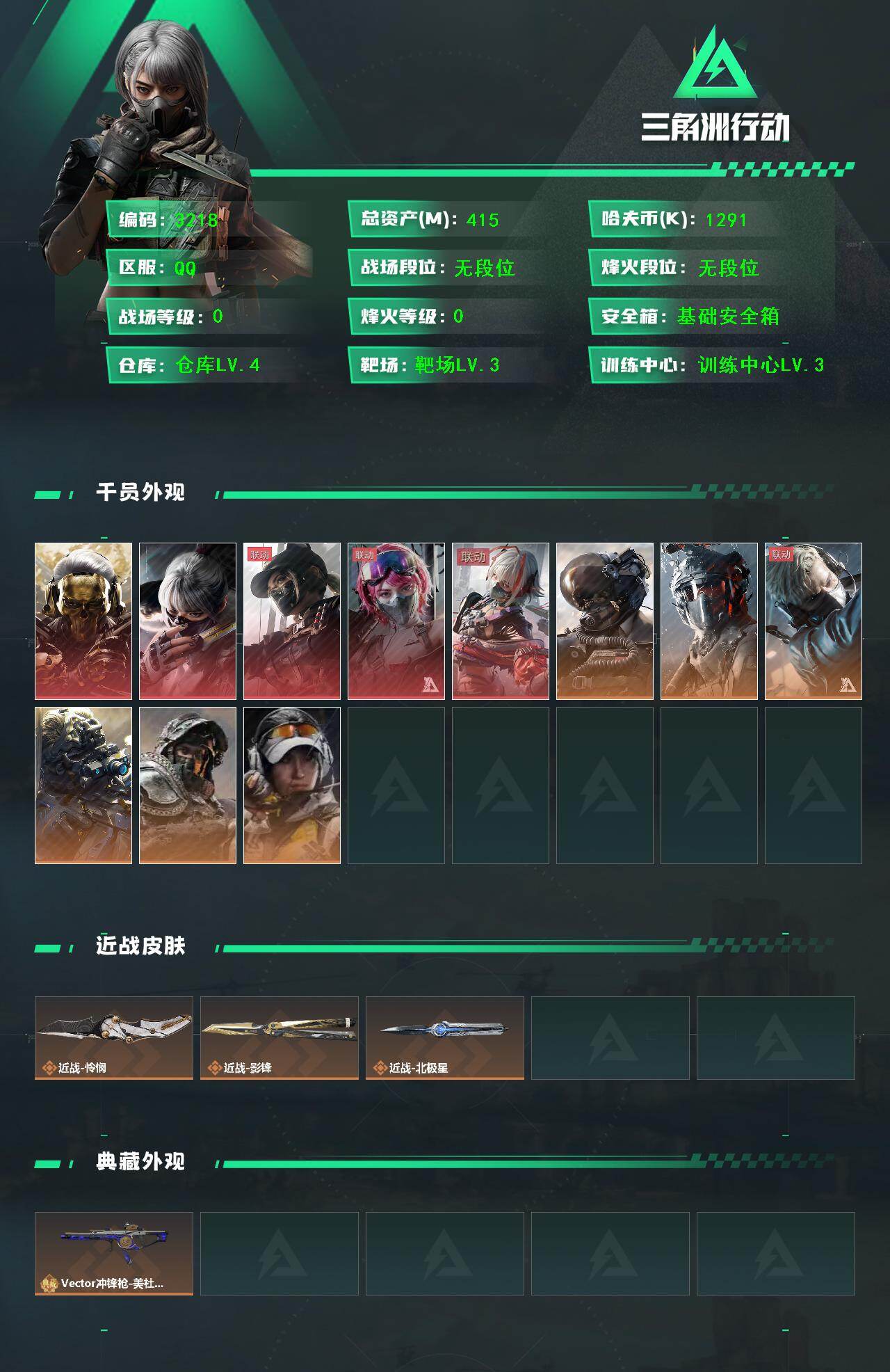 LJ4392总资产415.3M哈弗币1291K近战武器-怜悯,近战武器-影锋,近战武器-北极星红狼蚀金玫瑰,骇爪水墨云图,露娜黑天际线,骇爪维什戴尔,蛊能天使午夜邮差,威龙蛟龙特战队,无名夜鹰,蜂医送葬人无题密令,深蓝不破誓约,露娜金牌射手,威龙壮志凌云Vector冲锋枪-美杜莎(优品S)无AW子弹105发三角币558仓库LV.9S7顶级安全箱靶场LV.4训练中心LV.7无,红狼-蚀金玫瑰,骇爪