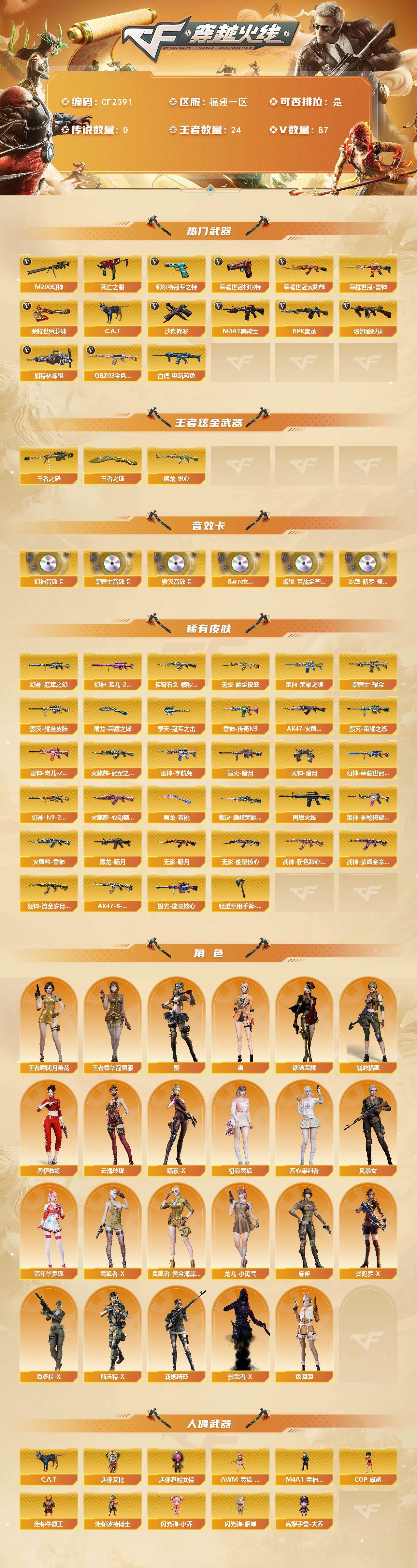 【CF2391】福建一区-87V-24王者-0炫金【双全号 QBZ03-金色蔷薇,M200-幻神,死亡之眼,荣耀世冠-火麒麟,荣耀世冠-雷神,白虎-电玩蓝兔,柯尔特-冠军之特,荣耀世冠-柯尔特,C.A.T,M4A1-黑骑士,汤姆逊-烈龙*5,RPK-盘龙*5,加特林-炼狱,沙鹰-修罗*3,荣耀世冠-龙啸*2】